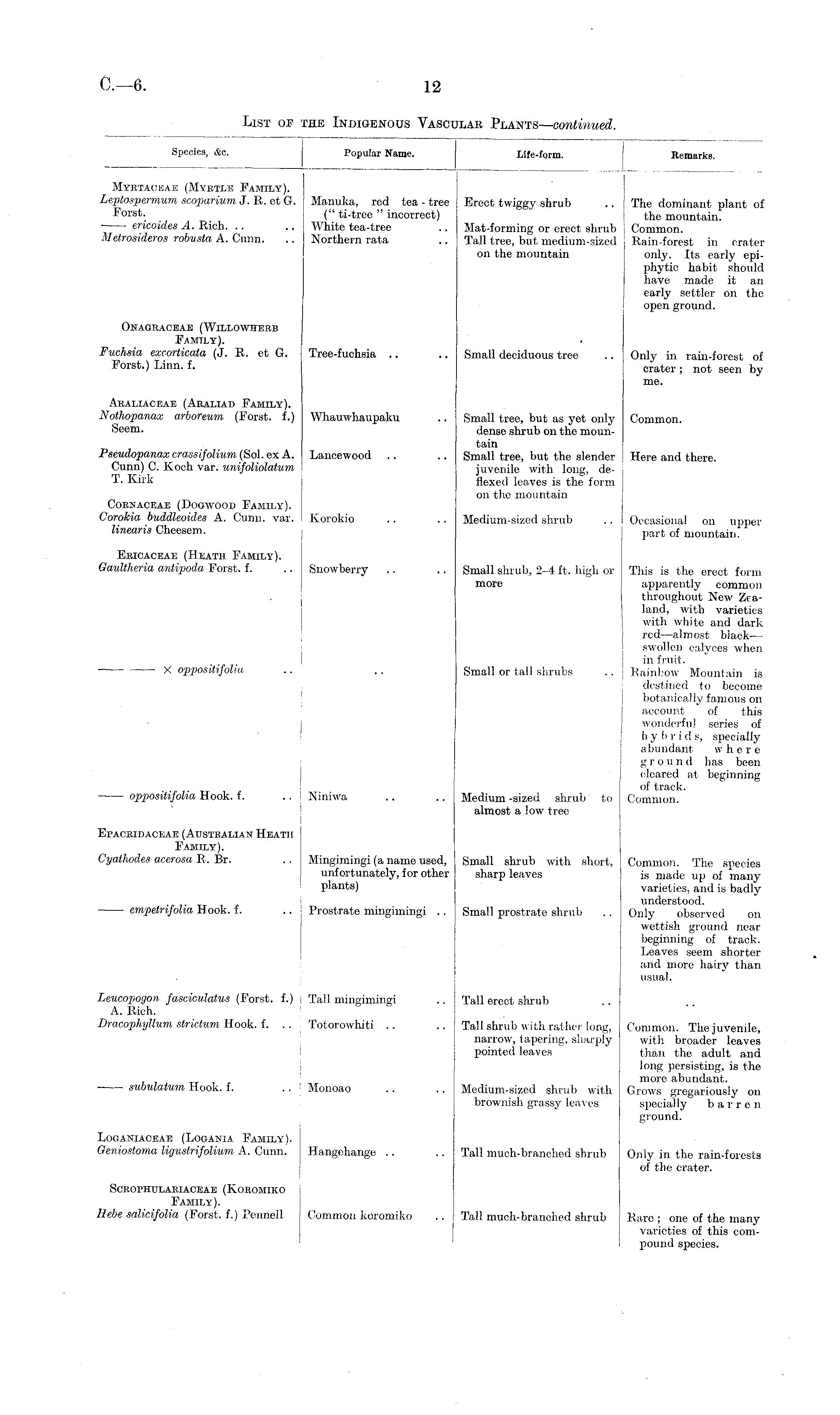 Species, &c. Popular Name. Life-form. | Remarks. Myetaoeae (Myrtle Family). Leptospermum scoparium J. R. et G. Manuka, red tea - tree Erect twiggy shrub .. The dominant plant of Eorst. (" ti-tree " incorrect) the mountain. - ericoides A. Rich. .. .. White tea-tree .. Mat-forming or erect shrub Common. Metrosideros robusta A. Cunn. .. Northern rata .. Tall tree, but medium-sized Rain-forest in crater on the mountain only. Its early epiphytic habit should have made it an early settler on the open ground. Onageaceae (Willowherb Family). Fuchsia excorticata (J. R. et G. Tree-fuchsia .. .. Small deciduous tree .. Only in rain-forest of Forst.) Linn. f. crater ; not seen by me. Araliaceae (Aealiad Family). Nothopanax arboreum (Forst. f.) Whauwhaupaku .. Small tree, but as yet only Common. Seem. dense shrub on the mountain Pseudopanax crassifolium (Sol. ex A. Lancewood .. .. Small tree, but the slender Here and there. Cunn) C. Koch var. unifoliolcMwtn juvenile with long, deT. Kirk flexed lea,ves is the form on the mountain CORMAOEAE (DOGWOOD FAMILY). Corokia buddleoides A. Cunn. var. Korokio .. .. Medium-sized shrub .. Occasional on upper linearis Cheesem. j part of mountain. Ericaceae (Heath Family). Gaultheria antipoda Forst. f. .. Snowberry .. .. Small shrub, 2-4 ft. high or This is the erect form more apparently common j throughout New Zealand, with varieties with white and dark j red —almost black— swollen calyces when ... I in fruit. " x oppositifolta .. ! .. Small or tall shrubs .. Rainbow Mountain is destined to become botanical ly famous on account of this | wonderful series of hybrids, specially abundant where ground has been cleared at beginning . . . ! of track. oppositifoha Hook. f. .. Niniwa .. .. Medium -sized shrub to Common. almost a low tree Epaceidaceae (Australian Heath Family). Gyathodes acerosa R. Br. .. Mingimingi (a name used, Small shrub with short, Common. The species unfortunately, for other sharp leaves is made up of many plants) varieties, and is badly I I understood. empetnfolia Hook. f. .. Prostrate mingimingi .. Small prostrate shrub .. Only observed on wettish ground near beginning of track. Leaves seem shorter and more hairy than I usual. Leucopogon fasciculatus (Forst. f.) i Tall mingimingi .. I Tall erect shrub A. Rich. Dracophyllum strictum Hook. f. .. Totorowhiti .. .. ! Tall shrub with rather long, Common. The juvenile, narrow, tapering, sharply with broader leaves pointed leaves than the adult and long persisting, is the more abundant. ' " subulatum Hook. f. . . Monoao .. .. Medium-sized shrub with Grows gregariously on brownish grassy leaves specially barren ground. Loganiaceae (Logania Family). Geniostoma ligustrifolkcm A. Cunn. I Hangehange .. .. Tall much-branched shrub Only in the rain-forests of the crater. Sceophulariaceae (Koromiko Family). Hebe salicifolia (Forst. f.) Pennell Common koromiko .. ; Tall much-branched shrub Rare; one of the many varieties of this compound species.