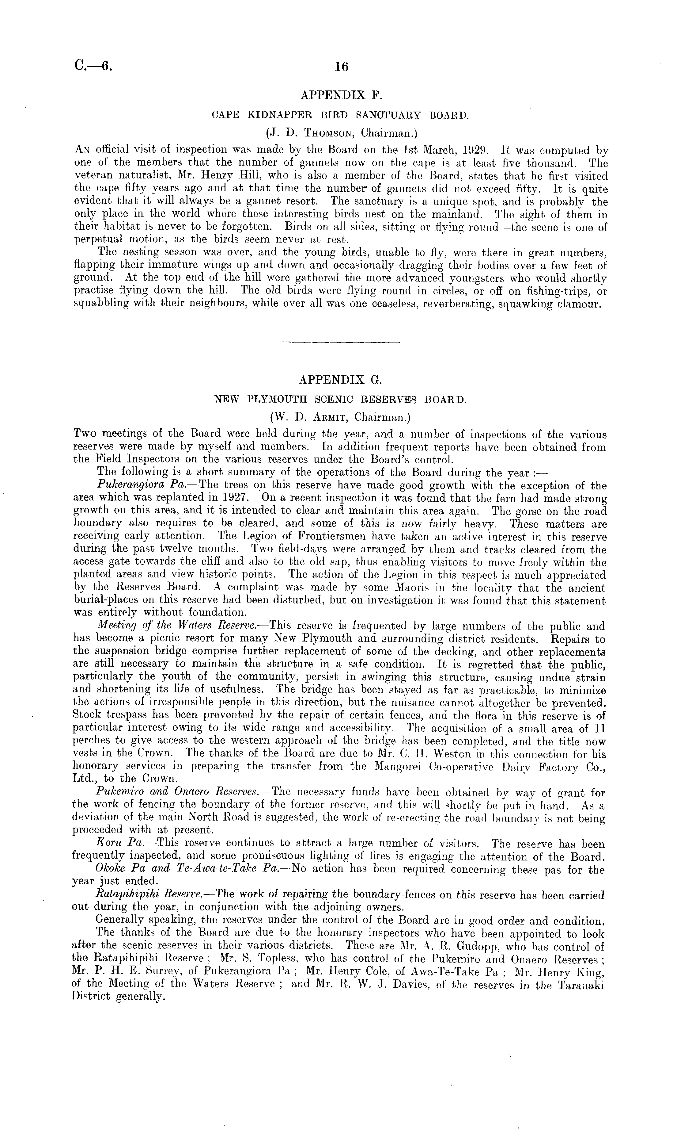 APPENDIX F. CAPE KIDNAPPER BIRD SANCTUARY BOARD. (J. D. Thomson, Chairman.) An official visit of inspection was made by the Board on the Ist March, 1929. It was computed by one of the members that the number of gannets now on the cape is at least five thousand. The veteran naturalist, Mr. Henry Hill, who is also a member of the Board, states that he first visited the cape fifty years ago and at that time the number of gannets did not exceed fifty. It is quite evident that it will always be a gannet resort. The sanctuary is a unique spot, and is probably the only place in the world where these interesting birds nest on the mainland. The sight of them in their habitat is never to be forgotten. Birds on all sides, sitting or flying round—the scene is one of perpetual motion, as the birds seem never at rest. The nesting season was over, and the young birds, unable to fly, were there in great numbers, flapping their immature wings up and down and occasionally dragging their bodies over a few feet of ground. At the top end of the hill were gathered the more advanced youngsters who would shortly practise flying down the hill. The old birds were flying round in circles, or off on fishing-trips, or squabbling with their neighbours, while over all was one ceaseless, reverberating, squawking clamour.