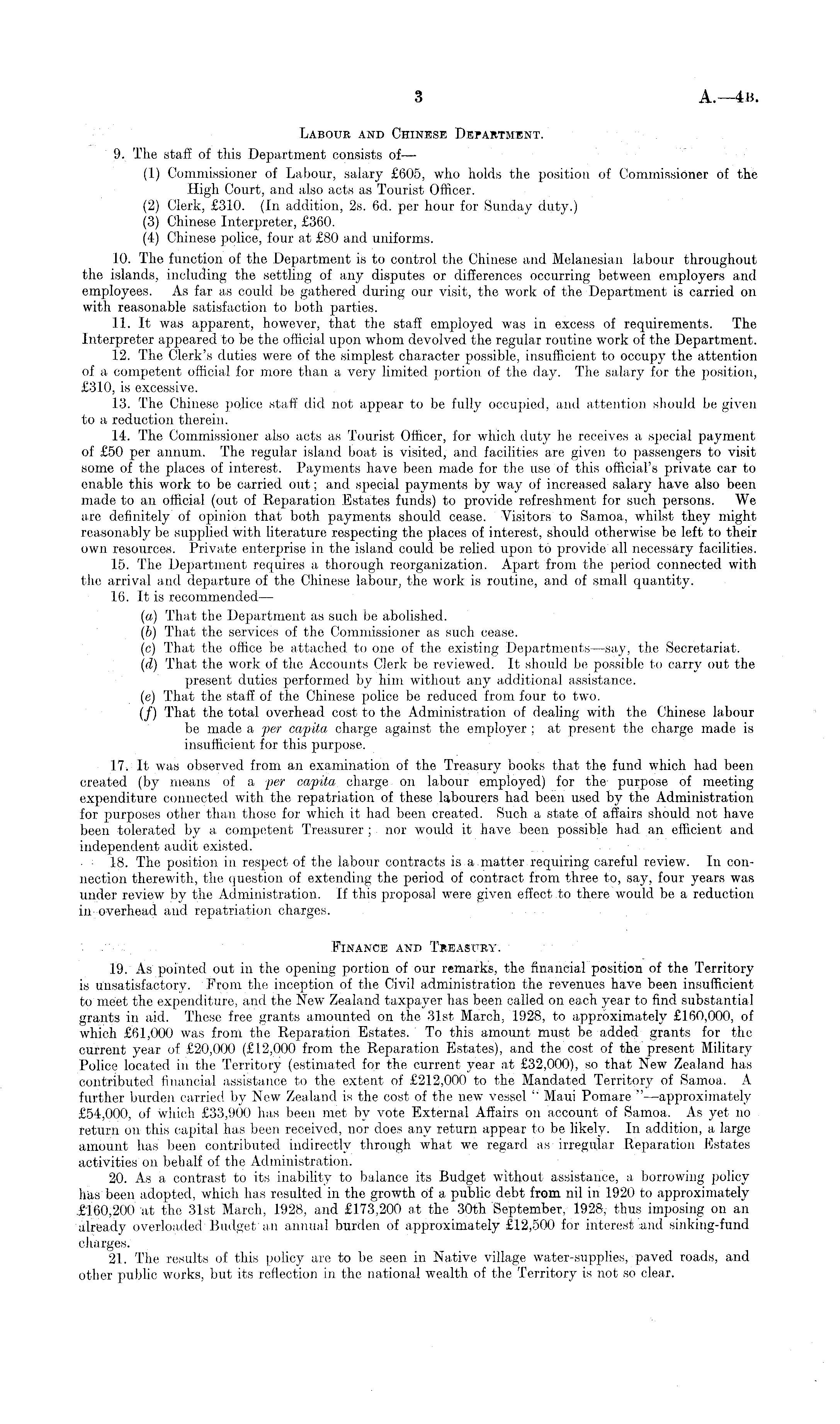 Labour and Chinese Department. 9. The staff of this Department consists of — (1) Commissioner of Labour, salary £605, who holds the position of Commissioner of the High Court, and also acts as Tourist Officer. (2) Clerk, £310. (In addition, 2s. 6d. per hour for Sunday duty.) (3) Chinese Interpreter, £360. (4) Chinese police, four at £80 and uniforms. 10. The function of the Department is to control the Chinese and Melanesian labour throughout the islands, including the settling of any disputes or differences occurring between employers and employees. As far as could be gathered during our visit, the work of the Department is carried on with reasonable satisfaction to both parties. 11. It was apparent, however, that the staff employed was in excess of requirements. The Interpreter appeared to be the official upon whom devolved the regular routine work of the Department. 12. The Clerk's duties were of the simplest character possible, insufficient to occupy the attention of a competent official for more than a very limited portion of the day. The salary for the position, £310, is excessive. 13. The Chinese police staff did not appear to be fully occupied, and attention should be given to a reduction therein. 14. The Commissioner also acts as Tourist Officer, for which duty he receives a special payment of £50 per annum. The regular island boat is visited, and facilities are given to passengers to visit some of the places of interest. Payments have been made for the use of this official's private car to enable this work to be carried out; and special payments by way of increased salary have also been made to an official (out of Reparation Estates funds) to provide refreshment for such persons. We are definitely of opinion that both payments should cease. Visitors to Samoa, whilst they might reasonably be supplied with literature respecting the places of interest, should otherwise be left to their own resources. Private enterprise in the island could be relied upon to provide all necessary facilities. 15. The Department requires a thorough reorganization. Apart from the period connected with the arrival and departure of the Chinese labour, the work is routine, and of small quantity. 16. It is recommended— (a) That the Department as such be abolished. (b) That the services of the Commissioner as such cease. (c) That the office be attached to one of the existing Departments —say, the Secretariat. (d) That the work of the Accounts Clerk be reviewed. It should be possible to carry out the present duties performed by him without any additional assistance. (e) That the staff of the Chinese police be reduced from four to two. (/) That the total overhead cost to the Administration of dealing with the Chinese labour be made a per capita, charge against the employer ; at present the charge made is insufficient for this purpose. \7. It was observed from an examination of the Treasury books that the fund which had been created (by means of a per capita charge on labour employed) for the purpose of meeting expenditure connected with the repatriation of these labourers had been used by the Administration for purposes other than those for which it had been created. Such a state of affairs should not have been tolerated by a competent Treasurer ; nor would it have been possible had an efficient and independent audit existed. 18. The position in respect of the labour contracts is a.matter requiring careful review. In connection therewith, the question of extending the period of contract from three to, say, four years was under review by the Administration. If this proposal were given effect to there would be a reduction in overhead and repatriation charges. Finance and Treasury. 19. As pointed out in the opening portion of our remarks, the financial position of the Territory is unsatisfactory. From the inception of the Civil administration the revenues have been insufficient to meet the expenditure, and the New Zealand taxpayer has been called on each year to find substantial grants in aid. These free grants amounted on the 31st March, 1928, to approximately £160,000, of which £61,000 was from the Reparation Estates. To this amount must be added grants for the current year of £20,000 (£12,000 from the Reparation Estates), and the cost of the present Military Police located in the Territory (estimated for the current year at £32,000), so that New Zealand has contributed financial assistance to the extent of £212,000 to the Mandated Territory of Samoa. A further burden carried by New Zealand is the cost of the new vessel " Maui Pomare " —approximately £54,000, of which £33,900 has been met by vote External Affairs on account of Samoa. As yet no return on this capital has been received, nor does any return appear to be likely. In addition, a large amount has been contributed indirectly through what we regard as irregular Reparation Estates activities'on behalf of the Administration. 20. As a contrast to its inability to balance its Budget without assistance, a borrowing policy has been adopted, which has resulted in the growth of a public debt from nil in 1920 to approximately .£"160,200 at the 31st March, 1928, and £173,200 at the 30th September, 1928, thus imposing oil an already overloaded Budget an annual burden of approximately £12,500 for interest and sinking-fund charges. 21. The results of this policy are to be seen in Native village water-supplies, paved roads, and other public works, but its reflection in the national wealth of the Territory is not so clear.