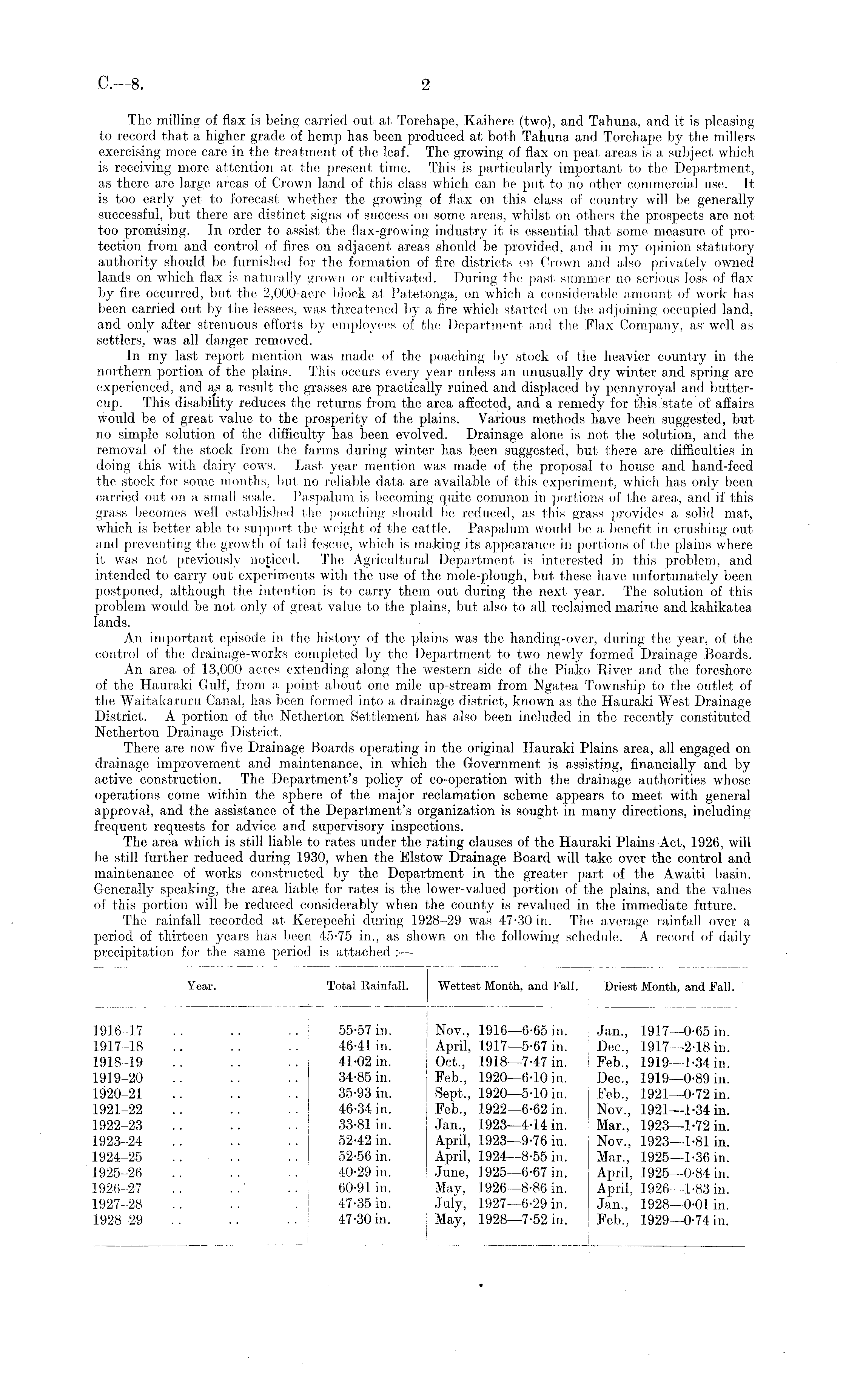 The milling of flax is being carried out at Torehape, Kaihere (two), and Tahuna, and it is pleasing to record that a higher grade of hemp has been produced at both Tahuna and Torehape by the millers exercising more care in the treatment of the leaf. The growing of flax on peat areas is a subject which is receiving more attention at the present time. This is particularly important to the Department, as there are large areas of Crown land of this class which can be put to no other commercial use. It is too early yet to forecast whether the growing of flax on this class of country will be generally successful, but there are distinct signs of success on some areas, whilst on others the prospects are not too promising. In order to assist the flax-growing industry it is essential that some measure of protection from and control of fires on adjacent areas should be provided, and in my opinion statutory authority should be furnished for the formation of fire districts on Crown and also privately owned lands on which flax is naturally grown or cultivated. During the past summer no serious loss of flax by fire occurred, but the 2,000-acre block at Patetonga, on which a considerable amount of work has been carried out by the lessees, was threatened by a fire which started on the adjoining occupied land, and only after strenuous efforts by employees of the Department and the Flax Company, as' well as settlers, was all danger removed. In my last report mention was made of the poaching by stock of the heavier country in the northern portion of the plains. This occurs every year unless an unusually dry winter and spring are experienced, and as a result the grasses are practically ruined and displaced by pennyroyal and buttercup. This disability reduces the returns from the area affected, and a remedy for I his state of affairs vfould be of great value to the prosperity of the plains. Various methods have been suggested, but no simple solution of the difficulty has been evolved. Drainage alone is not the solution, and the removal of the stock from the farms during winter has been suggested, but there are difficulties in doing this with dairy cows. Last year mention was made of the proposal to house and hand-feed the stock for some months, but no reliable data are available of this experiment, which has only been carried out on a small scale. Paspalum is becoming quite common in portions of the area, and if this grass becomes well established the poaching should be reduced, as this grass provides a solid mat, which is better able to support the weight of the cattle. Paspalum would be a benefit in crushing out and preventing the growth of tall fescue, which is making its appearance in portions of the plains where it was not previously noticed. The Agricultural Department is interested in this problem, and intended to carry out experiments with the use of the mole-plough, but these have unfortunately been postponed, although the intention is to carry them out during the next year. The solution of this problem would be not only of great value to the plains, but also to all reclaimed marine and kahikatea lands. An important episode in the history of the plains was the handing-over, during the year, of the control of the drainage-works completed by the Department to two newly formed Drainage Boards. An area of 13,000 acres extending along the western side of the Piako River and the foreshore of the Hauraki Gulf, from a point about one mile up-stream from Ngatea Township to the outlet of the Waitakaruru Canal, has been formed into a drainage district, known as the Hauraki West Drainage District. A portion of the Netherton Settlement has also been included in the recently constituted Netherton Drainage District. There are now five Drainage Boards operating in the original Hauraki Plains area, all engaged on drainage improvement and maintenance, in which the Government is assisting, financially and by active construction. The Department's policy of co-operation with the drainage authorities whose operations come within the sphere of the major reclamation scheme appears to meet with general approval, and the assistance of the Department's organization is sought in many directions, including frequent requests for advice and supervisory inspections. The area which is still liable to rates under the rating clauses of the Hauraki Plains Act, 1926, will be still further reduced during 1930, when the Elstow Drainage Board will take over the control and maintenance of works constructed by the Department in the greater part of the Awaiti basin. Generally speaking, the area liable for rates is the lower-valued portion of the plains, and the values of this portion will be reduced considerably when the county is revalued in the immediate future. The rainfall recorded at Kerepeehi during 1928-29 was 47-30 in. The average rainfall over a period of thirteen years has been 45-75 in., as shown on the following schedule. A record of daily precipitation for the same period is attached :—
