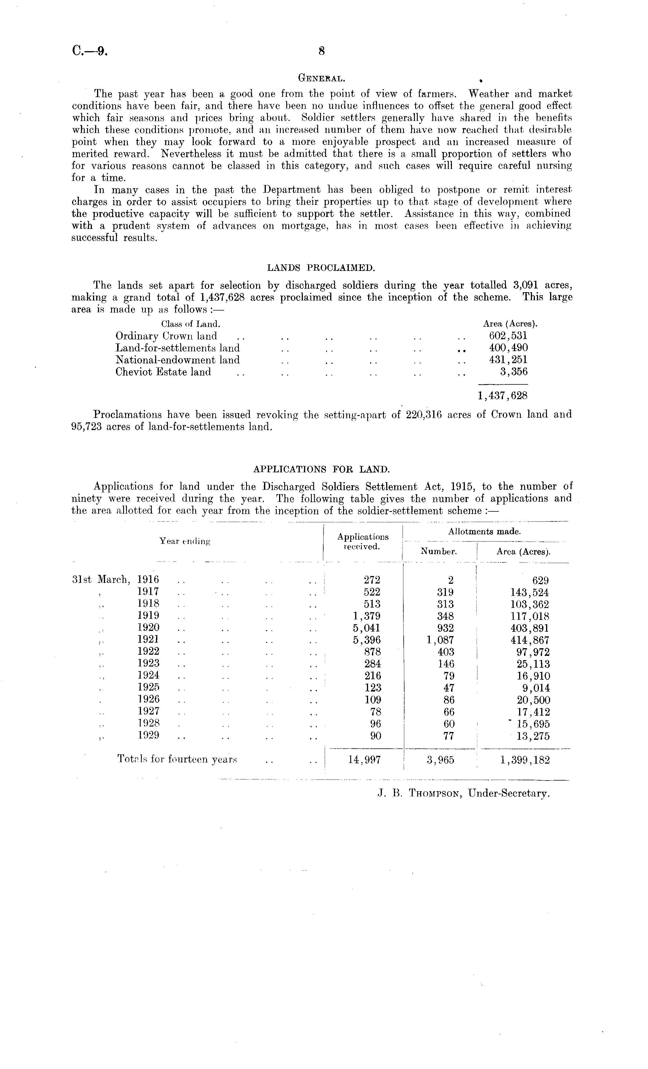 . .. Allotments made. Year ending Applications ,eceive • Number. j Area (Acres). ' I 31st March, 1916 . . . . . . 272 2 629 1917 .. 522 319 143,524 1918 . .. 513 313 103,362 1919 1,379 348 117,018 1920 .. .. .. 5,041 932 403,891 1921 .. .. .. 5,396 1,087 414,867 1922 878 403 97,972 1923 .. .. 284 146 25,113 1924 .. .. .. 216 79 16,910 1925 .. 123 47 9,014 1926 .. 109 86 20,500 1927 .. 78 66 17,412 1928 .. .. 96 60 "15,695 1929 .. .. .. .. 90 77 13,275 Totals for fourteen years, .. .. 14,997 3,965 1,399,182