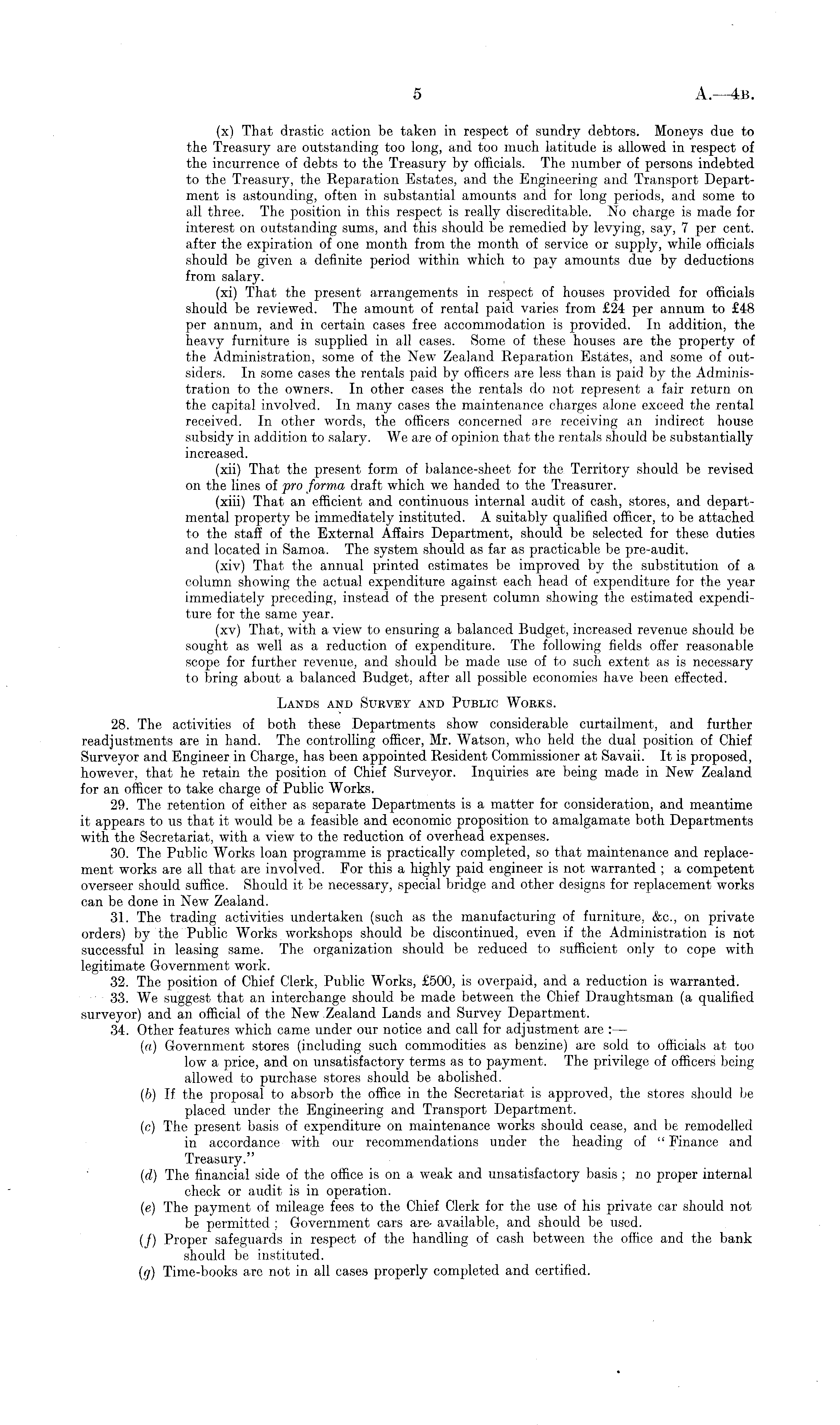 (x) That drastic action be taken in respect of sundry debtors. Moneys due to the Treasury are outstanding too long, and too much latitude is allowed in respect of the incurrence of debts to the Treasury by officials. The number of persons indebted to the Treasury, the Reparation Estates, and the Engineering and Transport Department is astounding, often in substantial amounts and for long periods, and some to all three. The position in this respect is really discreditable. No charge is made for interest on outstanding sums, and this should be remedied by levying, say, 7 per cent, after the expiration of one month from the month of service or supply, while officials should be given a definite period within which to pay amounts due by deductions from salary. (xi) That the present arrangements in respect of houses provided for officials should be reviewed. The amount of rental paid varies from £24 per annum to £48 per annum, and in certain cases free accommodation is provided. In addition, the heavy furniture is supplied in all cases. Some of these houses are the property of the Administration, some of the New Zealand Reparation Estates, and some of outsiders. In some cases the rentals paid by officers are less than is paid by the Administration to the owners. In other cases the rentals do not represent a fair return on the capital involved. In many cases the maintenance charges alone exceed the rental received. In other words, the officers concerned are receiving an indirect house subsidy in addition to salary. We are of opinion that the rentals should be substantially increased. (xii) That the present form of balance-sheet for the Territory should be revised on the lines of pro forma draft which we handed to the Treasurer. (xiii) That an efficient and continuous internal audit of cash, stores, and departmental property be immediately instituted. A suitably qualified officer, to be attached to the staff of the External Affairs Department, should be selected for these duties and located in Samoa. The system should as far as practicable be pre-audit. (xiv) That the annual printed estimates be improved by the substitution of a column showing the actual expenditure against each head of expenditure for the year immediately preceding, instead of the present column showing the estimated expenditure for the same year. (xv) That, with a view to ensuring a balanced Budget, increased revenue should be sought as well as a reduction of expenditure. The following fields offer reasonable scope for further revenue, and should be made use of to such extent as is necessary to bring about a balanced Budget, after all possible economies have been effected. Lands and Survey and Public Works. 28. The activities of both these Departments show considerable curtailment, and further readjustments are in hand. The controlling officer, Mr. Watson, who held the dual position of Chief Surveyor and Engineer in Charge, has been appointed Resident Commissioner at Savaii. It is proposed, however, that he retain the position of Chief Surveyor. Inquiries are being made in New Zealand for an officer to take charge of Public Works. 29. The retention of either as separate Departments is a matter for consideration, and meantime it appears to us that it would be a feasible and economic proposition to amalgamate both Departments with the Secretariat, with a view to the reduction of overhead expenses. 30. The Public Works loan programme is practically completed, so that maintenance and replacement works are all that are involved. For this a highly paid engineer is not warranted ; a competent overseer should suffice. Should it be necessary, special bridge and other designs for replacement works can be done in New Zealand. 31. The trading activities undertaken (such as the manufacturing of furniture, &c., on private orders) by the Public Works workshops should be discontinued, even if the Administration is not successful in leasing same. The organization should be reduced to sufficient only to cope with legitimate Government work. 32. The position of Chief Clerk, Public Works, £500, is overpaid, and a reduction is warranted. 33. We suggest that an interchange should be made between the Chief Draughtsman (a qualified surveyor) and an official of the New Zealand Lands and Survey Department. 34. Other features which came under our notice and call for adjustment are : — (a) Government stores (including such commodities as benzine) are sold to officials at too low a price, and on unsatisfactory terms as to payment. The privilege of officers being allowed to purchase stores should be abolished. (b) If the proposal to absorb the office in the Secretariat is approved, the stores should be placed under the Engineering and Transport Department. (e) The present basis of expenditure on maintenance works should cease, and be remodelled in accordance with our recommendations under the heading of "Finance and Treasury." (d) The financial side of the office is on a weak and unsatisfactory basis; no proper internal check or audit is in operation. (e) The payment of mileage fees to the Chief Clerk for the use of his private car should not be permitted ; Government cars are- available, and should be used. (/) Proper safeguards in respect of the handling of cash between the office and the bank should be instituted. {<]) Time-books are not in all cases properly completed and certified.