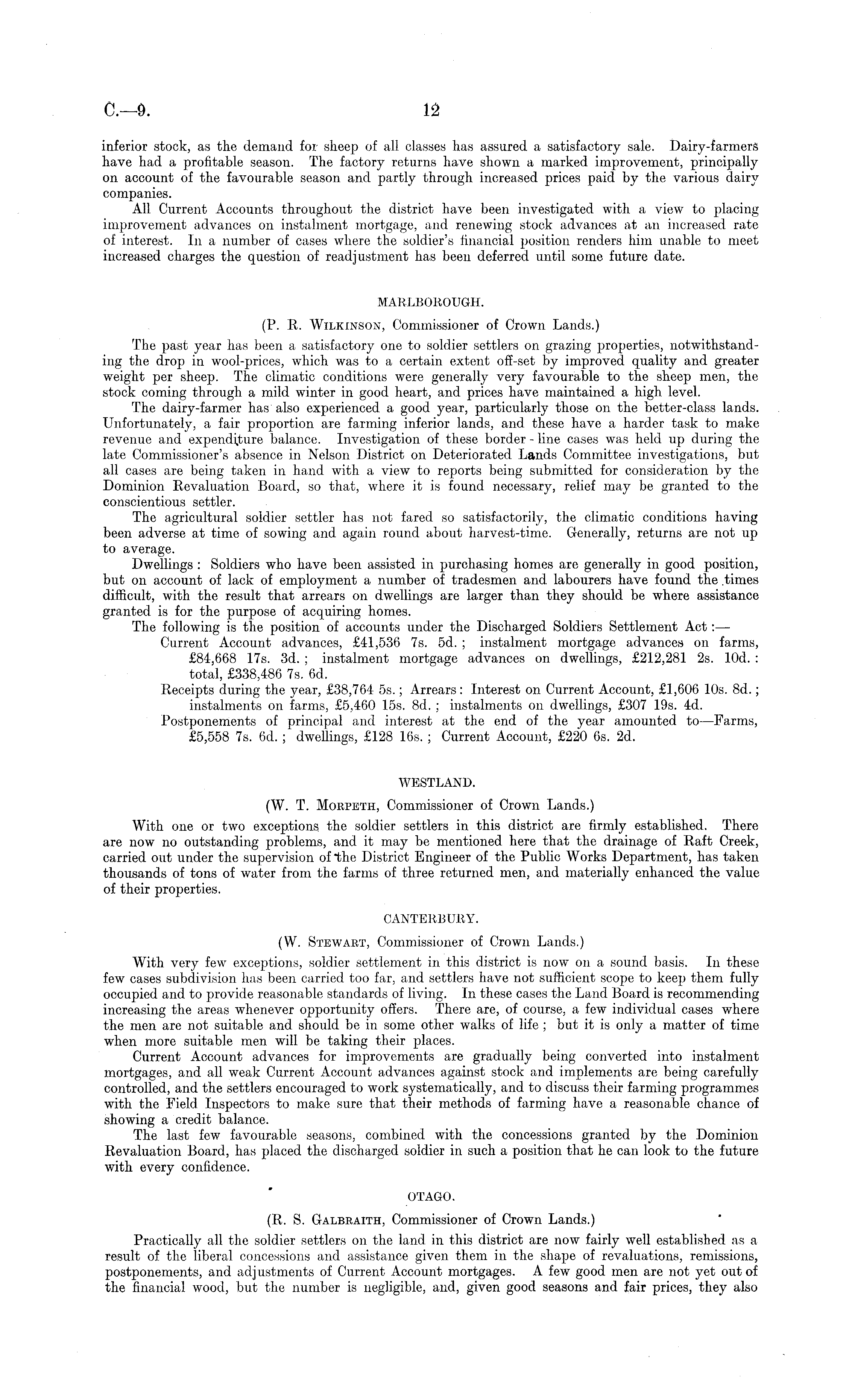 inferior stock, as the demand for sheep of all classes has assured a satisfactory sale. Dairy-farmers have had a profitable season. The factory returns have shown a marked improvement, principally on account of the favourable season and partly through increased prices paid by the various dairy companies. All Current Accounts throughout the district have been investigated with a view to placing improvement advances on instalment mortgage, and renewing stock advances at an increased rate of interest. In a number of cases where the soldier's financial position renders him unable to meet increased charges the question of readjustment has been deferred until some future date. MARLBOROUGH. (P. R, Wilkinson, Commissioner of Crown Lands.) The past year has been a satisfactory one to soldier settlers on grazing properties, notwithstanding the drop in wool-prices, which was to a certain extent off-set by improved quality and greater weight per sheep. The climatic conditions were generally very favourable to the sheep men, the stock coming through a mild winter in good heart, and prices have maintained a high level. The dairy-farmer has also experienced a good year, particularly those on the better-class lands. Unfortunately, a fair proportion are farming inferior lands, and these have a harder task to make revenue and expenditure balance. Investigation of these border - line cases was held up during the late Commissioner's absence in Nelson District on Deteriorated Lands Committee investigations, but all cases are being taken in hand with a view to reports being submitted for consideration by the Dominion Revaluation Board, so that, where it is found necessary, relief may be granted to the conscientious settler. The agricultural soldier settler has not fared so satisfactorily, the climatic conditions having been adverse at time of sowing and again round about harvest-time. Generally, returns are not up to average. Dwellings : Soldiers who have been assisted in purchasing homes are generally in good position, but on account of lack of employment a number of tradesmen and labourers have found the times difficult, with the result that arrears on dwellings are larger than they should be where assistance granted is for the purpose of acquiring homes. The following is the position of accounts under the Discharged Soldiers Settlement Act: — Current Account advances, £41,536 7s. sd. ; instalment mortgage advances on farms, £84,668 17s. 3d. ; instalment mortgage advances on dwellings, £212,281 2s. lOd. : total, £338,486 7s. 6d. Receipts during the year, £38,764 55.; Arrears: Interest on Current Account, £1,606 10s. Bd.; instalments on farms, £5,460 15s. Bd. ; instalments on dwellings, £307 19s. 4d. Postponements of principal and interest at the end of the year amounted to —Farms, £5,558 7s. 6d. ; dwellings, £128 16s. ; Current Account, £220 6s. 2d. AVESTLAND. (W. T. Moepetii, Commissioner of Crown Lands.) With one or two exceptions the soldier settlers in this district are firmly established. There are now no outstanding problems, and it may be mentioned here that the drainage of Raft Creek, carried out under the supervision of "the District Engineer of the Public Works Department, has taken thousands of tons of water from the farms of three returned men, and materially enhanced the value of their properties. CANTERBURY. (W. Stewart, Commissioner of Crown Lands.) With very few exceptions, soldier settlement in this district is now on a sound basis. In these few cases subdivision has been carried too far, and settlers have not sufficient scope to keep them fully occupied and to provide reasonable standards of living. In these cases the Land Board is recommending increasing the areas whenever opportunity offers. There are, of course, a few individual cases where the men are not suitable and should be in some other walks of life ; but it is only a matter of time when more suitable men will be taking their places. Current Account advances for improvements are gradually being converted into instalment mortgages, and all weak Current Account advances against stock and implements are being carefully controlled, and the settlers encouraged to work systematically, and to discuss their farming programmes with the Field Inspectors to make sure that their methods of farming have a reasonable chance of showing a credit balance. The last few favourable seasons, combined with the concessions granted by the Dominion Revaluation Board, has placed the discharged soldier in such a position that he can look to the future with every confidence. OTAGO. (R. S. Galbraith, Commissioner of Crown Lands.) Practically all the soldier settlers on the land in this district are now fairly well established as a result of the liberal concessions and assistance given them in the shape of revaluations, remissions, postponements, and adjustments of Current Account mortgages. A few good men are not yet out of the financial wood, but the number is negligible, and, given good seasons and fair prices, they also