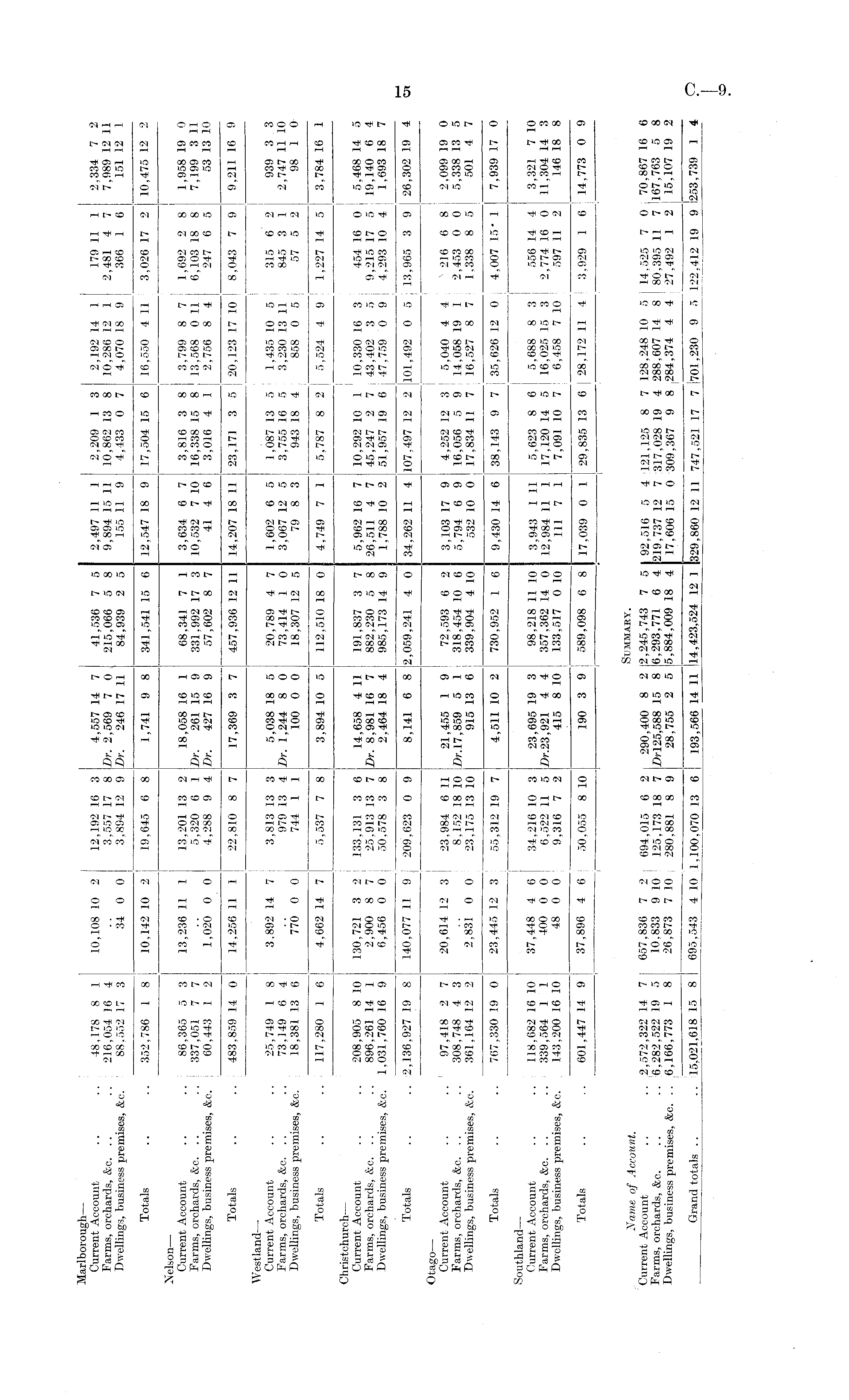 Marlborough — Current Account .. .. 48,178 8 1 10,108 10 2 12,192 16 3 4,557 14 7 41,536 7 5 2,497 11 1 2,209 1 3 2,192 14 1 179 11 1 2,334 7 2 Farms, orchards, &c. .. .. 216,054 16 4 .. 3,557 17 8 Dr. 2,569 7 0 215,066 5 8 9,894 15 11 10,862 13 8 10,286 12 1 2,481 4 7 7,989 12 11 Dwellings, business premises, &c. 88,552 17 3 34 0 0 3,894 12 9 Dr. 246 17 11 84,939 2 5 155 11 9 4,433 0 7 4,070 18 9 366 1 6 151 12 1 Totals .. .. 352,786 1 8 10,142 10 2 19,645 6 8 1,741 9 8 341,541 15 6 12,547 18 9 17,504 15 6 16,550 4 11 3,026 17 2 10,475 12 2 Nelson — Current Account .. .. 86,365 5 3 13,236 11 1 13,201 13 2 18,058 16 1 68,341 7 1 3,634 6 7 3,816 3 8 3,799 8 7 1,692 2 8 1,958 19 0 Farms, orchards, fee. .. .. 337,051 7 7 .. 5,320 6 1 Dr. 261 15 9 331,992 17 3 10,532 7 10 16,338 15 8 13,568 0 11 6,103 18 8 7,199 3 11 Dwellings, business premises, &c. 60,443 1 2 1,020 0 0 4,288 9 4 Dr. 427 16 9 57,602 8 7 41 4 6 3,016 4 1 2,756 8 4 247 6 5 53 13 10 Totals .. .. 483,859 14 0 14,256 11 1 22,810 8 7 17,369 3 7 457,936 12 11 14,207 18 11 23,171 3 5 | 20,123 17 10 8,043 7 9 9,211 16 9 Westland — Current Account .. .. 25,749 1 8 3,892 14 7 3,813 13 3 5,038 18 5 20,789 4 7 1,602 6 5 1,087 13 5 1,435 10 5 315 6 2 939 3 3 Farms, orchards, &c. .. .. 73,149 6 4 .. 979 13 4 Dr. 1,244 8 0 73,414 1 0 3,067 12 5 3,755 16 5 3,230 13 11 845 3 1 2,747 11 10 Dwellings, business premises, &c. 18,381 13 6 770 0 0 744 1 1 100 0 0 18,307 12 5 79 8 3 943 18 4 858 0 5 57 5 2 98 1 0 Totals .. .. 117,280 1 6 4,662 14 7 5,537 7 8 3,894 10 5 112,510 18 0 4,749 7 1 5,787 8 2 5,524 4 9 ; 1,227 14 5 3,784 16 1 Christchurch — Current Account .. .. 208,905 8 10 130,721 3 2 133,131 3 6 14,658 4 11 191,837 3 7 5,962 16 7 10,292 10 1 10,330 16 3 454 16 0 5,468 14 5 Farms, orchards, &c. .. .. 896,261 14 1 2,900 8 7 25,913 13 7 Dr. 8,981 16 7 882,230 5 8 26,511 4 7 45,247 2 7 43,402 3 5 9,215 17 5 19,140 6 4 Dwellings, business premises, &c. 1,031,760 16 9 6,456 0 0 50,578 3 8 2,464 18 4 985,173 14 9 1,788 10 2 51,957 19 6 47,759 0 9 4,293 10 4 1,693 18 7 Totals .. .. 2,136,927 19 8 140,077 11 9 209,623 0 9 8,141 6 8 2,059,241 4 0 34,262 11 4 107,497 12 2 101,492 0 5 13,965 3 9 26,302 19 4 Otago — Current Account .. .. 97,418 2 7 20,614 12 3 ' 23.984 6 11 21,455 1 9 72,593 6 2 3,103 17 9 4,252 12 3 ! 5,040 4 4 v 216 6 8 2,099 19 0 Farms, orchards, &c. .. .. 308,748 4 3 .. 8,152 18 10 Dr.17,859 5 1 318,454 10 6 5,794 6 9 16,056 5 9 I 14,058 19 1 2,453 0 0 5,338 13 5 Dwellings, business premises, &c. 361.164 12 2 2,831 0 0 23,175 13 10 915 13 6 339,904 4 10 532 10 0 17,834 11 7 16,527 8 7 1,338 8 5 501 4 7 Totals .. .. 767,330 19 0 23,445 12 3 55,312 19 7 4,511 10 2 730,952 1 6 9,430 14 6 38,143 9 7 i 35,626 12 0 4,007 15* 1 7,939 17 0 Southland — Current Account .. .. 118.682 16 10 37,448 4 6 34,216 10 3 23,695 19 3 98,218 11 10 3,943 1 11 5,623 8 6 i 5,688 8 3 ' 556 14 4 3,321 7 10 Farms, orchards, &c. .. .. 339,564 1 1 400 0 0 6,522 11 5 Dr.23,921 4 4 357,362 14 0 12,984 11 1 17,120 14 5 16,025 15 3 1 2,774 16 0 11.304 14 3 Dwellings, business premises, &e. 143,200 16 10 48 0 0 9,316 7 2 415 8 10 133,517 0 10 111 7 1 7,091 10 7 6,458 7 10 597 11 2 146 18 8 Totals .. .. 601,447 14 9 37,896 4 6 | 50,055 8 10 190 3 9 589,098 6 8 17,039 0 1 29,835 13 6 | 28,172 11 4 3,929 1 6 14,773 0 9 , ■ - j - I . ! : , ■ — Name of Account. Summaky. Current Account ' .. .. 2,572,322 14 7 657,836 7 2: 694,015 6 2 290,400 8 2 2,245,743 7 5 92,516 5 4 121,125 8 7 128,248 10 5 j 14,525 7 0 70,867 16 6 Farms, orchards, &c. .. .. 6.282,522 19 5 10,833 9 10 125,173 18 7 Z»rl25,588 15 8 6,293,771 6 4 219,737 12 7 317,028 19 4 288,607 14 8 80,395 11 7 167,763 5 8 Dwellings, business premises, &c. .. 6,166,773 1 8 26,873 7 10 280,881 8 9 28,755 2 5 5,884,009 18 4 17,606 15 0 309,367 9 8 4 4 27,492 1 2 15,107 19 2 Grand totals .. .. 15,021.618 15 8 695,543 4 10 1,100,070 13 6 193,566 14 11 14,423,524 12 1 329,860 12 11 747,521 17 7 |701,230 9 5 122,412 19 9 253,739 1 4