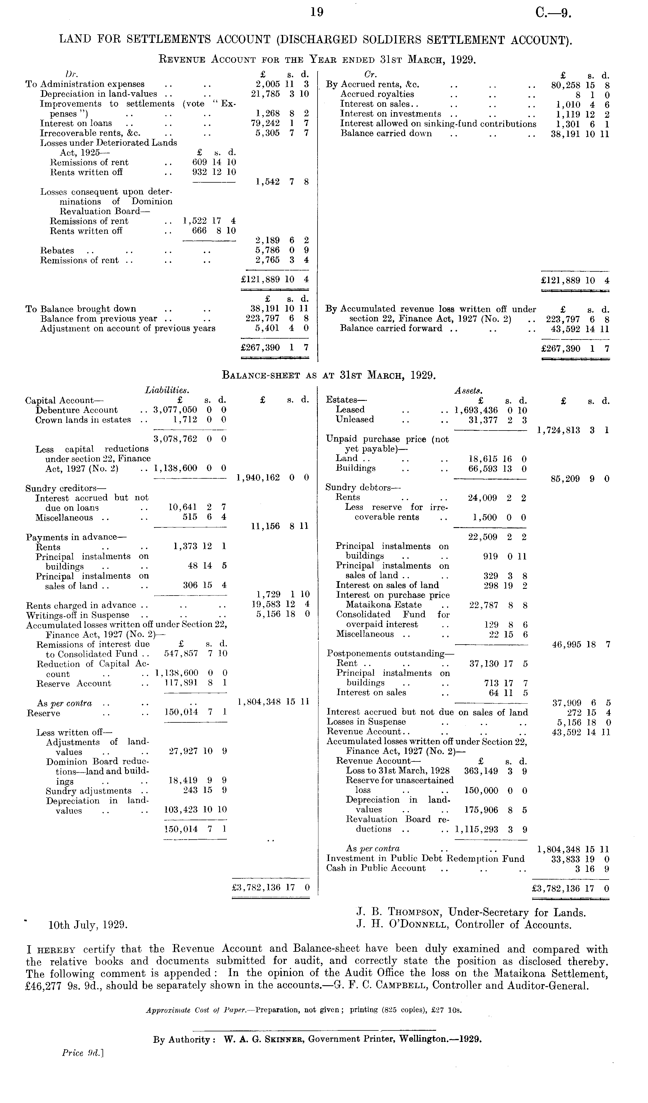 LAND FOR SETTLEMENTS ACCOUNT (DISCHARGED SOLDIERS SETTLEMENT ACCOUNT). Revenue Account fob the Year ended 31st March, 1929. Dr. £ s. d. Gr. £ s . d. To Administration expenses .. .. 2,005 11 3 By Accrued rents, &c. .. .. .. 80,258 15 8 Depreciation in land-values .. .. 21,785 3 10 Accrued royalties .. .. .. 8 10 improvements to settlements (vote "Ex- Interest on sales.. .. .. .. 1,010 4 6 penses") .. .. .. 1,268 8 2 Interest on investments .. .. .. 1,119 12 2 Interest on loans .. .. .. 79,242 1 7 Interest allowed on sinking-fund contributions 1,301 6 1 Irrecoverable rents, &c. .. .. 5,305 7 7 Balance carried down .. .. .. 38,191 10 11 Losses under Deteriorated Lands Act, 1925— £ s. d. Remissions of rent .. 609 14 10 Rents written off .. 932 12 10 1,542 7 8 Losses consequent upon determinations of Dominion Revaluation Board — Remissions of rent .. 1,522 17 4 Rents written off .. 666 8 10 2,189 6 2 Rebates .. .. .. .. 5,786 0 9 Remissions of rent .. .. .. 2,765 3 4 £121,889 10 4 £121,889 10 4 £ s. d. To Balance brought down .. .. 38,191 10 11 By Accumulated revenue loss written off under £ s. d. Balance from previous year .. .. 223,797 6 8 section 22, Finance Act, 1927 (No. 2) .. 223,797 6 8 Adjustment on account of previous years 5,401 4 0 Balance carried forward .. .. .. 43,592 14 11 £267,390 1 7 £267,390 1 7 Balance-sheet as at 31st March, 1929. Liabilities. Assets. Capital Account — £ s. d. £ s. d. Estates — £ s. d. £ s. d. Debenture Account .. 3,077,050 0 0 Leased .. .. 1,693,436 0 10 Crown lands in estates .. 1,712 0 0 Unleased .. .. 31,377 2 3 ——— 1,724,813 3 1 3,078,762 0 0 Unpaid purchase price (not Less capital reductions yet payable)— under section 22, Finance Land .. .. .. 18,615 16 0 Act, 1927 (No. 2) .. 1,138,600 0 0 Buildings .. .. 66,593 13 0 1,940,162 0 0 — 85,209 9 0 Sundry creditors — Sundry debtors — Interest accrued but not Rents .. .. 24,009 2 2 due on loans .. 10,641 2 7 Less reserve for irreMiscellaneous .. .. 515 6 4 coverable rents .. 1,500 0 0 11,156 8 11 Payments in advance — 22,509 2 2 Rents .. •• 1,373 12 1 Principal instalments on Principal instalments on buildings .. .. 919 011 buildings .. ■ ■ 48 14 5 Principal instalments on Principal instalments on sales of land .. . . 329 3 8 sales of land .. .. 306 15 4 Interest on sales of land 298 19 2 1,729 1 10 Interest on purchase price Rents charged in advance .. .. .. 19,583 12 4 Mataikona Estate .. 22,787 8 8 Writings-off in Suspense .. .. .. 5,156 18 0 Consolidated Fund for Accumulated losses written off under Section 22, overpaid interest .. 129 8 6 Finance Act, 1927 (No. 2) — Miscellaneous .. .. 22 15 6 Remissions of interest due £ s. d. 46,995 18 7 to Consolidated Fund .. 547,857 7 10 Postponements outstandingReduction of Capital Ac- Rent .. .. .. 37,130 17 5 count .. •• 1,138,600 0 0 Principal instalments on Reserve Account .. 117,891 8 1 buildings .. .. 713 17 7 Interest on sales .. 64 11 5 As per contra ■■ 1,804,348 15 II -— 37,909 6 5 Reserve .. •• 150,014 7 I Interest accrued but not due on sales of land 272 15 4 Losses in Suspense .. .. .. 5,156 18 0 Less written off — Revenue Account.. .. .. .. 43,592 14 11 Adjustments of land- Accumulated losses written off under Section 22, values .. .. 27,927 10 9 Finance Act, 1927 (No. 2)— Dominion Board reduc- Revenue Account — £ s. d. tions —land and build- Loss to 31st March, 1928 363,149 3 9 ings .. .. 18,419 9 9 Reserve for unascertained Sundry adjustments .. 243 15 9 loss .. . . 150,000 0 0 Depreciation in land- Depreciation in landvalues .. .. 103,423 10 10 values .. .. 175,906 8 5 Revaluation Board re--150,014 7 1 ductions .. .. 1,115,293 3 9 As per contra .. .. 1,804,348 15 11 Investment in Public Debt Redemption Fund 33,833 19 0 Cash in Public Account .. .. .. 316 9 £3,782,136 17 0 £3,782,136 17 0 J. B. Thompson, Under-Secretary for Lands. 10th July, 1929. J. H. O'Donnell, Controller of Accounts. I hereby certify that the Revenue Account and Balance-sheet have been duly examined and compared with the relative books and documents submitted for audit, and correctly state the position as disclosed thereby. The following comment is appended : In the opinion of the Audit Office the loss on the Mataikona Settlement, £46,277 9s. 9d., should be separately shown in the accounts. —G. F. C. Campbell, Controller and Auditor-General.