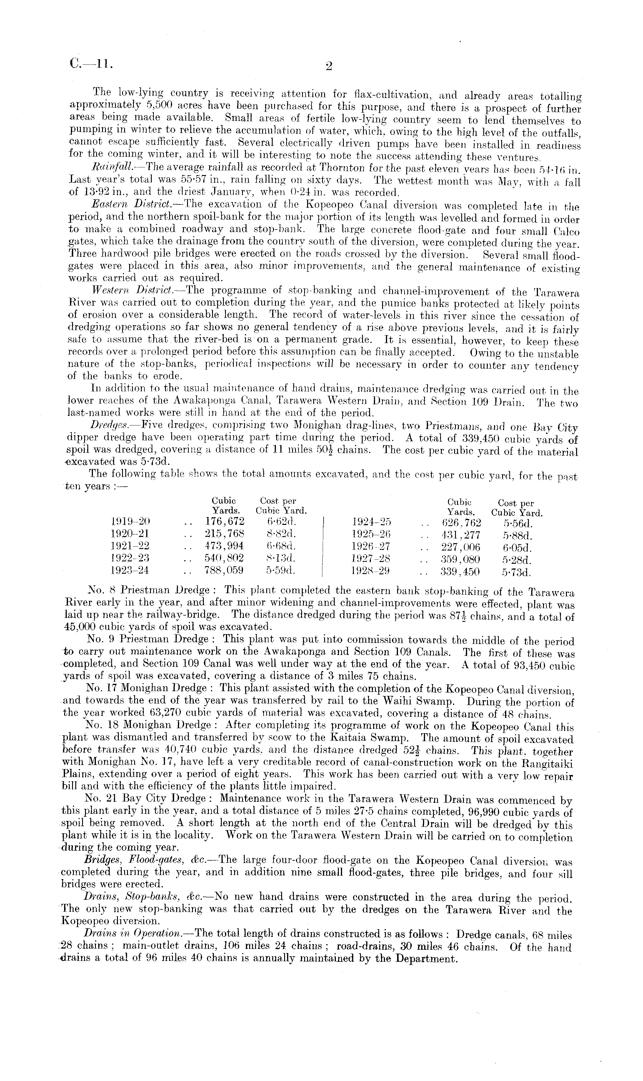 The low-lying country is receiving attention for flax-cultivation, and already areas totalling approximately 5,500 acres have been purchased for this purpose, and there is a prospect of further areas being made available. Small areas of fertile low-lying country seem to lend themselves to pumping in winter to relieve the accumulation of water, which, owing to the high level of the outfalls, cannot escape sufficiently fast. Several electrically driven pumps have been installed in readiness for the coming winter, and it will be interesting to note the success attending these ventures. Rainfall. —The average rainfall as recorded at Thornton for the past eleven years has been 54-16 in. Last year's total was 55-57 in., rain falling on sixty days. The wettest month was May, with a fall of 13-92 in., and the driest January, when 0-24 in. was recorded. Eastern District. —The excavation of the Kopeopeo Canal diversion was completed late in the period, and the northern spoil-bank for the major portion of its length was levelled and formed in order to make a combined roadway and stop-bank. The large concrete flood-gate and four small Calco ; ga,tes, which take the drainage from the country south of the diversion, were completed during the year. Three hardwood pile bridges were erected on the roads crossed by the diversion. Several small floodgates were placed in this area, also minor improvements, and the general maintenance of existing works carried out as required. Western District. —The programme of stop-banking and channel-improvement of the Tarawera River was carried out to completion during the year, and the pumice banks protected at likely points of erosion over a considerable length. The record of water-levels in this river since the cessation of ■dredging operations so far shows no general tendency of a, rise above previous levels, and it is fairly safe to assume that the river-bed is on a permanent grade. It is essential, however, to keep these records over a prolonged period before this assumption can be finally accepted. Owing to the unstable nature of the stop-banks, periodical inspections will be necessary in order to counter any tendency of the banks to erode. In addition to the usual maintenance of hand drains, maintenance dredging was carried out in the lower reaches of the Awakaponga Canal, Tarawera Western Drain, and Section 109 Drain. The two last-named works were still in hand at the end of the period. Dredges. —Five dredges, comprising two Monighan drag-lines, two Priestmans, and one Bay City dipper dredge have been operating part time during the period. A total of 339,450 cubic yards of spoil was dredged, covering a distance of 11 miles 50| chains. The cost per cubic yard of the material •excavated was 5-73 d. The following table shows the total amounts excavated, and the cost per cubic yard, for the pastten years : — Cubic Coat per Cubic Cost per Yards. Cubic Yard. Yards. Cubic Yard. 1919-20 .. 176,672 6-62 d. 1924-25 .. 626,762 5-56 d 1920-21 .. 215,768 8-82 d. 1925-26 .. 431,277 5-88 d 1921-22 .. 473,994 6-68 d. 1926-27 .. 227.006 6-05 d 1922-23 .. 540,802 8-13 d. 1927-28 .. 359,080 5-28 d 1923-24 .. 788,059 5-59 d. 1928-29 .. 339,450 5-73 d. No. 8 Priestman Dredge : This plant completed the eastern bank stop-banking of the Tarawera River early in the year, and after minor widening and channel-improvements were effected, plant was laid up near the railway-bridge. The distance dredged during the period was 87i chains, and a total of 45,000 cubic yards of spoil was excavated. No. 9 Priestman Dredge : This plant was put into commission towards the middle of the period to carry out maintenance work on the Awakaponga and Section 109 Canals. The first of these was completed, and Section 109 Canal was well under way at the end of the year. A total of 93,450 cubic yards of spoil was excavated, covering a distance of 3 miles 75 chains. No. 17 Monighan Dredge : This plant assisted with the completion of the Kopeopeo Canal diversion, and towards the end of the year was transferred by rail to the Waihi Swamp. During the portion of the year worked 63,270 cubic yards of material was excavated, covering a distance of 48 chains. No. 18 Monighan Dredge : After completing its programme of work on the Kopeopeo Canal this plant was dismantled and transferred by scow to the Kaitaia Swamp. The amount of spoil excavated before transfer was 40,740 cubic yards, and the distance dredged 52i chains. This plant, too-ether with Monighan No. 17, have left a very creditable record of canal-construction work on the Rangitaiki Plains, extending over a period of eight years. This work has been carried out with a very low repair bill and with the efficiency of the plants little impaired. No. 21 Bay City Dredge : Maintenance work in the Tarawera Western Drain was commenced by this plant early in the year, and a total distance of 5 miles 27-5 chains completed, 96,990 cubic yards of spoil being removed. A short length at the north end of the Central Drain will be dredged' by this plant while it is in the locality. Work on the Tarawera Western Drain will be carried on to completion during the coming year. Bridges, Flood-gates, &c.—The large four-door flood-gate on the Kopeopeo Canal diversion was completed during the year, and in addition nine small flood-gates, three pile bridges, and four sill bridges were erected. Drains, Stop-banks, dc. —No new hand drains were constructed in the area during the period. The only new stop-banking was that carried out by the dredges on the Tarawera River and the Kopeopeo diversion. Drains in Operation. —The total length of drains constructed is as follows : Dredge canals, 68 miles -28 chains ; main-outlet drains, 106 miles 24 chains ; road-drains, 30 miles 46 chains. Of the hand drains a total of 96 miles 40 chains is annually maintained by the Department.