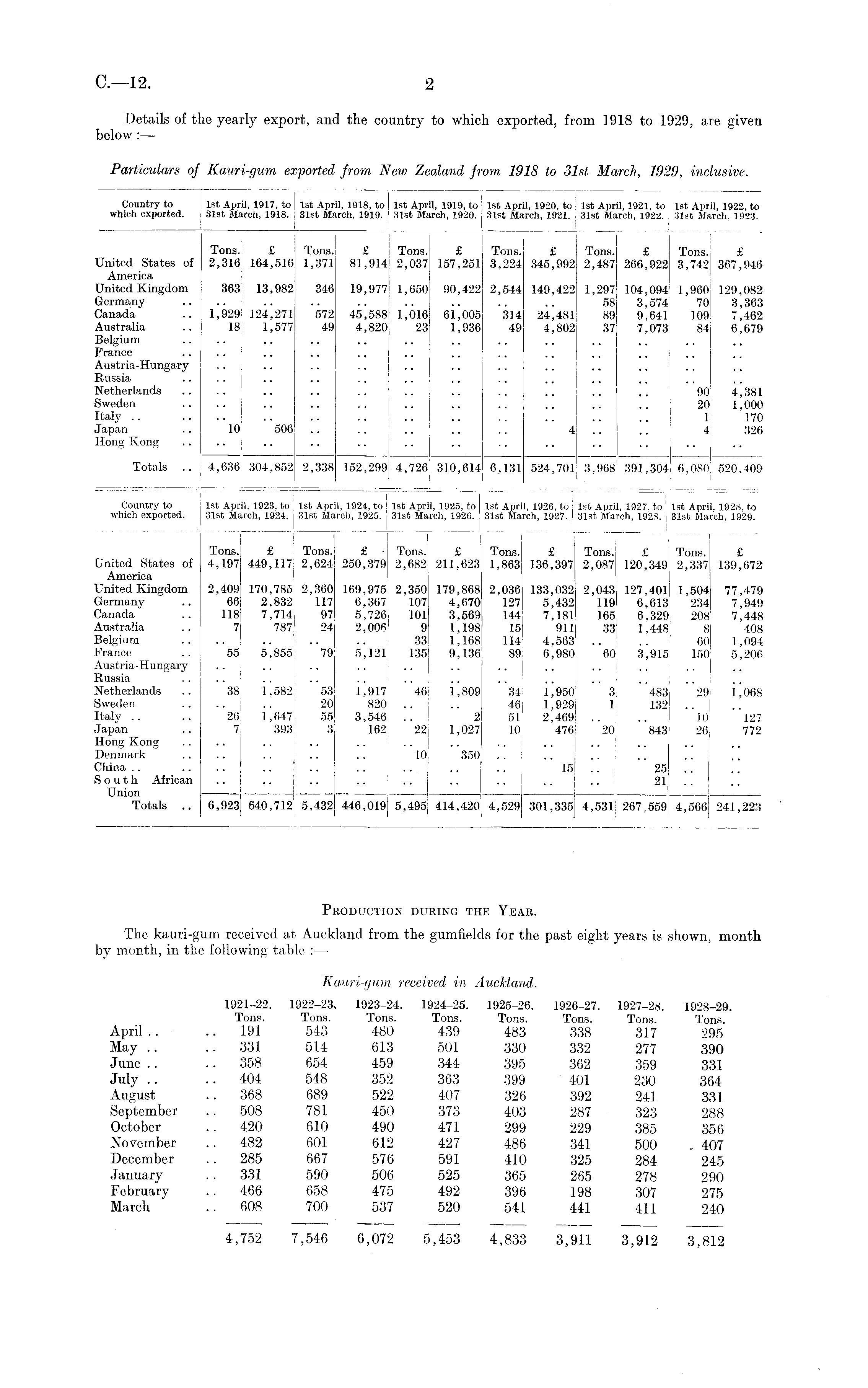 Particulars of Kauri-gum, exported from New Zealand from 1918 to 31st March, 1929, inclusive.