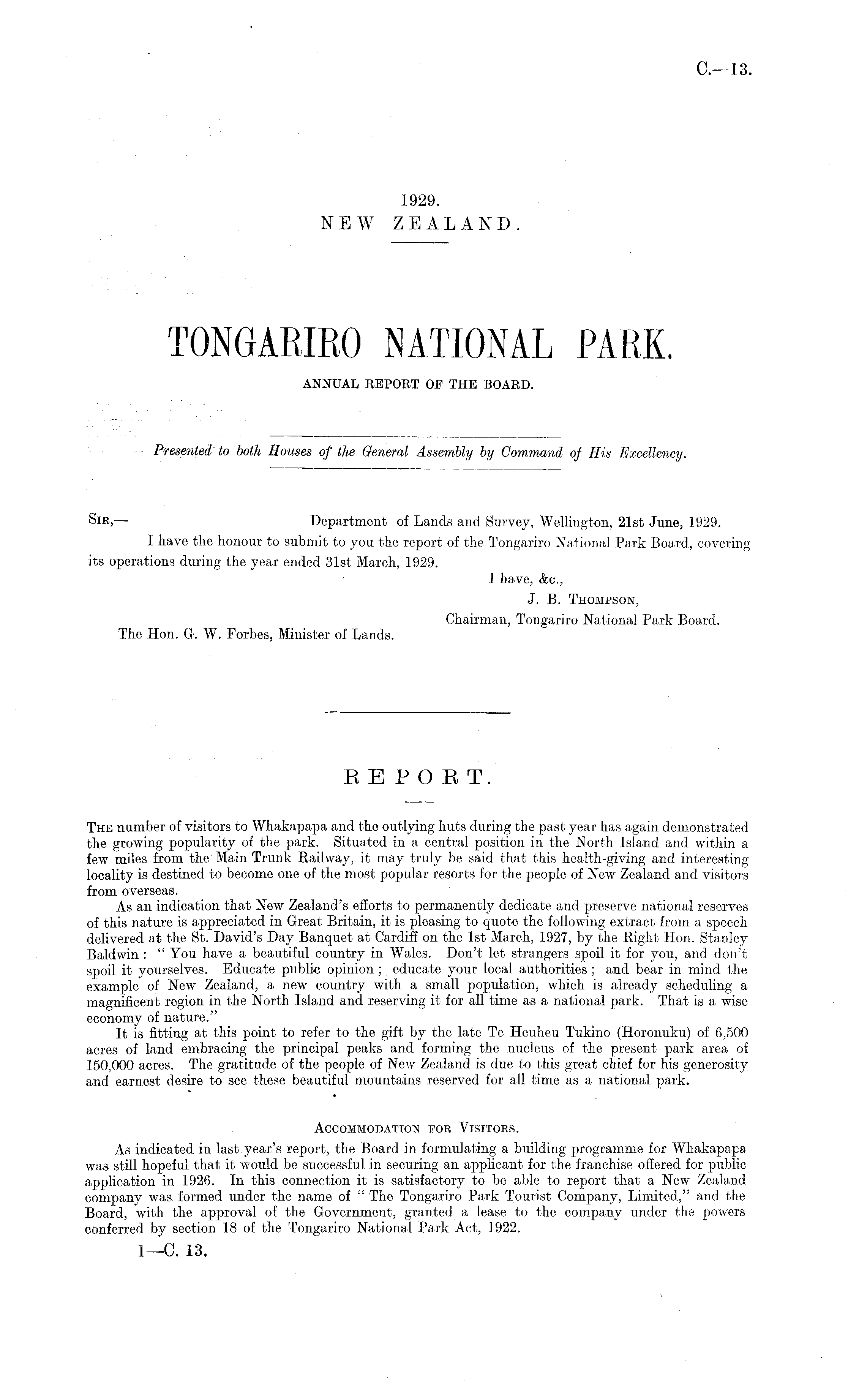 Sir, — Department of Lands and Survey, Wellington, 21st June, 1929. I have the honour to submit to you the report of the Tongariro National Park Board, covering its operations during the year ended 31st March, 1929. I have, &c., J. B. Thompson, Chairman, Tongariro National Park Board. The Hon. G. W. Forbes, Minister of Lands.