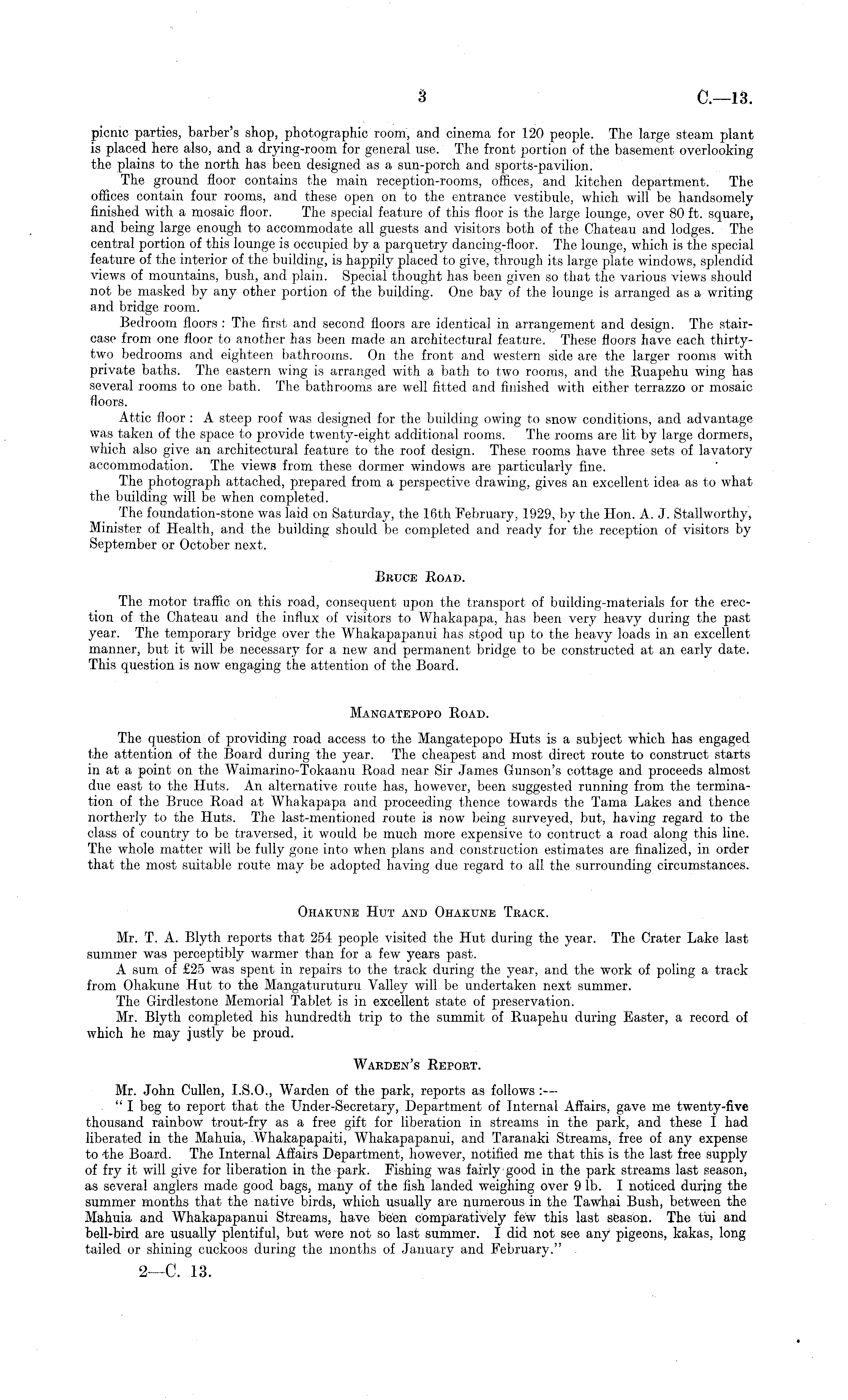 picnic parties, barber's shop, photographic room, and cinema for 120 people. The large steam plant is placed here also, and a drying-room for general use. The front portion of the basement overlooking the plains to the north has been designed as a sun-porch and sports-pavilion. The ground floor contains the main reception-rooms, offices, and kitchen department. The offices contain four rooms, and these open on to the entrance vestibule, which will be handsomely finished with a mosaic floor. The special feature of this floor is the large lounge, over 80 ft. square, and being large enough to accommodate all guests and visitors both of the Chateau and lodges. The central portion of this lounge is occupied by a parquetry dancing-floor. The lounge, which is the special feature of the interior of the building, is happily placed to give, through its large plate windows, splendid views of mountains, bush, and plain. Special thought has been given so that the various views should not be masked by any other portion of the building. One bay of the lounge is arranged as a writing and bridge room. Bedroom floors : The first and second floors are identical in arrangement and design. The staircase from one floor to another has been made an architectural feature. These floors have each thirtytwo bedrooms and eighteen bathrooms. On the front and western side are the larger rooms with private baths. The eastern wing is arranged with a bath to two rooms, and the Ruapehu wing has several rooms to one bath. The bathrooms are well fitted and finished with either terrazzo or mosaic floors. Attic floor : A steep roof was designed for the building owing to snow conditions, and advantage was taken of the space to provide twenty-eight additional rooms. The rooms are lit by large dormers, which also give an architectural feature to the roof design. These rooms have three sets of lavatory accommodation. The views from these dormer windows are particularly fine. The photograph attached, prepared from a perspective drawing, gives an excellent idea as to what the building will be when completed. The foundation-stone was laid on Saturday, the 16th February, 1929, by the Hon. A. J. Stallwort.hy, Minister of Health, and the building should be completed and ready for the reception of visitors by September or October next. Bruce Road. The motor traffic on this road, consequent upon the transport of building-materials for the erection of the Chateau and the influx of visitors to Whakapapa, has been very heavy during the past year. The temporary bridge over the Whakapapanui has stood up to the heavy loads in an excellent manner, but it will be necessary for a new and permanent bridge to be constructed at an early date. This question is now engaging the attention of the Board. Mangatepopo Road. The question of providing road access to the Mangatepopo Huts is a subject which has engaged the attention of the Board during the year. The cheapest and most direct route to construct starts in at a point on the Waimarino-Tokaanu Road near Sir James Gunson's cottage and proceeds almost due east to the Huts. An alternative route has, however, been suggested running from the termination of the Bruce Road at Whakapapa and proceeding thence towards the Tama Lakes and thence northerly to the Huts. The last-mentioned route is now being surveyed, but, having regard to the class of country to be traversed, it would be much more expensive to contract a road along this line. The whole matter will be fully gone into when plans and construction estimates are finalized, in order that the most suitable route may be adopted having due regard to all the surrounding circumstances. Ohakune Hut and Ohakune Track. Mr. T. A. Blyth reports that 254 people visited the Hut during the year. The Crater Lake last summer was perceptibly warmer than for a few years past. A sum of £25 was spent in repairs to the track during the year, and the work of poling a track from Ohakune Hut to the Mangaturuturu Valley will be undertaken next summer. The Girdlestone Memorial Tablet is in excellent state of preservation. Mr. Blyth completed his hundredth trip to the summit of Ruapehu during Easter, a record of which he may justly be proud. Warden's Report. Mr. John Cullen, 1.5.0., Warden of the park, reports as follows :— " I beg to report that the Under-Secretary, Department of Internal Affairs, gave me twenty-five thousand rainbow trout-fry as a free gift for liberation in streams in the park, and these I had liberated in the Mahuia, Whakapapaiti, Whakapapanui, and Taranaki Streams, free of any expense to 'the Board. The Internal Affairs D&partment, however, notified me that this is the last free supply of fry it will give for liberation in the park. Fishing was fairly good in the park streams last season, as several anglers made good bags, many of the fish landed weighing over 9 lb. I noticed during the summer months that the native birds, which usually are numerous in the Tawhai Bush, between the Mahuia and Whakapapanui Streams, have been comparatively few this last sfeason. The tui and bell-bird are usually plentiful, but were not so last summer. I did not see any pigeons, kakas, long tailed or shining cuckoos during the months of January and February."