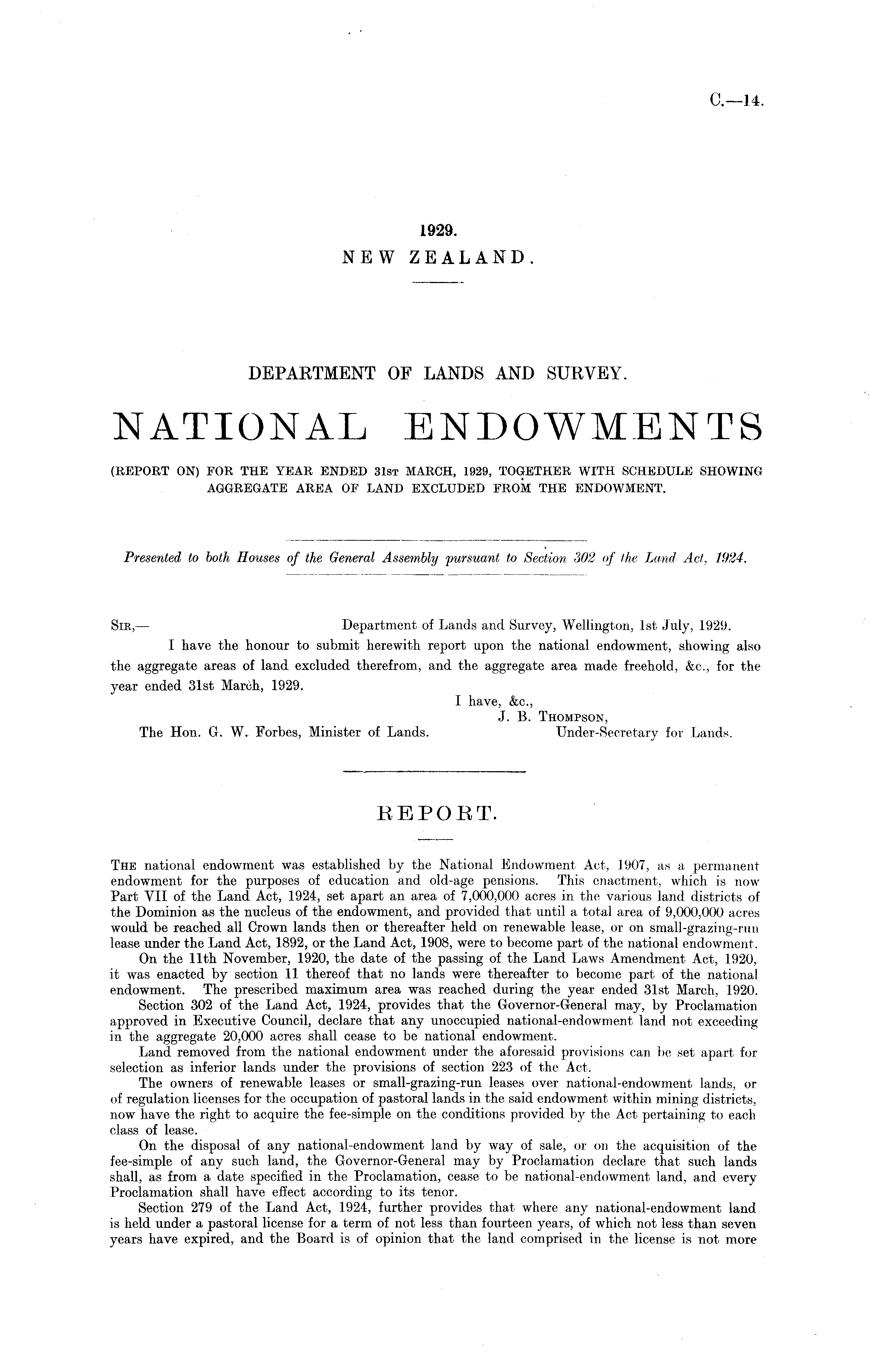 Sir, — Department of Lands and Survey, Wellington, Ist July, 1929. I have the honour to submit herewith report upon the national endowment, showing also the aggregate areas of land excluded therefrom, and the aggregate area made freehold, &c., for the year ended 31st March, 1929. I have, &c., J. B. Thompson, The Hon. G. W. Forbes, Minister of Lands. Under-Secretary for Lands.