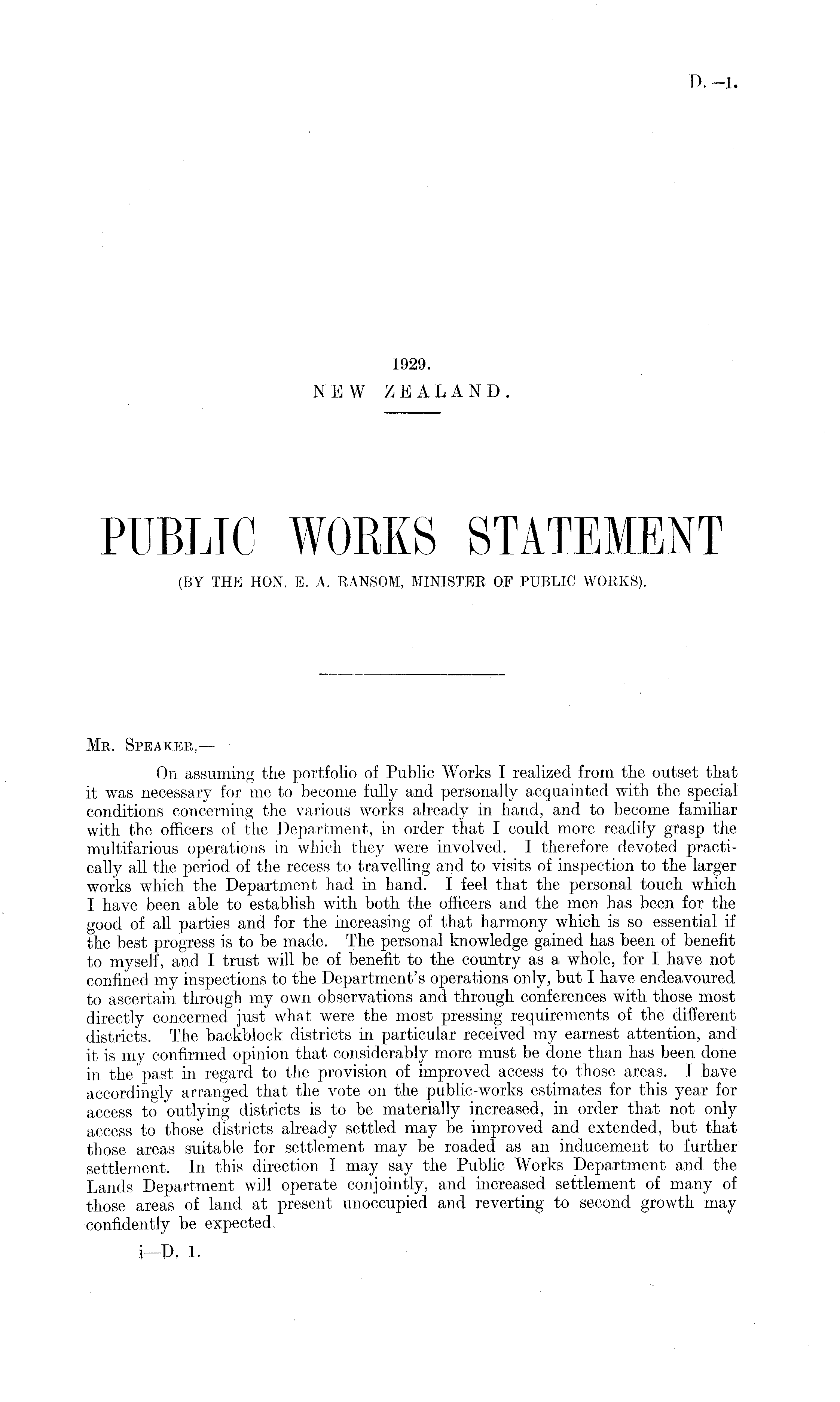 PUBLIC WORKS STATEMENT (BY THE HON. E. A. RANSOM, MINISTER OF PUBLIC WORKS).