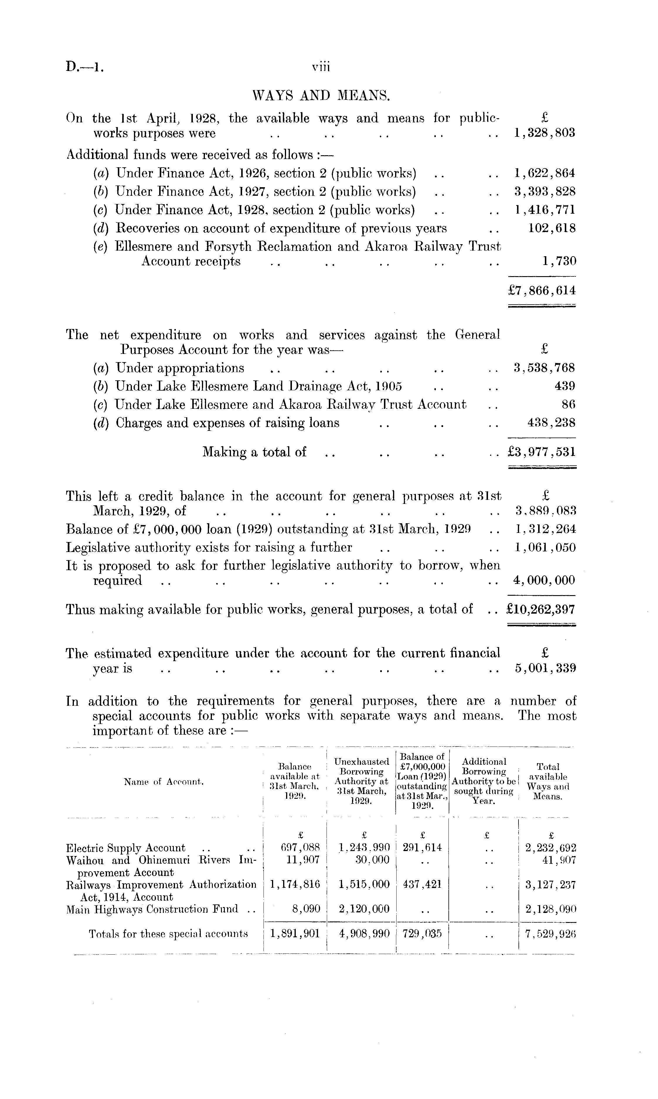 WAYS AND MEANS. On the Ist April, 1928, the available ways and means for public- £ works purposes were . . . . . . . . 1,328,803 Additional funds were received as follows :— (a) Under Finance Act, 1926, section 2 (public works) .. . . 1,622,864 (b) Under Finance Act, 1927, section 2 (public works) .. . . 3,393,828 (c) Under Finance Act, 1928, section 2 (public works) .. 1,416,771 (d) Recoveries on account of expenditure of previous years .. 102,618 (e) Ellesmere and Forsyth Reclamation and Akaroa Railway Trust Account receipts .. .. .. .. .. 1,730 £7,866,614 The net expenditure on works and services against the General Purposes Account for the year was — £ (a) Under appropriations .. .. .. .. .. 3,538,768 (b) Under Lake Ellesmere Land Drainage Act, 1905 .. .. 439 (c) Under Lake Ellesmere and Akaroa Railway Trust Account . . 86 (d) Charges and expenses of raising loans .. .. . . 438,238 Making a total of .. .. .. .. £3,977,531 This left a credit balance in the account for general purposes at 31st £ March, 1929, of .. .. .. .. .. .. 3,889 ; 083 Balance of £7,000,000 loan (1929) outstanding at 31st March, 1929 .. 1, 312,264 Legislative authority exists for raising a further .. . . . . 1,061,050 It is proposed to ask for further legislative authority to borrow, when required .. .. . . . . .. .. .. 4,000,000 Thus making available for public works, general purposes, a total of .. £10,262,397 The estimated expenditure under the account for the current financial £ year is .. .. .. .. .. .. .. 5,001,339 In additioji to the requirements for general purposes, there are a number of special accounts for public works with separate ways and means. The most important of these are : —