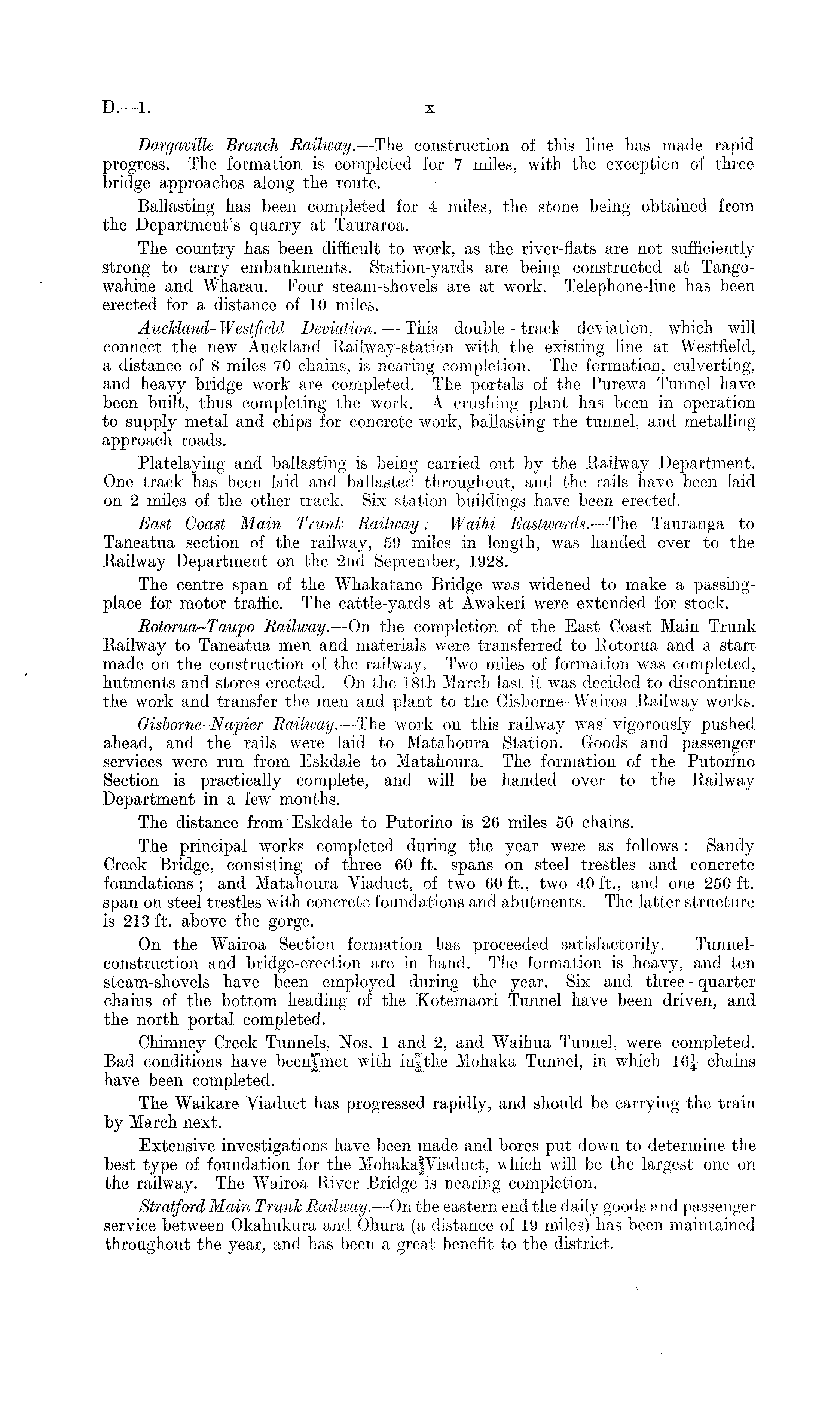 Dargaville Branch Railway.—The construction of this line has made rapid progress. The formation is completed for 7 miles, with the exception of three bridge approaches along the route. Ballasting has been completed for 4 miles, the stone being obtained from the Department's quarry at Tauraroa. The country has been difficult to work, as the river-flats are not sufficiently strong to carry embankments. Station-yards are being constructed at Tangowahine and Wharau. Four steam-shovels are at work. Telephone-line has been erected for a distance of 10 miles. Auclcland-Westfield Deviation. — This double - track deviation, which will connect the new Auckland Railway-station with the existing line at Westfield, a distance of 8 miles 70 chains, is nearing completion. The formation, culverting, and heavy bridge work are completed. The portals of the Purewa Tunnel have been built, thus completing the work. A crushing plant has been in operation to supply metal and chips for concrete-work, ballasting the tunnel, and metalling approach roads. Platelaying and ballasting is being carried out by the Railway Department. One track has been laid and ballasted throughout, and the rails have been laid on 2 miles of the other track. Six station buildings have been erected. East Coast Main Trunk Railway: Waihi Eastwards. —The Tauranga to Taneatua section, of the railway, 59 miles in length, was handed over to the Railway Department on the 2nd September, 1928. The centre span of the Whakatane Bridge was widened to make a passingplace for motor traffic. The cattle-yards at Awakeri were extended for stock. Rotorua-Taupo Railway. —On the completion of the East Coast Main Trunk Railway to Taneatua men and materials were transferred to Rotorua and a start made on the construction of the railway. Two miles of formation was completed, hutments and stores erected. On the 18th March last it was decided to discontinue the work and transfer the men and plant to the Gisborne-Wairoa Railway works. Gisborne-Nafier Railway.— -The work on this railway was' vigorously pushed ahead, and the rails were laid to Matahoura Station. Goods and passenger services were run from Eskdale to Matahoura. The formation of the Putorino Section is practically complete, and will be handed over to the Railway Department in a few months. The distance from Eskdale to Putorino is 26 miles 50 chains. The principal works completed during the year were as follows : Sandy Creek Bridge, consisting of three 60 ft. spans on steel trestles and concrete foundations ; and Matahoura Viaduct, of two 60 ft., two 40 ft., and one 250 ft. span on steel trestles with concrete foundations and abutments. The latter structure is 213 ft. above the gorge. On the Wairoa Section formation has proceeded satisfactorily. Tunnelconstruction and bridge-erection are in hand. The formation is heavy, and ten steam-shovels have been employed during the year. Six and three - quarter chains of the bottom heading of the Kotemaori Tunnel have been driven, and the north portal completed. Chimney Creek Tunnels, Nos. 1 and 2, and Waihua Tunnel, were completed. Bad conditions have beenfmet with in! the Mohaka Tunnel, in which 16|- chains have been completed. The Waikare Viaduct has progressed rapidly, and should be carrying the train by March next. Extensive investigations have been made and bores put down to determine the best type of foundation for the Mohaka|Viaduct, which will be the largest one on the railway. The Wairoa River Bridge is nearing completion. Stratford Main Trunk Railway. —On the eastern end the daily goods and passenger service between Okahukura and Ohura (a distance of 19 miles) has been maintained throughout the year, and has been a great benefit to the district.