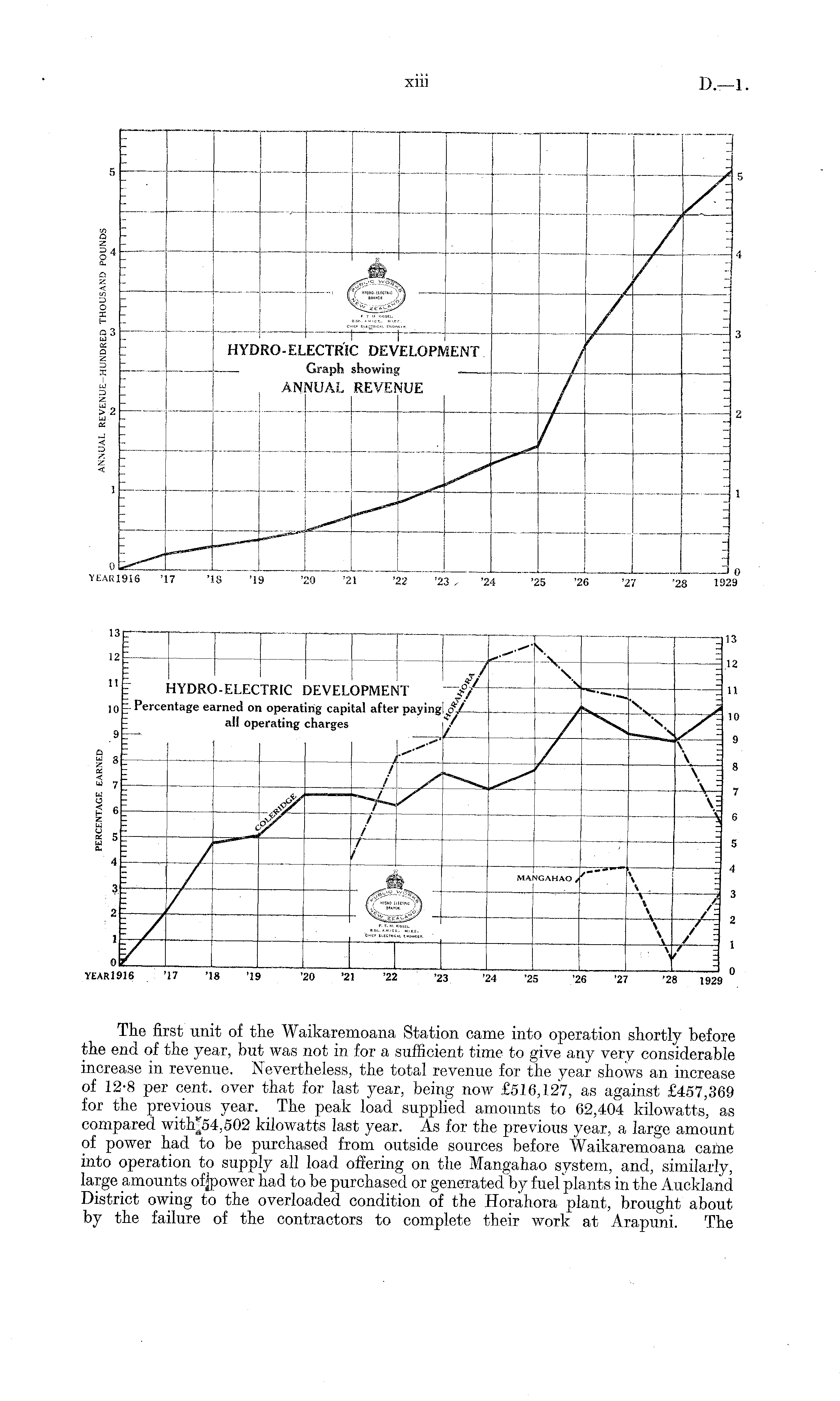 The first unit of the Waikaremoana Station came into operation shortly before the end of the year, but was not in for a sufficient time to give any very considerable increase in revenue. Nevertheless, the total revenue for the year shows an increase of 12-8 per cent, over that for last year, being now £516,127, as against £457,369 for the previous year. The peak load supplied amounts to 62,404 kilowatts, as compared with J 54,502 kilowatts last year. As for the previous year, a large amount of power had to be purchased from outside sources before Waikaremoana came into operation to supply all load offering on the Mangahao system, and, similarly, large amounts of jpower had to be purchased or generated by fuel plants in the Auckland District owing to the overloaded condition of the Horahora plant, brought about by the failure of the contractors to complete their work at Arapuni. The