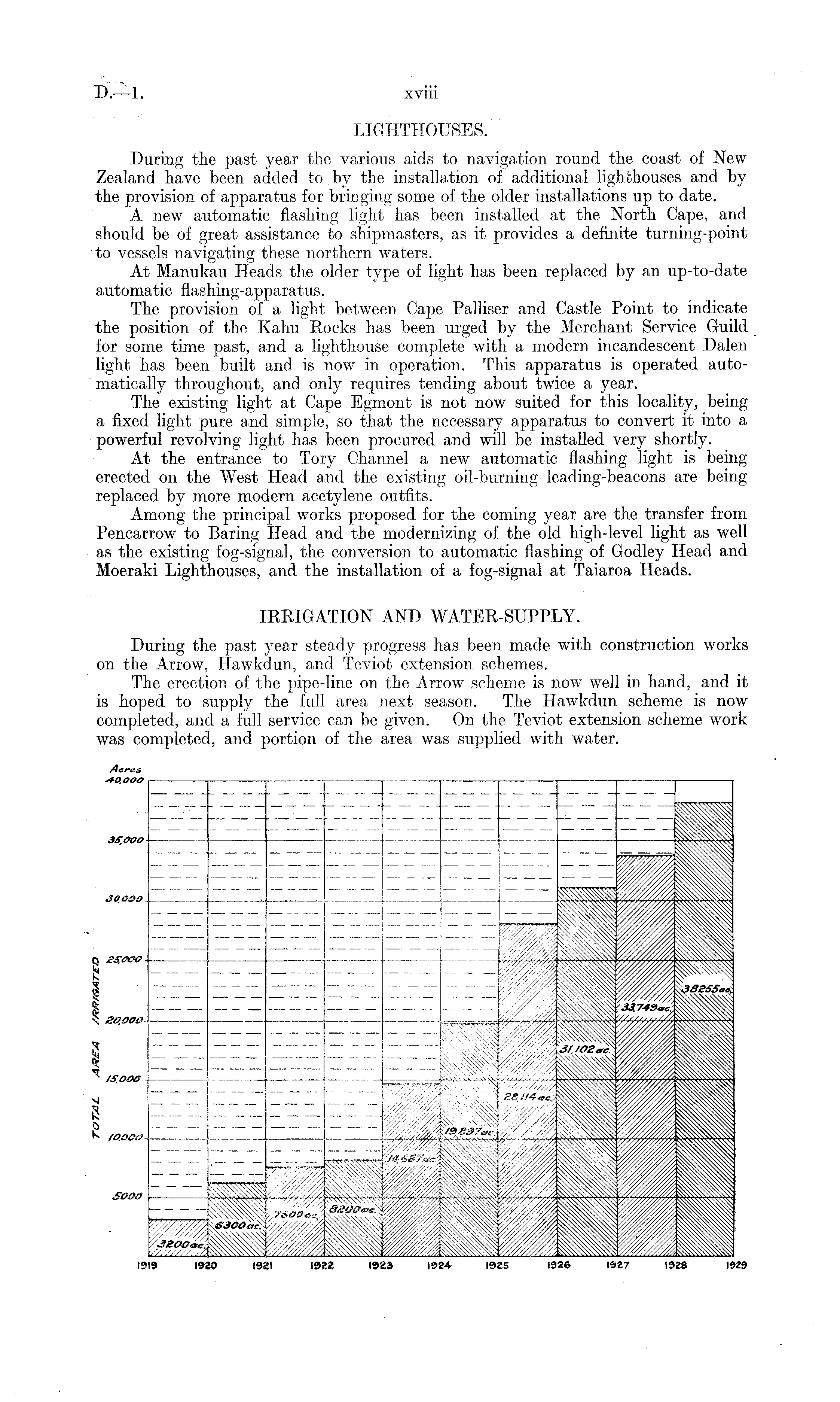 LIGHTHOUSES. During the past year the various aids to navigation round the coast of New Zealand have been added to by the installation of additional lighthouses and by the provision of apparatus for bringing some of the older installations up to date. A new automatic flashing light has been installed at the North Cape, and should be of great assistance to shipmasters, as it provides a definite turning-point to vessels navigating these northern waters. At Manukau Heads the older type of light has been replaced by an up-to-date automatic flashing-apparatus. The provision of a light between Cape Palliser and Castle Point to indicate the position of the Kahu Rocks has been urged by the Merchant Service Guild for some time past, and a lighthouse complete with a modern incandescent Dalen light has been built and is now in operation. This apparatus is operated automatically throughout, and only requires tending about twice a year. The existing light at Cape Egmont is not now suited for this locality, being a fixed light pure and simple, so that the necessary apparatus to convert it into a powerful revolving light has been procured and will be installed very shortly. At the entrance to Tory Channel a new automatic flashing light is being erected on the West Head and the existing oil-burning leading-beacons are being replaced by more modern acetylene outfits. Among the principal works proposed for the coming year are the transfer from Pencarrow to Baring Head and the modernizing of the old high-level light as well as the existing fog-signal, the conversion to automatic flashing of Godley Head and Moeraki Lighthouses, and the installation of a fog-signal at Taiaroa Heads. IRRIGATION AND WATER-SUPPLY. During the past year steady progress has been made with construction works on the Arrow, Hawkdun, and Teviot extension schemes. The erection of the pipe-line on the Arrow scheme is now well in hand, and it is hoped to supply the full area next season. The Hawkdun scheme is now completed, and a full service can be given. On the Teviot extension scheme work was completed, and portion of the area was supplied with water.