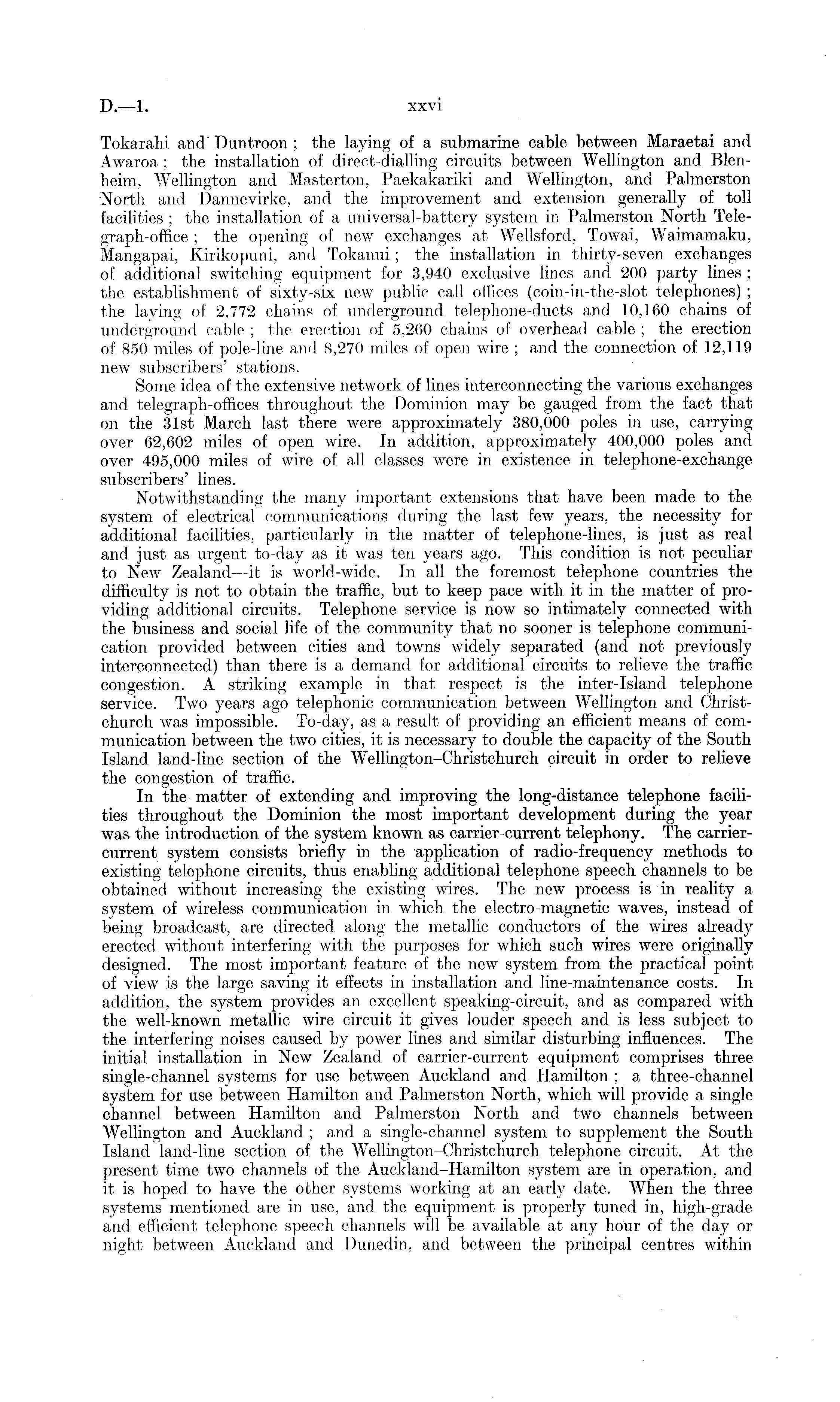 Tokarahi and' Duntroon ; the laying of a submarine cable between Maraetai and Awaroa ; the installation of direct-dialling circuits between Wellington and Blenheim, Wellington and Masterton, Paekakariki and Wellington, and Palmerston North and Dannevirke, and the improvement and extension generally of toll facilities ; the installation of a universal-battery system in Palmerston North Tele-graph-office ; the opening of new exchanges at Wellsford, Towai, Waimamaku, Mangapai, Kirikopuni, and Tokanui; the installation in thirty-seven exchanges of additional switching equipment for 3,940 exclusive lines and 200 party lines ; the establishment of sixty-six new public call offices (coin-in-the-slot telephones) ; the laying of 2,772 chains of underground telephone-ducts and 10,160 chains of underground cable ; the erection of 5,260 chains of overhead cable ; the erection of 850 miles of pole-line and 8,270 miles of open wire ; and the connection of 12,119 new subscribers' stations. Some idea of the extensive network of lines interconnecting the various exchanges and telegraph-offices throughout the Dominion may be gauged from the fact that on the 31st March last there were approximately 380,000 poles in use, carrying over 62,602 miles of open wire. In addition, approximately 400,000 poles and over 495,000 miles of wire of all classes were in existence in telephone-exchange subscribers' lines. Notwithstanding the many important extensions that have been made to the system of electrical communications during the last few years, the necessity for additional facilities, particularly in the matter of telephone-lines, is just as real and just as urgent to-day as it was ten years ago. This condition is not peculiar to New Zealand —it is world-wide. In all the foremost telephone countries the difficulty is not to obtain the traffic, but to keep pace with it in the matter of providing additional circuits. Telephone service is now so intimately connected with the business and social life of the community that no sooner is telephone communication provided between cities and towns widely separated (and not previously interconnected) than there is a demand for additional circuits to relieve the traffic congestion. A striking example in that respect is the inter-Island telephone service. Two years ago telephonic communication between Wellington and Christchurch was impossible. To-day, as a result of providing an efficient means of communication between the two cities, it is necessary to double the capacity of the South Island land-line section of the Wellington-Christchurch circuit in order to relieve the congestion of traffic. In the matter of extending and improving the long-distance telephone facilities throughout the Dominion the most important development during the year was the introduction of the system known as carrier-current telephony. The carriercurrent system consists briefly in the application of radio-frequency methods to existing telephone circuits, thus enabling additional telephone speech channels to be obtained without increasing the existing wires. The new process is in reality a system of wireless communication in which the electro-magnetic waves, instead of being broadcast, are directed along the metallic conductors of the wires already erected without interfering with the purposes for which such wires were originally designed. The most important feature of the new system from the practical point of view is the large saving it effects in installation and line-maintenance costs. In addition, the system provides an excellent speaking-circuit, and as compared with the well-known metallic wire circuit it gives louder speech and is less subject to the interfering noises caused by power lines and similar disturbing influences. The initial installation in New Zealand of carrier-current equipment comprises three single-channel systems for use between Auckland and Hamilton ; a three-channel system for use between Hamilton and Palmerston North, which will provide a single channel between Hamilton and Palmerston North and two channels between Wellington and Auckland ; and a single-channel system to supplement the South Island land-line section of the Wellington-Christchurch telephone circuit. At the present time two channels of the Auckland-Hamilton system are in operation, and it is hoped to have the other systems working at an early date. When the three systems mentioned are in use, and the equipment is properly tuned in, high-grade and efficient telephone speech channels will be available at any hour of the day or night between Auckland and Dunedin, and between the principal centres within