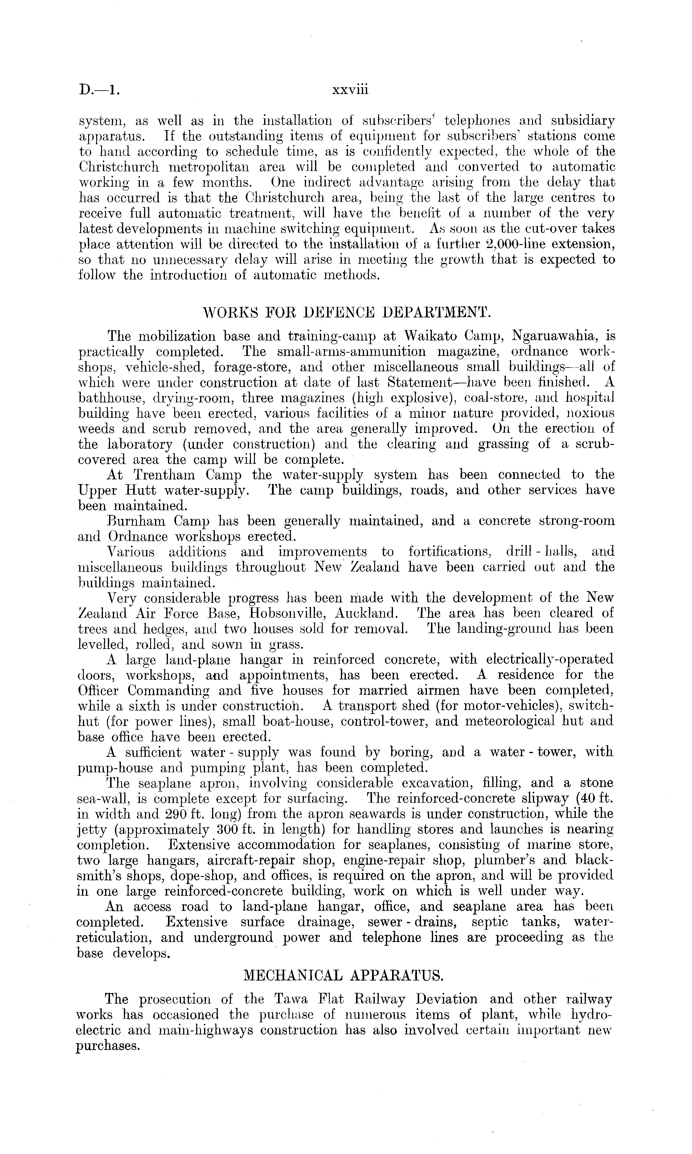 system, as well as in the installation of subscribers' telephones and subsidiary apparatus. If the outstanding items of equipment for subscribers' stations come to hand according to schedule time, as is confidently expected, the whole of the Christchurch metropolitan area will be completed and converted to automatic working in a few months. One indirect advantage arising from the delay that has occurred is that the Christchurch area, being the last of the large centres to receive full automatic treatment, will have the benefit of a number of the very latest developments in machine switching equipment. As soon as the cut-over takes place attention will be directed to the installation of a further 2,000-line extension, so that no unnecessary delay will arise in meeting the growth that is expected to follow the introduction of automatic methods. WORKS FOE DEFENCE DEPARTMENT. The mobilization base and training-camp at Waikato Camp, Ngaruawahia, is practically completed. The small-arms-ammunition magazine, ordnance workshops, vehicle-shed, forage-store, and other miscellaneous small buildings—all of which were under construction at date of last Statement —have been finished. A bathhouse, drying-room, three magazines (high explosive), coal-store, and hospital building have been erected, various facilities of a minor nature provided, noxious weeds and scrub removed, and the area generally improved. On the erection of the laboratory (under construction) and the clearing and grassing of a scrubcovered area the camp will be complete. At Trentham Camp the water-supply system has been connected to the Upper Hutt water-supply. The camp buildings, roads, and other services have been maintained. Burnham Camp has been generally maintained, and a concrete strong-room and Ordnance workshops erected. Various additions and improvements to fortifications, drill - halls, and miscellaneous buildings throughout New Zealand have been carried out and the buildings maintained. Very considerable progress has been made with the development of the New Zealand Air Force Base, Hobsonville, Auckland. The area has been cleared of trees and hedges, and two houses sold for removal. The landing-ground has been levelled, rolled, and sown in grass. A large land-plane hangar in reinforced concrete, with electrically-operated doors, workshops, and appointments, has been erected. A residence for the Officer Commanding and five houses for married airmen have been completed, while a sixth is under construction. A transport shed (for motor-vehicles), switchhut (for power lines), small boat-house, control-tower, and meteorological hut and base office have been erected. A sufficient water - supply was found by boring, and a water - tower, with pump-house and pumping plant, has been completed. The seaplane apron, involving considerable excavation, filling, and a stone sea-wall, is complete except for surfacing. The reinforced-concrete slipway (40 ft. in width and 290 ft. long) from the apron seawards is under construction, while the jetty (approximately 300 ft. in length) for handling stores and launches is nearing completion. Extensive accommodation for seaplanes, consisting of marine store, two large hangars, aircraft-repair shop, engine-repair shop, plumber's and blacksmith's shops, dope-shop, and offices, is required on the apron, and will be provided in one large reinforced-concrete building, work on which is well under way. An access road to land-plane hangar, office, and seaplane area has been completed. Extensive surface drainage, sewer - drains, septic tanks, waterreticulation, and underground power and telephone lines are proceeding as the base develops. MECHANICAL APPARATUS. The prosecution of the Tawa Flat Railway Deviation and other railway works has occasioned the purchase of numerous items of plant, while hydroelectric and main-highways construction has also involved certain important new purchases.