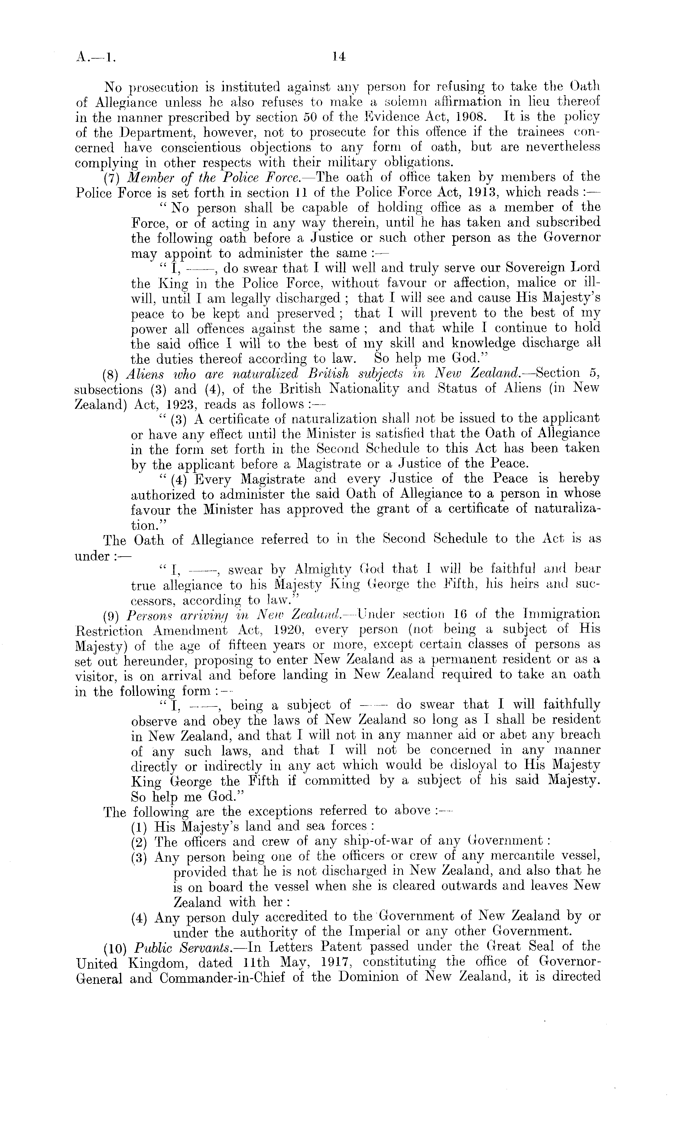No prosecution is instituted against any person for refusing to take the Oath of Allegiance unless he also refuses to make a solemn affirmation in lieu thereof in the manner prescribed by section 50 of the Evidence Act, 1908. Tt is the policy of the Department, however, not to prosecute for this offence if the trainees concerned have conscientious objections to any form of oath, but are nevertheless complying in other respects with their military obligations. (7) Member of the Police Force. —The oath of office taken by members of the Police Force is set forth in section 11 of the Police Force Act, 1913, which reads : — " No person shall be capable of holding office as a member of the Force, or of acting in any way therein, until he has taken and subscribed the following oath before a Justice or such other person as the Governor may appoint to administer the same : — " I, , do swear that I will well and truly serve our Sovereign Lord the King in the Police Force, without favour or affection, malice or illwill, until I am legally discharged ; that I will see and cause His Majesty's peace to be kept and preserved ; that I will prevent to the best of my power all offences against the same ; and that while 1 continue to hold the said office I will to the best of my skill and knowledge discharge all the duties thereof according to law. So help me God." (8) Aliens ivho are naturalized British subjects in New Zealand. —Section 5, subsections (3) and (4), of the British Nationality and Status of Aliens (in New Zealand) Act, 1923, reads as follows : — " (3) A certificate of naturalization shall not be issued to the applicant or have any effect until the Minister is satisfied that the Oath of Allegiance in the form set forth in the Second Schedule to this Act has been taken by the applicant before a Magistrate or a Justice of the Peace. " (4) Every Magistrate and every Justice of the Peace is hereby authorized to administer the said Oath of Allegiance to a person in whose favour the Minister has approved the grant of a certificate of naturalization." The Oath of Allegiance referred to in the Second Schedule to the Act is as under : — " I, , swear by Almighty God that I will be faithful and bear true allegiance to his Majesty King George the Fifth, his heirs and successors, according to law." (9) Persons arriving in New Zealand. —Under section 16 of the Immigration Restriction Amendment Act, 1920, every person (not being a subject of His Majesty) of the age of fifteen years or more, except certain classes of persons as set out hereunder, proposing to enter New Zealand as a permanent resident or as a visitor, is on arrival and before landing in New Zealand required to take an oath in the following form : — "I. , being a subject of do swear that I will faithfully observe and obey the laws of New Zealand so long as I shall be resident in New Zealand, and that I will not in any manner aid or abet any breach of any such laws, and that I will not be concerned in any manner directly or indirectly in any act which would be disloyal to His Majesty King George the Fifth if committed by a subject of his said Majesty. So help me God." The following are the exceptions referred to above : — (1) His Majesty's land and sea forces : (2) The officers and crew of any ship-of-war of any Government : (3) Any person being one of the officers or crew of any mercantile vessel, provided that he is not discharged in New Zealand, and also that he is on board the vessel when she is cleared outwards and leaves New Zealand with her : (4) Any person duly accredited to the Government of New Zealand by or under the authority of the Imperial or any other Government. (10) Public Servants. —In Letters Patent passed under the Great Seal of the United Kingdom, dated 11th May, 1917, constituting the office of GovernorGeneral and Commander-in-Chief of the Dominion of New Zealand, it is directed