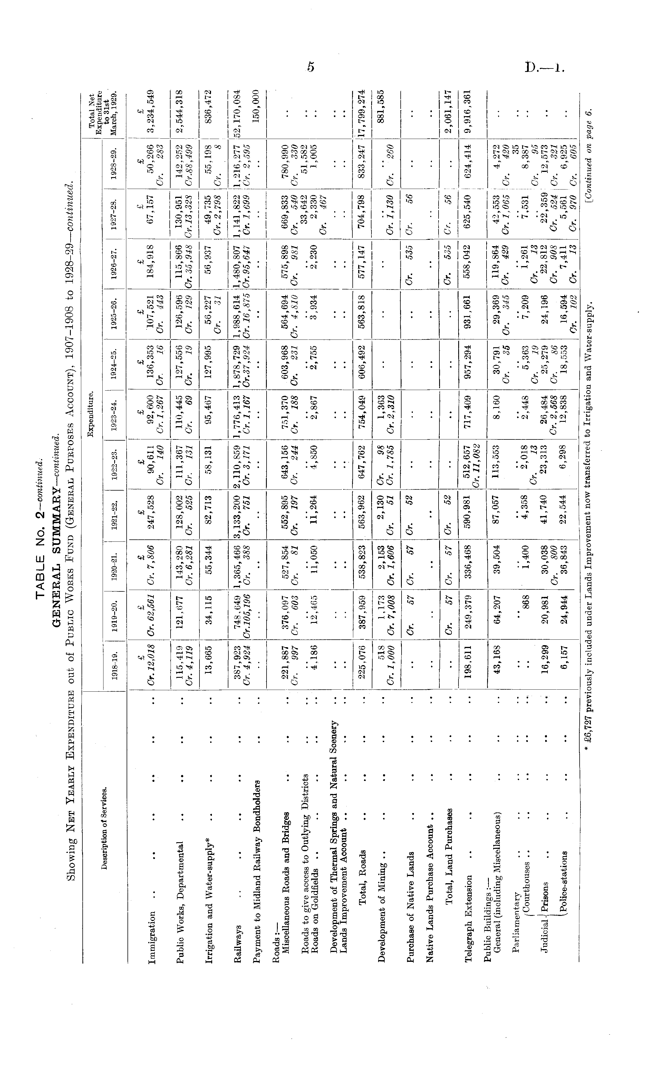 TABLE No. 2—continued. GENERAL SUMMARY—continued. Showing Net Yearly Expenditure out of Public Works Fund (General Purposes Account), 1907-1908 to 1928-29—continued.