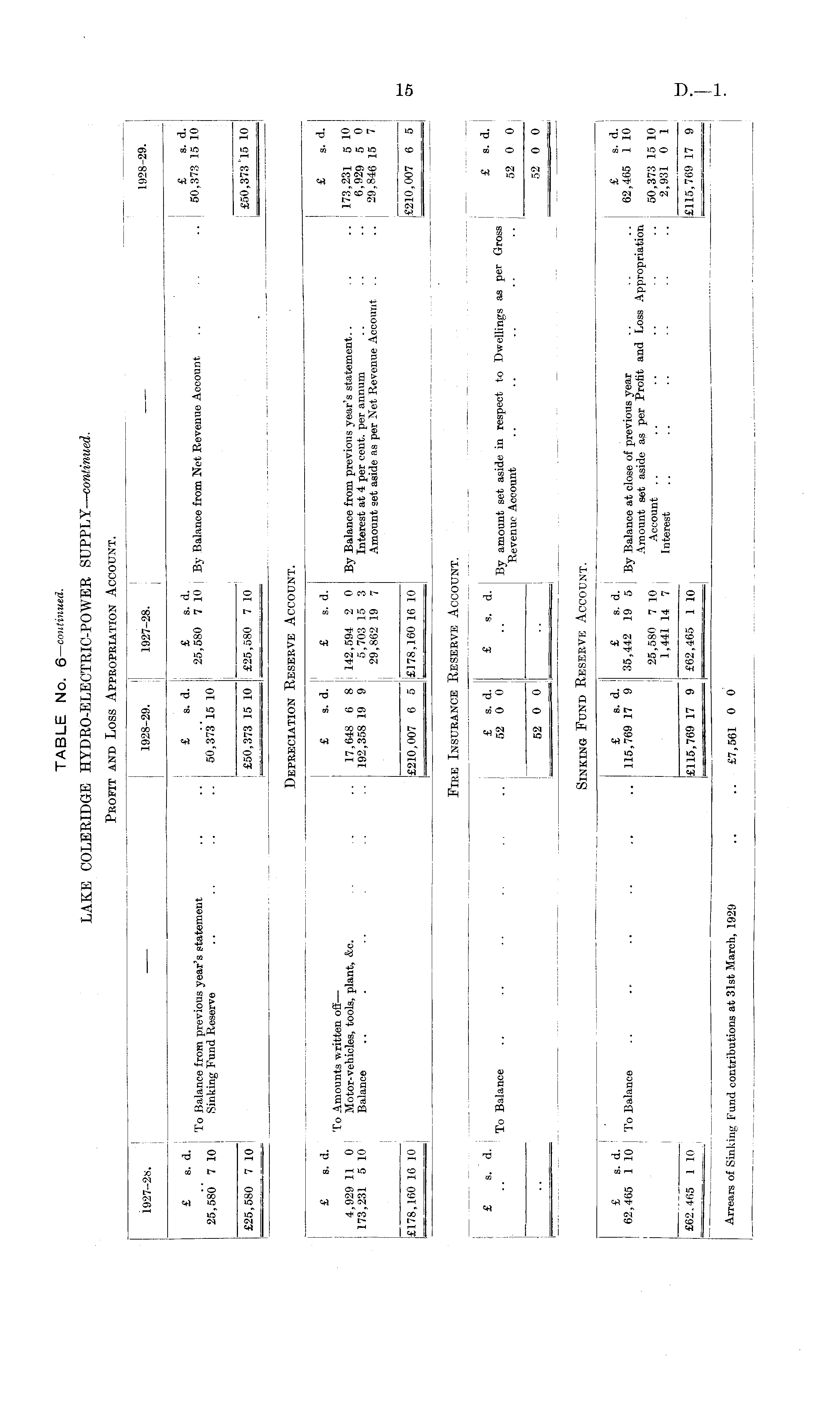 Profit and Loss Appropriation Account. 1927-28. 1928-29. 1927-28. 1928-29. £ s. d. £ s. d. £ s. d. £ s. d. j To Balance from previous year's statement .. .. .. 25,580 7 10 By Balance from Net Revenue Account .. . .. j 50,373 15 10 25,580 7 10 Sinking Fund Reserve .. .. .. .. 50,373 15 10 £25,580 7 10 £50,373 15 10 £25,580 7 10 £50,373 15 10 Depreciation Reserve Account. I i j ~ £ s. d. £ s. d. £ s. d. £ s* dTo Amounts written off — 4,929 11 0 Motor-vehicles, tools, plant, &c. .. .. 17,648 6 8 142,594 2 0 By Balance from previous year's statement.. .. .. 173,231 5 10 173,231 5 10 Balance .. . .. .. .. 192,358 19 9 5,703 15 3 Interest at 4 per cent, per annum .. .. .. 6,929 5 0 29,862 19 7 Amount aet aside as per Net Revenue Account .. .. 29,846 15 7 £178,160 16 10 £210,007 6 5 £178,160 16 10 £210,007 6 5 Fire Insurance Reserve Account. £ s. d. £ s. d. i £ s. d. £ s - d. To Balance .. .. .. .. .. 52 0 0 .. By amount set aside in respect to Dwellings as per Gross Revenue Account .. .. .. .. .. 52 0 0 52 0 0 52 0 0 Sinking Fund Reserve Account. £ s. d. £ s. d. £ s. d. £ s. d. 62,465 1 10 To Balance .. .. .. .. .. 115,769 17 9 i 35,442 19 5 I By Balance at close of previous year .. .. .. 62,465 1 10 Amount set aside as per Profit and Loss Appropriation 25,580 7 10 Account .. .. .. •• ■ •• 50,373 15 10 1,441 14 7 Interest .. .. •• •• 2,931 0 1 £62.465 1 10 £115,769 17 9 £62,465 1 10 j £115,769 17 9 Arrears of Sinking Fund contributions at 31st March, 1929 .. .. £7,561 0 0