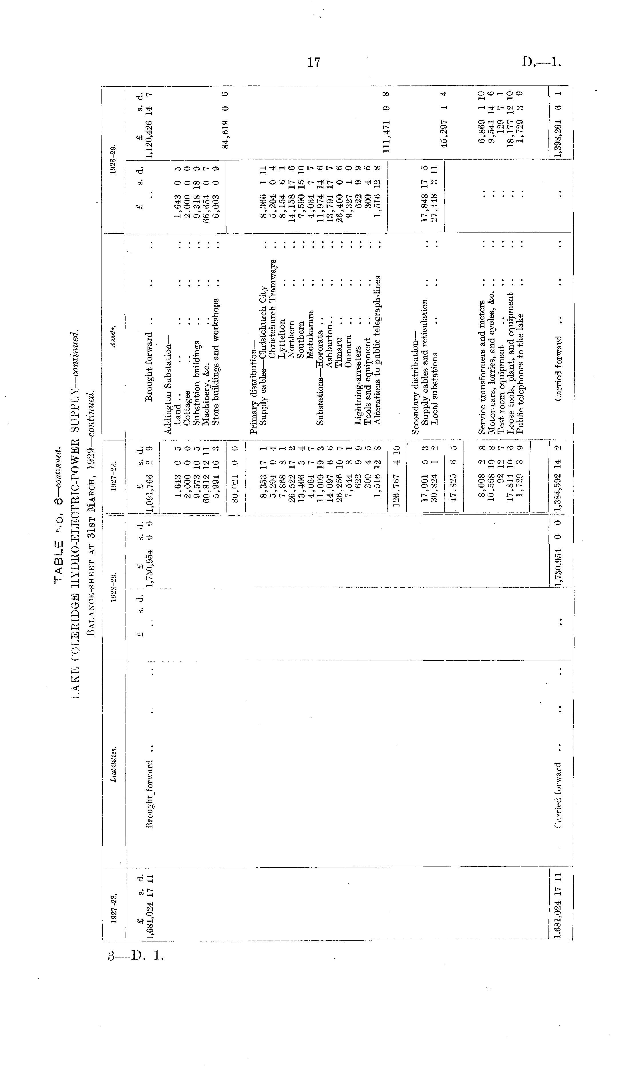 1927-28. Liabilities. 1928-29. I 1927-28. Assets. 1928-29. £ s. d. £ s. d. £ s. d. £ s. d. £ s. d. £ s. d. !1,024 17 11 Brought forward .. .. .. .. 1,750,954 0 0 1,091,766 2 9 Brought forward .. .. .. .. 1,120,426 14 7 Addington Substation — 1,643 0 5 Land .. .. .. .. .. 1,643 0 5 2,000 0 0 Cottages .. .. .. .. 2,000 0 0 9,573 10 5 Substation buildings .. .. .. 9,318 18 9 60,812 12 11 Machinery, &c. .. .. .. 65,654 0 7 5,991 16 3 Store buildings and workshops .. .. 6,003 0 9 84,619 0 6 80,021 0 0 Primary distribution — 8,353 17 1 Supply cables —Christchurch City .. 8,366 1 11 5,204 0 4 Christchurch Tramways .. 5,204 0 4 7,868 8 1 Lyttelton .. .. 8,154 6 1 26,522 17 2 Northern .. .. 14,158 17 6 13,406 3 4 Southern .. .. 7,590 15 10 4,064 7 7 Motukarara .. .. 4,064 7 7 11,009 19 3 Substations —Hororata .. .. .. 11,974 14 6 14,097 6 6 Ashburton.. .. .. 13,791 17 7 26,256 10 7 Timaru .. .. .. 26,400 0 6 7,544 8 1 Oamaru .. .. .. 9,327 1 0 622 9 9 Lightning-arresters .. .. .. 622 9 9 300 4 5 Tools and equipment .. .. .. 300 4 5 1,516 12 8 Alterations to public telegraph-lines .. 1,516 12 8 111,471 9 8 126,767 4 10 Secondary distribution — 17,001 5 3 Supply cables and reticulation .. .. 17,848 17 5 30.824 1 2 Local substations .. .. .. 27,448 3 11 45,297 1 4 47.825 6 5 8,008 2 8 Service transformers and meters .. .. .. 6,869 1 10 10,568 10 8 Motor-cars, lorries, and cycles, &c. .. .. .. 9,541 14 6 92 12 7 Test room equipment .. .. .. .. 129 7 1 17,814 10 6 Loose tools, plant, and equipment .. .. .. 18,177 12 10 1,729 3 9 Public telephones to the lake .. .. .. 1,729 3 9 51,024 17 11 Carried forward .. .. 1,750,954 0 0 1,384,592 14 2 Carried forward .. .. .. .. 1,398,261 6 1