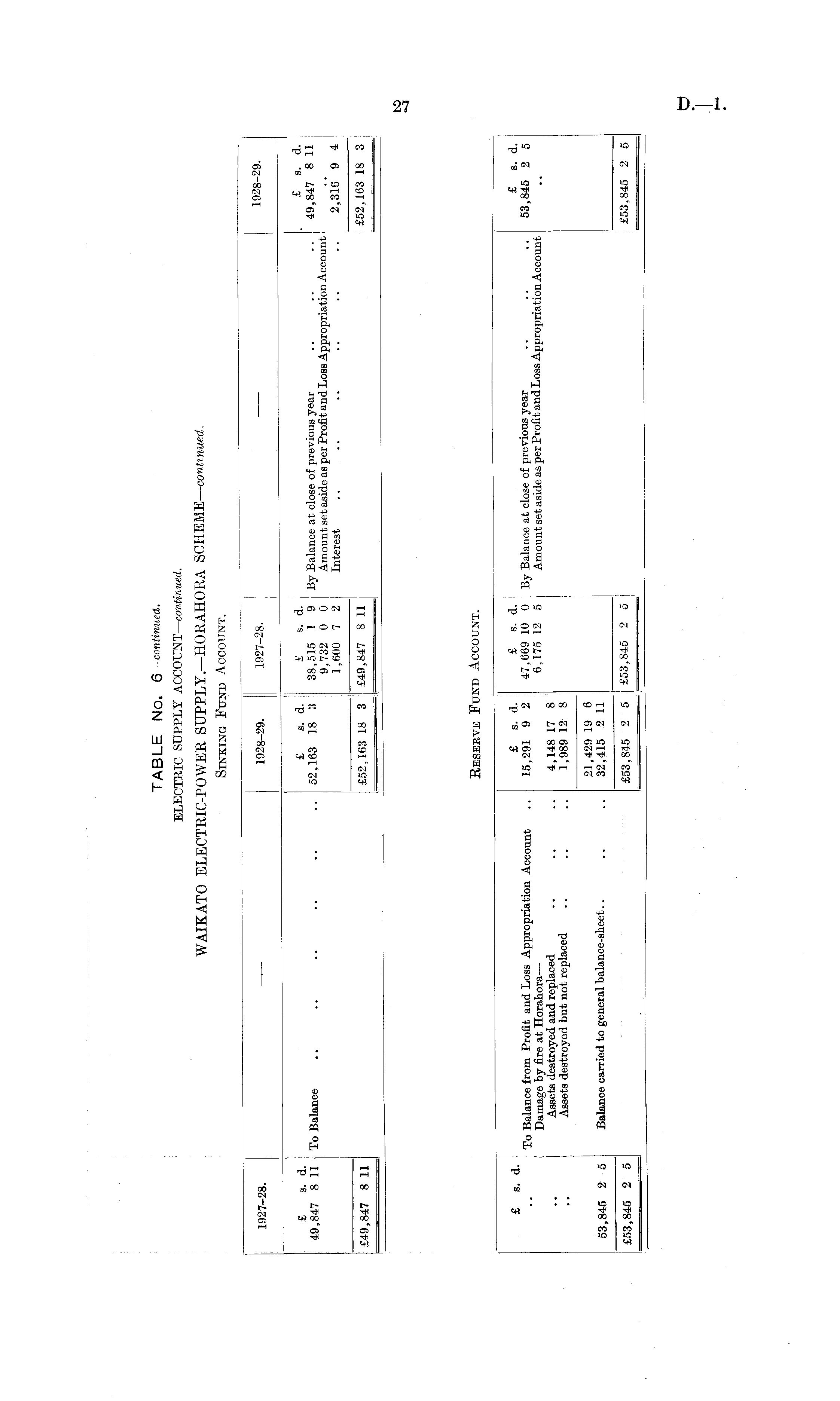 Sinking Fund Account. 1927-28. — 1928-29. 1927-28. 1928-29. £ a. d. £ s. d. £ s. d. . £ s. d. 49,847 8 11 To Balance .. .. .. .. .. .. 52,163 18 3 38,515 1 9 By Balance at close of previous year .. .. .. 49,847 8 11 9,732 0 0 Amount set aside as per Profit and Loss Appropriation Account 1,600 7 2 Interest .. .. .. .. .. .. 2,316 9 4 £49,847 8 11 £52,163 18 3 £49,847 8 11 £52,163 18 3 Reserve Fund Account. £ s. d. £ s. d. £ s. d. _ £ s. d. To Balance from Profit and Loss Appropriation Account .. 15,291 9 2 ! 47,669 10 0 By Balance at close of previous year .. .. .. 53,845 2 5 Damage by fire at Horahora — 6,175 12 5 Amount set aside as per Profit and Loss Appropriation Account Assets destroyed and replaced . . .. .. 4,148 17 8 Assets destroyed but not replaced .. .. .. 1,989 12 8 21,429 19 6 53,845 2 5 Balance carried to general balance-sheet.. .. .. 32,415 2 11 £53,845 2 5 £53,845 2 5 £53,845 2 5 | £53,845 2 5