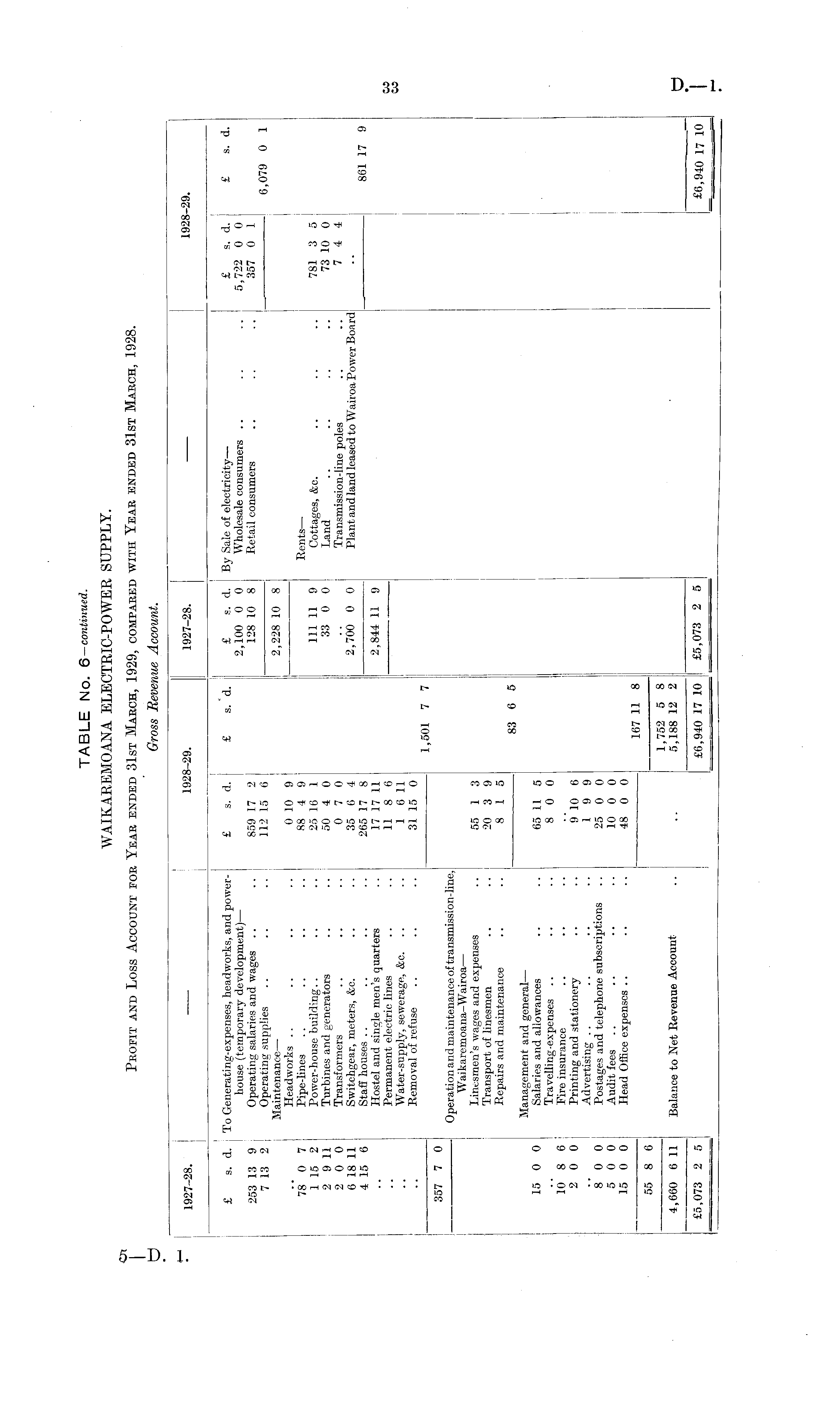 TABLE No. 6—continued. WAIKAREMOANA ELECTRIC-POWER SUPPLY. Profit and Loss Account for Year ended 31st March, 1929, compared with Year ended 31st March, 1928. Gross Revenue Account.