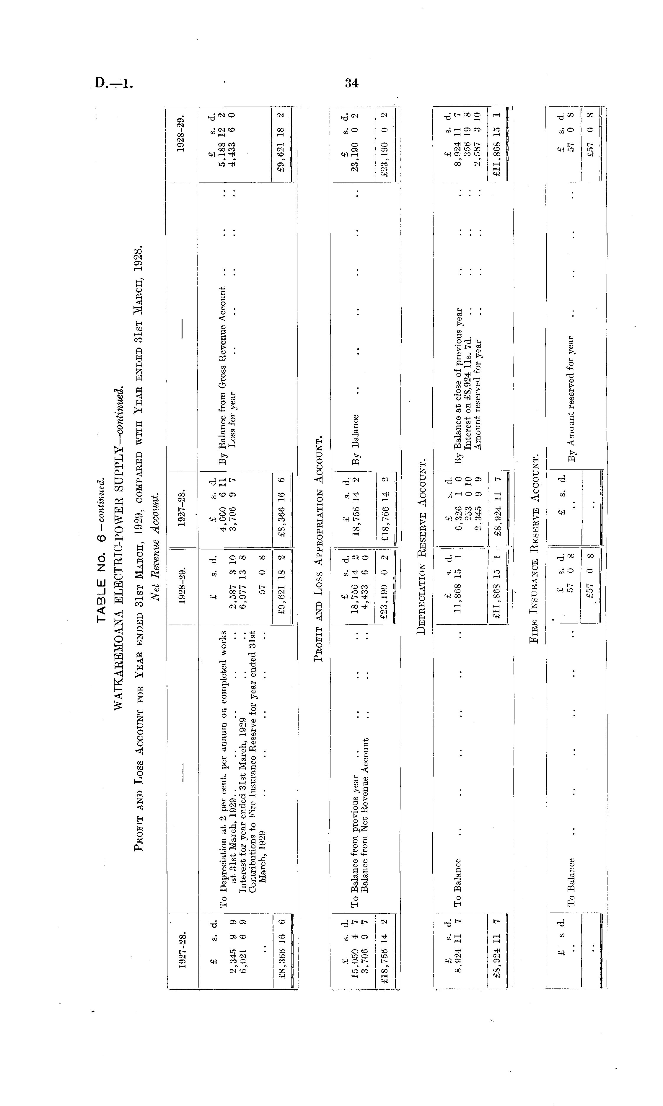 Net Revenue Account. 1927-28. 1928-29. 1927-28. 1928-29. £ s. d. £ s. d. £ s. d. £ s. d. To Depreciation at 2 per cent, per annum on completed works 4,660 6 11 By Balance from Gross Revenue Account .. .. .. 5,188 12 2 2,345 9 9 at 31st March, 1929.. .. .. .. .. 2,587 3 10 3,706 9 7 Loss for year .. .. .. .. .. 4,433 6 0 6,021 6 9 Interest for year ended 31st March, 1929 .. .. 6,977 13 8 Contributions to Fire Insurance Reserve for year ended 31st March, 1929 .. .. .. .. .. 57 0 8 £8,366 16 6 £9,621 18 2 £8,366 16 6 £9,621 18 2 Profit and Loss Appropriation Account. £ s. d. £ s. d. £ s. d. £ s. d. 15,050 4 7 To Balance from previous year .. .. .. .. 18,756 14 2 18,756 14 2 By Balance .. .. .. .. .. .. 23,190 0 2 3,706 9 7 Balance from Net Revenue Account .. .. .. 4,433 6 0 £18,756 14 2 £23,190 0 2 £18,756 14 2 £23,190 0 2 j Depreciation Reserve Account. £ s. d. £ s. d. £ s. d. £ s. d. 8,924 11 7 To Balance .. .. .. .. .. .. 11,868 15 1 6,326 1 0 By Balance at close of previous year .. .. .. 8,924 11 7 253 0 10 Interest on £8,924 lis. 7d. .. .. .. .. 356 19 8 2,345 9 9 Amount reserved for year .. .. .. .. 2,587 3 10 £8,924 11 7 1 £11,868 15 1 ; £8,924 11 7 £11,868 15 1 Fire Insurance Reserve Account. £ s d. £ s. d. £ s. d. £ s. d. To Balance .. .. .. .. .. .. 57 0 8 .. By Amount reserved for year .. .. .. .. 57 0 8 £57 0 8 £57 0 8