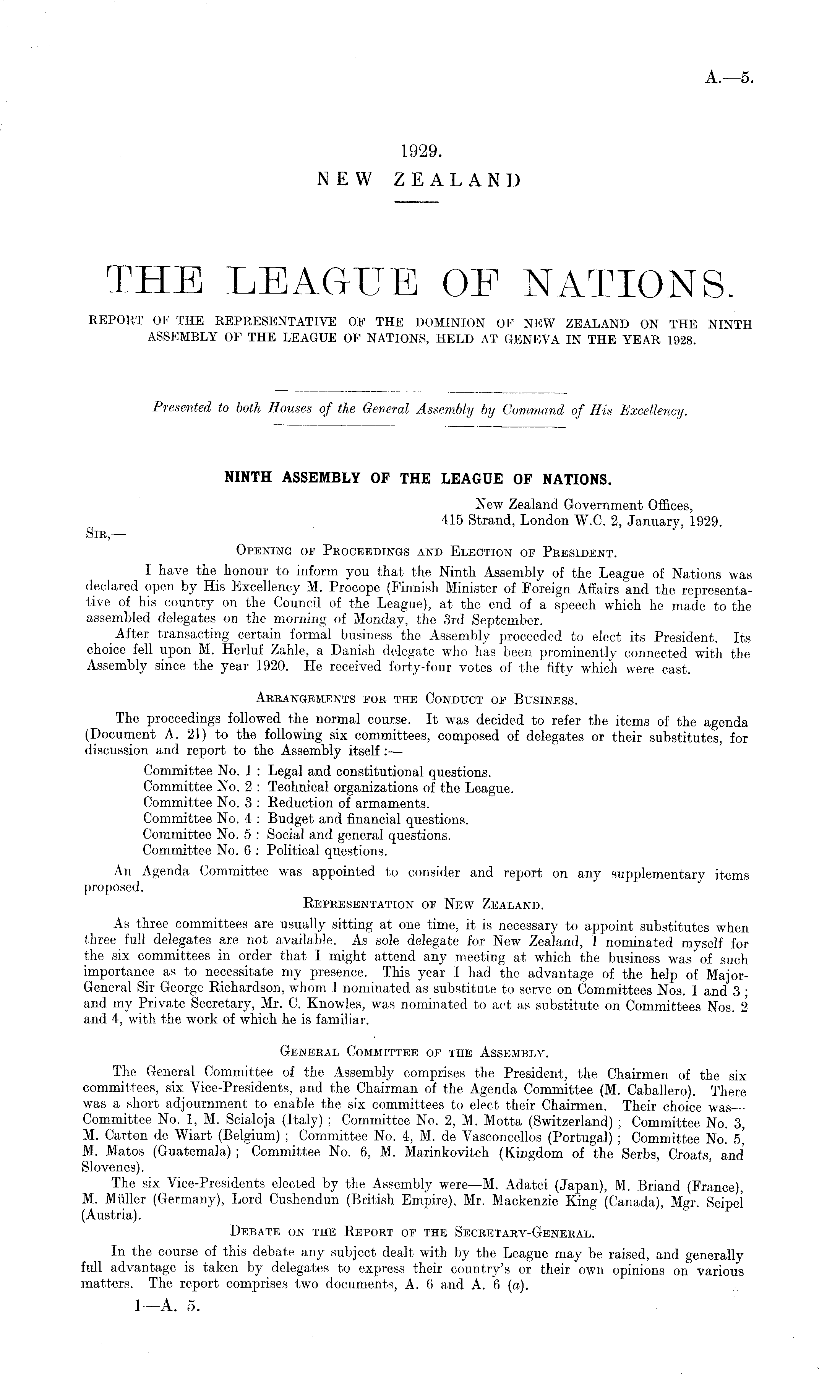 NINTH ASSEMBLY OF THE LEAGUE OF NATIONS. New Zealand Government Offices, 415 Strand, London W.C. 2, January, 1929. Sib, — Opening or Pboceedings and Election or President. I have the honour to inform you that the Ninth Assembly of the League of Nations was declared open by His Excellency M. Procope (Finnish Minister of Foreign Affairs and the representative of his country on the Council of the League), at the end of a speech which he made to the assembled delegates on the morning of Monday, the 3rd September. After transacting certain formal business the Assembly proceeded to elect its President. Its choice fell upon M. Herluf Zahle, a Danish delegate who has been prominently connected with the Assembly since the year 1920. He received forty-four votes of the fifty which were cast. Arrangements for the Conduct op Business. The proceedings followed the normal course. It was decided to refer the items of the agenda (Document A. 21) to the following six committees, composed of delegates or their substitutes, for discussion and report to the Assembly itself :— Committee No. 1 : Legal and constitutional questions. Committee No. 2 : Technical organizations of the League. Committee No. 3 : Reduction of armaments. Committee No. 4 : Budget and financial questions. Committee No. 5 : Social and general questions. Committee No. 6 : Political questions. An Agenda Committee was appointed to consider and report on any supplementary items proposed. Representation op New Zealand. As three committees are usually sitting at one time, it is necessary to appoint substitutes when three full delegates are not available. As sole delegate for New Zealand, I nominated myself for the six committees in order that I might attend any meeting at which the business was of such importance as to necessitate my presence. This year I had the advantage of the help of MajorGeneral Sir George Richardson, whom I nominated as substitute to serve on Committees Nos. 1 and 3 ; and my Private Secretary, Mr. C. Knowles, was nominated to act as substitute on Committees Nos. 2 and 4, with the work of which he is familiar. Geneeal Committee of the Assembly. The General Committee of the Assembly comprises the President, the Chairmen of the six committees, six Vice-Presidents, and the Chairman of the Agenda Committee (M. Caballero). There was a short adjournment to enable the six committees to elect their Chairmen. Their choice was Committee No. 1, M. Scialoja (Italy) ; Committee No. 2, M. Motta (Switzerland) ; Committee No. 3, M. Carton de Wiart (Belgium) ; Committee No. 4, M. de Vasconcellos (Portugal) ; Committee No. 5,' M. Matos (Guatemala) ; Committee No. 6, M. Marinkovitch (Kingdom of the Serbs, Croats, and Slovenes). The six Vice-Presidents elected by the Assembly were —M. Adatci (Japan), M. Briand (France), M. Miiller (Germany), Lord Cushendun (British Empire), Mr. Mackenzie King (Canada), Mgr. Seipel (Austria). Debate on the Repobt op the Secbetaby-Genebal. In the course of this debate any subject dealt with by the League may be raised, and generally full advantage is taken by delegates to express their country's or their own opinions on various matters. The report comprises two documents, A. 6 and A. 6 (a).