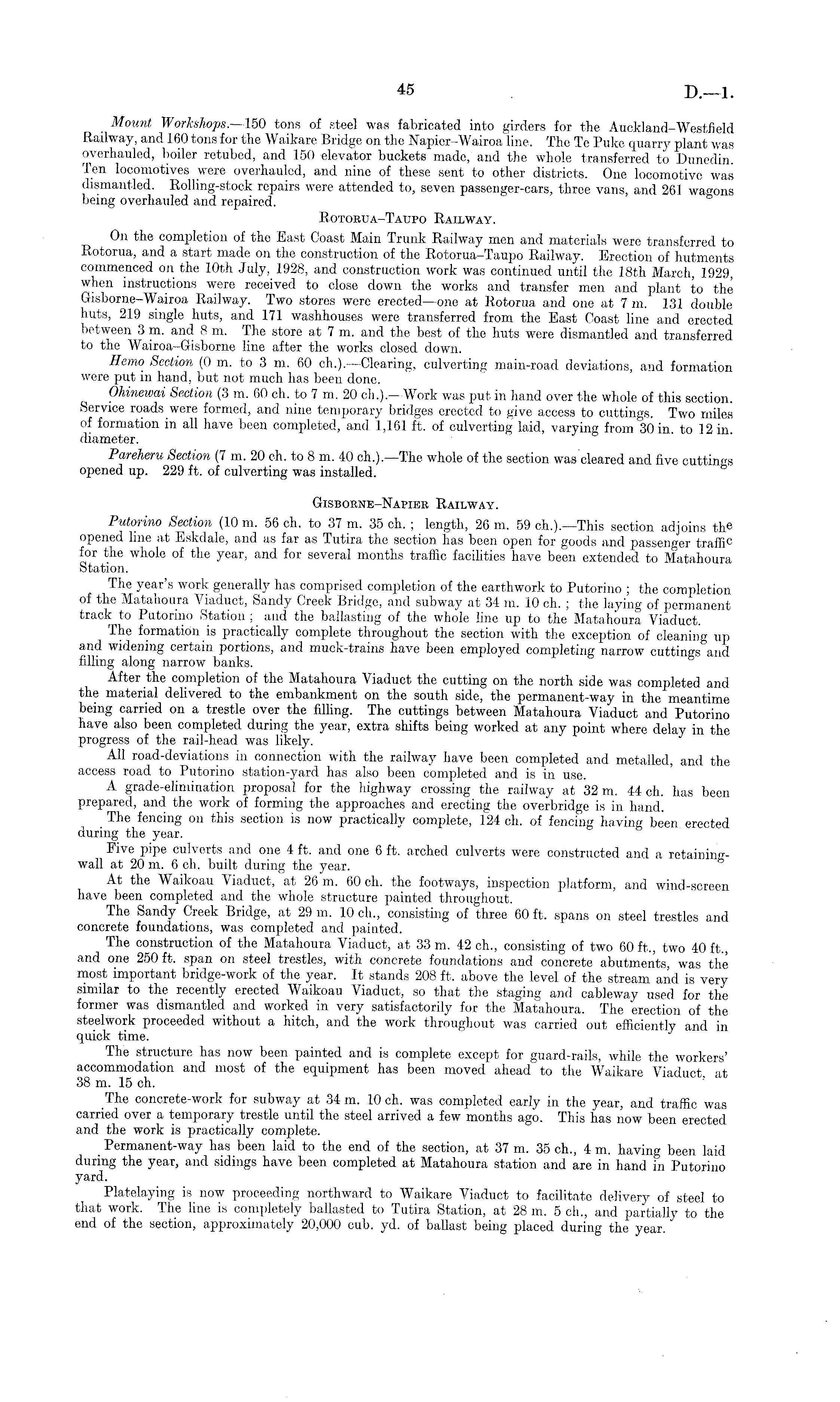 Mount Workshops.—lso tons of steel was fabricated into girders for the Auckland-Westfield Railway, and 160 tons for the Waikare Bridge on the Napier-Wairoa line. The Te Puke quarry plant was overhauled, boiler retubed, and 150 elevator buckets made, and the whole transferred to Dunedin. Ten locomotives were overhauled, and nine of these sent to other districts. One locomotive was dismantled. Rolling-stock repairs were attended to, seven passenger-cars, three vans, and 261 wagons being overhauled and repaired. Rotorua-Taupo Railway. On the completion of the East Coast Main Trunk Railway men and materials were transferred to Rotorua, and a start made on the construction of the Rotorua-Taupo Railway. Erection of hutments commenced on the 10th July, 1928, and construction work was continued until the 18th March, 1929, when instructions w'ere received to close down the works and transfer men and plant to the Gisborne-Wairoa Railway. Two stores were erected—one at Rotorua and one at 7m. 131 double huts, 219 single huts, and 171 washhouses were transferred from the East Coast line and erected between 3m. and Bm. The store at 7m. and the best of the huts were dismantled and transferred to the Wairoa-Gisborne line after the works closed down. Hemo Section (0 m. to 3 m. 60 ch.). —Clearing, culverting main-road deviations, and formation were put in hand, but not much has been done. Ohinewai Section (3 m. 60 ch. to 7 m. 20 ch.).—Work was put in hand over the whole of this section. Service roads were formed, and nine temporary bridges erected to give access to cuttings. Two miles of formation in all have been completed, and 1,161 ft. of culverting laid, varying from 30 in. to 12 in. diameter. Pareheru Section (7 m. 20 ch. to 8 m. 40 ch.). —The whole of the section was cleared and five cuttings opened up. 229 ft. of culverting was installed. Gisborne-Napibr Railway. Putorino Section (10 m. 56 ch. to 37 m. 35 eh. ; length, 26 m. 59 ch.).—This section adjoins the opened line at Eskdale, and as far as Tutira the section has been open for goods and passenger traffi 0 for the whole of the year, and for several months traffic facilities have been extended to Matahoura Station. The year's work generally has comprised completion of the earthwork to Putorino ; the completion of the Matahoura Viaduct, Sandy Creek Bridge, and subway at 34 m. 10 ch. ; the laying of permanent track to Putorino Station ; and the ballasting of the whole line up to the Matahoura Viaduct. The formation is practically complete throughout the section with the exception of cleaning up and widening certain portions, and muck-trains have been employed completing narrow cuttings and filling along narrow banks. After the completion of the Matahoura Viaduct the cutting on the north side was completed and the material delivered to the embankment on the south side, the permanent-way in the meantime being carried on a trestle over the filling. The cuttings between Matahoura Viaduct and Putorino have also been completed during the year, extra shifts being worked at any point where delay in the progress of the rail-head was likely. All road-deviations in connection with the railway have been completed and metalled, and the access road to Putorino station-yard has also been completed and is in use. A grade-elimination proposal for the highway crossing the railway at 32 m. 44 ch. has been prepared, and the work of forming the approaches and erecting the overbridge is in hand. The fencing on this section is now practically complete, 124 ch. of fencing having been erected during the year. Five pipe culverts and one 4 ft. and one 6 ft. arched culverts were constructed and a retainingwall at 20 m. 6 ch. built during the year. At the Waikoau Viaduct, at 26 m. 60 ch. the footways, inspection platform, and wind-screen have been completed and the whole structure painted throughout. The Sandy Creek Bridge, at 29 m. 10 ch., consisting of three 60 ft. spans on steel trestles and concrete foundations, was completed and painted. The construction of the Matahoura Viaduct, at 33 m. 42 ch., consisting of two 60 ft., two 40 ft., and one 250 ft. span on steel trestles, with concrete foundations and concrete abutments, was the most important bridge-work of the year. It stands 208 ft. above the level of the stream and is very similar to the recently erected Waikoau Viaduct, so that the staging and cableway used for the former was dismantled and worked in very satisfactorily for the Matahoura. The erection of the steelwork proceeded without a hitch, and the work throughout was carried out efficiently and in quick time. The structure has now been painted and is complete except for guard-rails, while the workers' accommodation and most of the equipment has been moved ahead to the Waikare Viaduct, at 38 m. 15 ch. The concrete-work for subway at 34 m. 10 ch. was completed early in the year, and traffic was carried over a temporary trestle until the steel arrived a few months ago. This has now been erected and the work is practically complete. Permanent-way has been laid to the end of the section, at 37 m. 35 ch., 4 m. having been laid during the year, and sidings have been completed at Matahoura station and are in hand in Putorino yard. Platelaying is now proceeding northward to Waikare Viaduct to facilitate delivery of steel to that work. The line is completely ballasted to Tutira Station, at 28 m. 5 ch., and partially to the end of the section, approximately 20,000 cub. yd. of ballast being placed during the year.