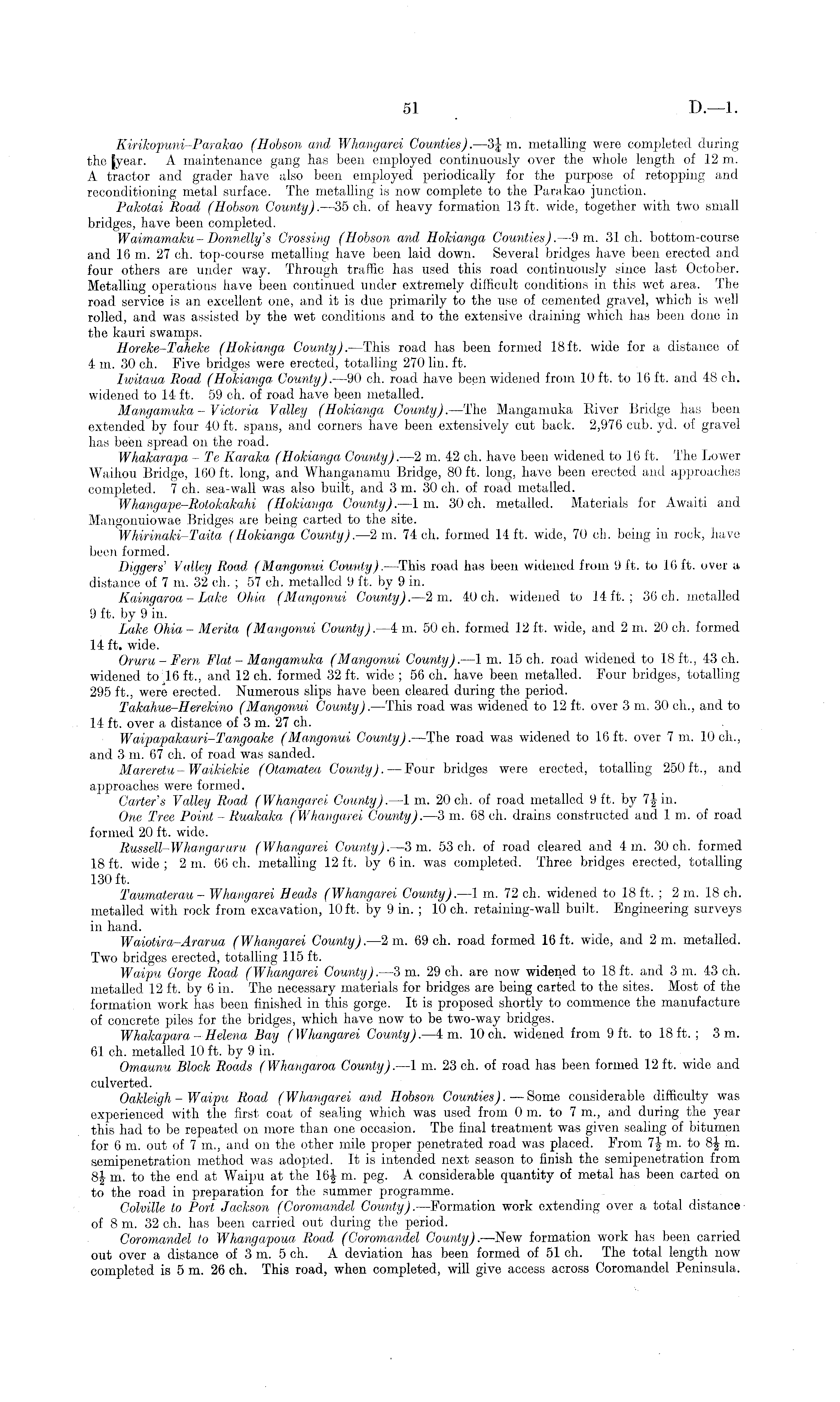 Kinkopuni-Parakao (Hobson and Whangarei Counties). —3J m. metalling were completed during the |year. A maintenance gang has been employed continuously over the whole length of 12 m. A tractor and grader have also been employed periodically for the purpose of retopping and reconditioning metal surface. The metalling is now complete to the Parakao junction. Pakotai Road (Hobson County). —35 ch. of heavy formation 13 ft. wide, together with two small bridges, have been completed. Waimamaku-Donnelly's Crossing (Hobson and Hokianga Counties). —9 m. 31 ch. bottom-course and 16 m. 27 ch. top-course metalling have been laid down. Several bridges have been erected and four others are under way. Through traffic has used this road continuously since last October. Metalling operations have been continued under extremely difficult conditions in this wet area. The road service is an excellent one, and it is due primarily to the use of cemented gravel, which is well rolled, and was assisted by the wet conditions and to the extensive draining which has been done in the kauri swamps. Horeke-Taheke (Hokianga County). —This road has been formed 18ft. wide for a distance of 4: m. 30 ch. Five bridges were erected, totalling 270 lin. ft. Iwitaua Road (Hokianga County). —90 ch. road have been widened from 10 ft. to 16 ft. and 48 ch. widened to 14. ft. 59 ch. of road have b.een metalled. Mangamuka - Victoria Valley (Hokianga County). —The Mangamuka River Bridge has been extended by four 40 ft. spans, and corners have been extensively cut back. 2,976 cub. yd. of gravel has been spread on the road. Whakarapa -Te Karaka (Hokianga County). —2 m. 42 ch. have been widened to 16 ft. The Lower Waihou Bridge, 160 ft. long, and Whanganamu Bridge, 80 ft. long, have been erected and approaches completed. 7 ch. sea-wall was also built, and 3m. 30 ch. of road metalled. Whangape-Rotokakahi (Hokianga County). —1 m. 30 ch. metalled. Materials for Awaiti and Mangonuiowae Bridges are being carted to the site. Whirinaki-Taita (Hokianga County). —2 m. 74 ch. formed 14 ft. wide, 70 ch. being in rock, have been formed. Diggers' Valley Road (Mangonui County). —This road has been widened from 9 ft. to 16 ft. over a distance of 7 m. 32 ch. ; 57 ch. metalled 9 ft. by 9 in. Kaingaroa - Lake Ohia (Mangonui County). —2 m. 40 ch. widened to 14 ft.; 36 ch. metalled 9 ft. by 9 in. Lake Ohia-Merita (Mangonui County). —4 m. 50 ch. formed 12 ft. wide, and 2m. 20 ch. formed 14 ft. wide. Oruru- Fern Flat - Mangamuka (Mangonui County). —1 m. 15 ch. road widened to 18 ft., 43 ch. widened to 16 ft., and 12 ch. formed 32 ft. wide ; 56 ch. have been metalled. Four bridges, totalling 295 ft., were erected. Numerous slips have been cleared during the period. Takahue-Herekino (Mangonui County).—This road was widened to 12 ft. over 3 m. 30 ch., and to 14 ft. over a distance of 3 m. 27 ch. W aipapakauri-Tangoake (Mangonui County). —The road was widened to 16 ft. over 7 m. 10 ch., and 3 m. 67 ch. of road was sanded. Mareretu- Wa.ikiekie (Otamatea County). —Four bridges were erected, totalling 250 ft., and approaches were formed. Carter's Valley Road (Whangarei County). —1 m. 20 ch. of road metalled 9 ft. by 7§in. One Tree Point - Ruakalca (Whangarei County). —3 m. 68 ch. drains constructed and Im. of road formed 20 ft. wide. Russell-Whangaruru (Whangarei County). —3 m. 53 ch. of road cleared and 4m. 30 ch. formed 18 ft. wide ; 2m. 66 ch. metalling 12 ft. by 6 in. was completed. Three bridges erected, totalling 130 ft. Taumaterau - Whangarei Heads (Whangarei County). —1 m. 72 ch. widened to 18 ft. ;2m. 18 ch. metalled with rock from excavation, 10 ft. by 9 in. ; 10 ch. retaining-wall built. Engineering surveys in hand. Waiotira-Ararua (Whangarei County). —2 m. 69 ch. road formed 16 ft. wide, and 2m. metalled. Two bridges erected, totalling 115 ft. Waipu Gorge Road (Whangarei County). —3 m. 29 ch. are now widened to 18 ft. and 3m. 43 ch. metalled 12 ft. by 6 in. The necessary materials for bridges are being carted to the sites. Most of the formation work has been finished in this gorge. It is proposed shortly to commence the manufacture of concrete piles for the bridges, which have now to be two-way bridges. Whakapara - Helena Bay (Whangarei County). —4 m. 10 ch. widened from 9 ft. to 18 ft.; 3m. 61 ch. metalled 10 ft. by 9 in. Omaunu Block Roads (Whangaroa County). —1 m. 23 ch. of road has been formed 12 ft. wide and cul verted. Oakleigh- Waipu Road (Whangarei and Hobson Counties). —Some considerable difficulty was experienced with the first coat of sealing which was used from 0 m. to 7 m., and during the year this had to be repeated on more than one occasion. The final treatment was given sealing of bitumen for 6m. out of 7 m., and on the other mile proper penetrated road was placed. From 7J m. to 8| m. semipenetration method was adopted. It is intended next season to finish the semi penetration from 8| m. to the end at Waipu at the 16J m. peg. A considerable quantity of metal has been carted on to the road in preparation for the summer programme. Colville to Port Jackson (Coromandel County). —Formation work extending over a total distance of 8 m. 32 ch. has been carried out during the period. Coromandel to Whangapoua Road (Coromandel County).—New formation work has been carried out over a distance of 3m. 5 ch. A deviation has been formed of 51 ch. The total length now completed is sm. 26 ch. This road, when completed, will give access across Coromandel Peninsula.
