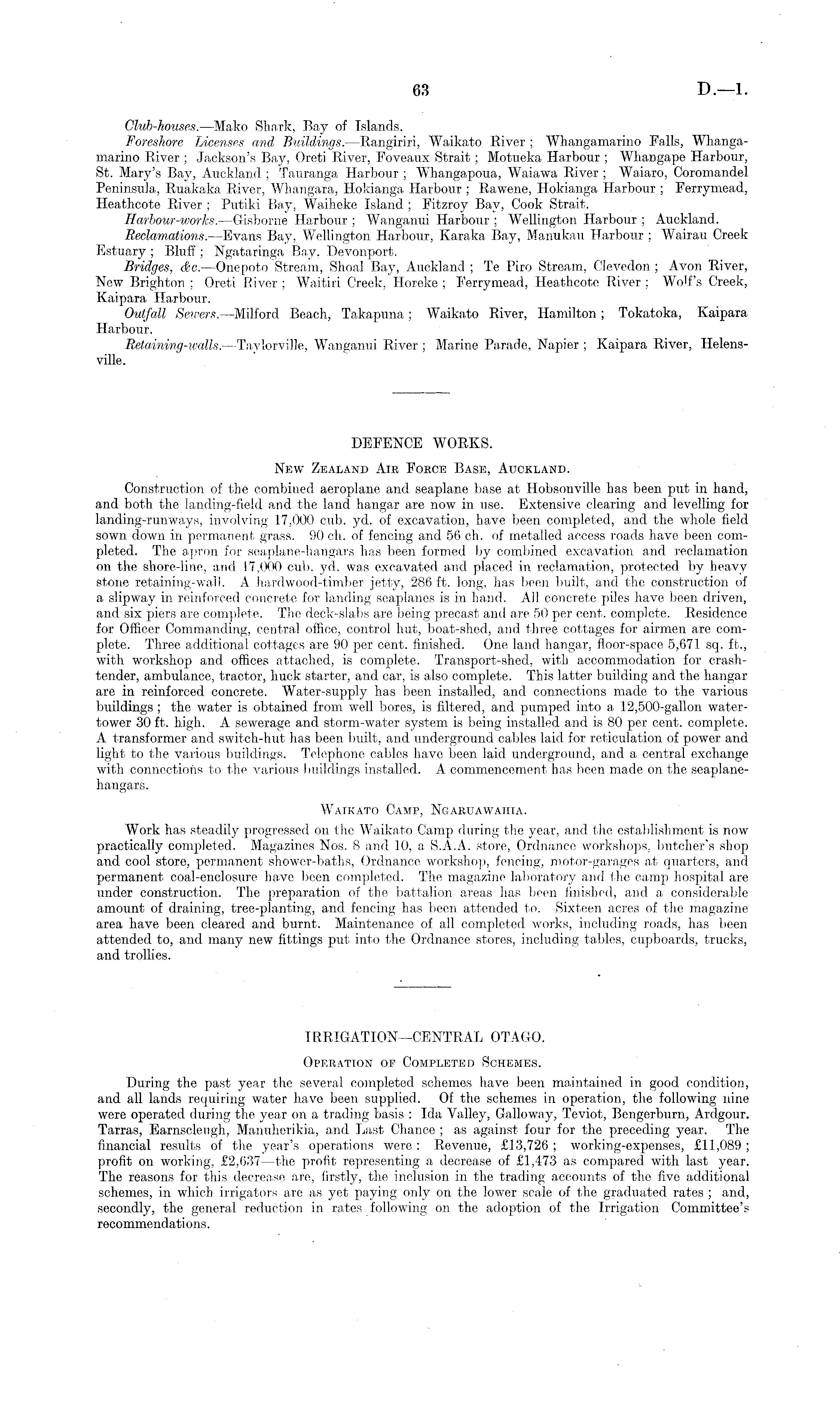 Club-houses. —Make Shark, Bay of Islands. Foreshore Licenses and Buildings. —Bangiriri, Waikato Biver ; Whangamarino Falls, Whangamarino Biver ; Jackson's Bay, Oreti Biver, Foveaux Strait ; Motueka Harbour ; Whangape Harbour, St. Mary's Bay, Auckland ; Tauranga Harbour ; Whangapoua, Waiawa Biver ; Waiaro, Coromandel BeninsuJa, Buakaka Biver, Whangara, Hokianga Harbour ; Bawene, Hokianga Harbour ; Ferrymead, Heathcote Biver ; Putiki Bay, Waiheke Island ; Fitzroy Bay, Cook Strait. Harbour-worhs.—Gisborne Harbour ; Wanganui Harbour ; Wellington Harbour ; Auckland. Reclamations.—Evans Bay, Wellington Harbour, Karaka Bay, Manukau Harbour ; Wairau Creek Estuary ; Bluff; Ngataringa Bay, Devonport. Bridges, &c.—Onepoto Stream, Shoal Bay, Auckland ; Te Piro Stream, Clevedon ; Avon Biver, New Brighton : Oreti Biver ; Waitiri Creek, Horeke ; Ferrymead, Heathcote Biver ; Wolf's Creek, Kaipara Harbour. Outfall Sewers.—Milford Beach, Takapuna ; Waikato Biver, Hamilton ; Tokatoka, Kaipara Harbour. Retaining-walls.—Taylorville, Wanganui Biver ; Marine Parade, Napier ; Kaipara Biver, Helensville. DEFENCE WOBKS. New Zealand Aie Fobce Base, Auckland. Construction of the combined aeroplane and seaplane base at Hobsonville has been put in hand, and both the landing-field and the land hangar are now in use. Extensive clearing and levelling for landing-runways, involving 17,000 cub. yd. of excavation, have been completed, and the whole field sown down in permanent grass. 90 ch. of fencing and 56 ch. of metalled access roads have been completed. The apron for seaplane-hangars has been formed by combined excavation and reclamation on the shore-line, and 17,000 cub. yd. was excavated and placed in reclamation, protected by heavy stone retaining-wall. A hardwood-timber jetty, 286 ft. long, has been built, and the construction of a slipway in reinforced concrete for landing seaplanes is in hand. All concrete piles have been driven, and six piers are complete. The deck-slabs are being precast and are 50 per cent, complete. Besidence for Officer Commanding, central office, control hut, boat-shed, and three cottages for airmen are complete. Three additional cottages are 90 per cent, finished. One land hangar, floor-space 5,671 sq. ft., with workshop and offices attached, is complete. Transport-shed, with, accommodation for crashtender, ambulance, tractor, huck starter, and car, is also complete. This latter building and the hangar are in reinforced concrete. Water-supply has been installed, and connections made to the various buildings ; the water is obtained from well bores, is filtered, and pumped into a 12,500-gallon watertower 30 ft. high. A sewerage and storm-water system is being installed and is 80 per cent, complete. A transformer and switch-hut has been built, and underground cables laid for reticulation of power and light to the various buildings. Telephone cables have been laid underground, and a central exchange with connections to the various buildings installed. A commencement has been made on the seaplanehangars. Waikato Camp, Ngabuawahia. Work has steadily progressed on the Waikato Camp during the year, and the establishment is now practically completed. Magazines Nos. 8 and 10, a S.A.A. store, Ordnance workshops, butcher's shop and cool store, permanent shower-baths, Ordnance workshop, fencing, motor-garages at quarters, and permanent coal-enclosure have been completed. The magazine laboratory and the camp hospital are under construction. The preparation of the battalion areas has been finished, and a considerable amount of draining, tree-planting, and fencing has been attended to. Sixteen acres of the magazine area have been cleared and burnt. Maintenance of all completed works, including roads, has been attended to, and many new fittings put into the Ordnance stores, including tables, cupboards, trucks, and trollies. IBBIGATION—CENTBAL OTAGO. Operation op Completed Schemes. During the past year the several completed schemes have been maintained in good condition, and all lands requiring water have been supplied. Of the schemes in operation, the following nine were operated during the year on a trading basis : Ida Valley, Galloway, Teviot, Bengerburn, Ardgour. Tarras, Earnscleugh, Manuherikia, and Last Chance ; as against four for the preceding year. The financial results of the year's operations were : Bevenue, £13,726 ; working-expenses, £11,089 ; profit on working, £2,637 —the profit representing a decrease of £1,4-73 as compared with last year. The reasons for this decrease are, firstly, the inclusion in the trading accounts of the five additional schemes, in which irrigators are as yet paying only on the lower scale of the graduated rates ; and, secondly, the general reduction in rates following on the adoption of the Irrigation Committee's recommendations.