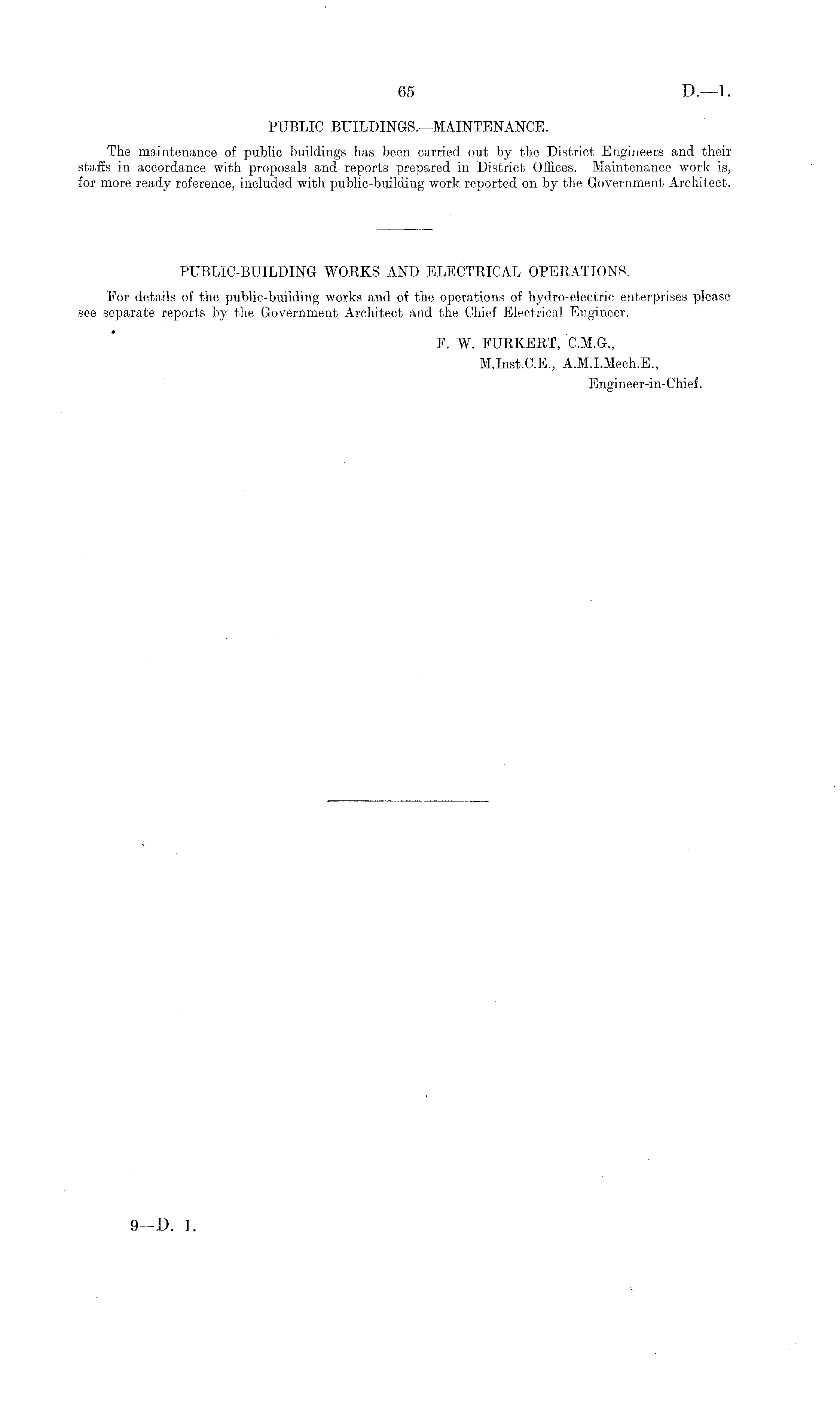 PUBLIC BUILDINGS. —MAINTENANCE. The maintenance of public buildings has been carried out by the District Engineers and their staffs in accordance with proposals and reports prepared in District Offices. Maintenance work is, for more ready reference, included with public-building work reported on by the Government Architect. PUBLIC-BUILDING WORKS AND ELECTRICAL OPERATIONS. For details of the public-building works and of the operations of hydro-electric enterprises please see separate reports by the Government Architect and the Chief Electrical Engineer. F. W. FURKERT, C.M.G., M.lnst.C.E., A.M.I.Mech.E., Engineer-in-Chief.