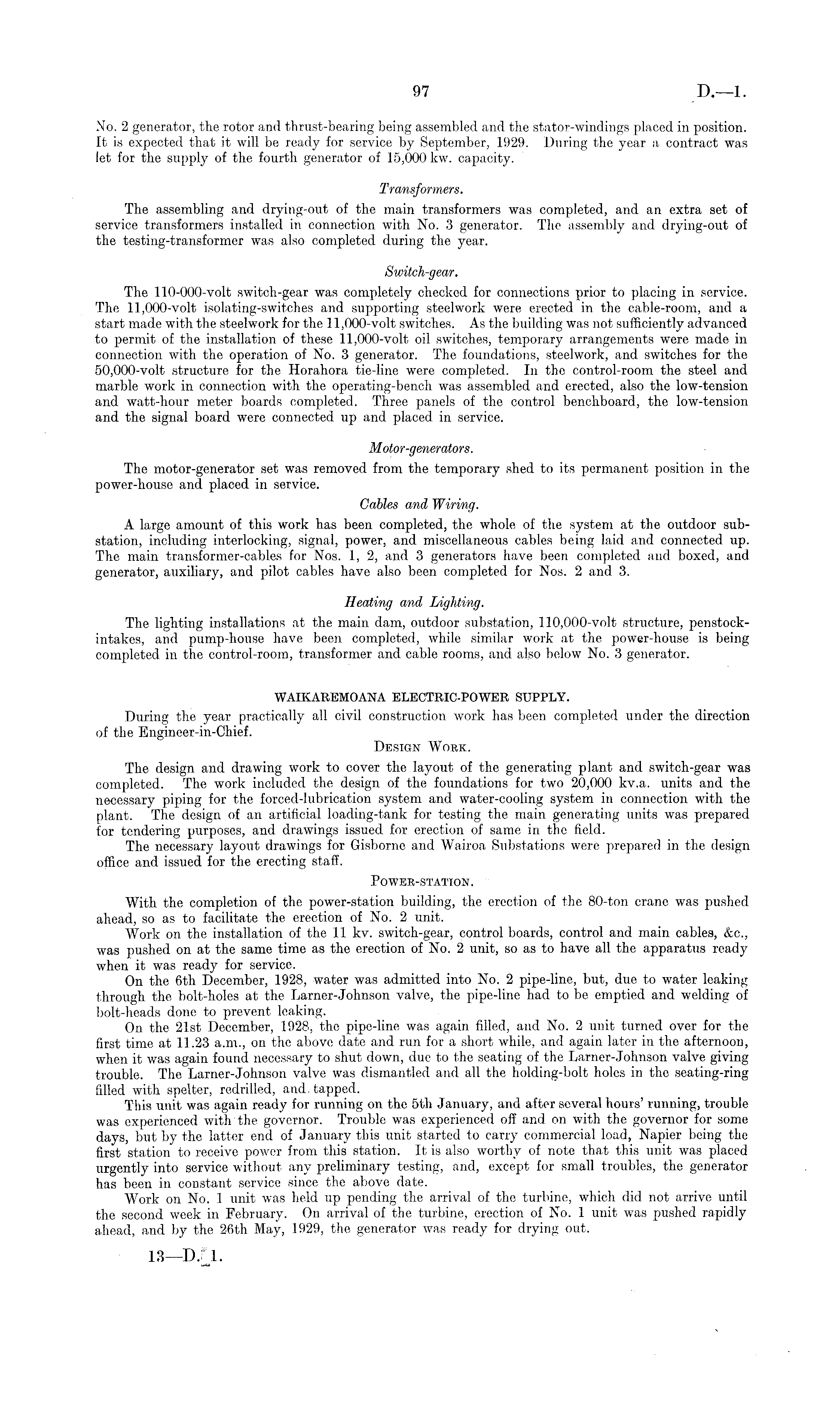 No. 2 generator, the rotor and thrust-bearing being assembled and the stator-windings placed in position. It is expected that it will be ready for service by September, 1929. During the year a contract was let for the supply of the fourth generator of 15,000 kw. capacity. Transformers. The assembling and drying-out of the main transformers was completed, and an extra set of service transformers installed in connection with No. 3 generator. The assembly and drying-out of the testing-transformer was also completed during the year. Switch-gear. The 110-000-volt switch-gear was completely checked for connections prior to placing in service. The 11,000-volt isolating-switches and supporting steelwork were erected in the cable-room, and a start made with the steelwork for the 11,000-volt switches. As the building was not sufficiently advanced to permit of the installation of these 11,000-volt oil switches, temporary arrangements were made in connection with the operation of No. 3 generator. The foundations, steelwork, and switches for the 50,000-volt structure for the Horahora tie-line were completed. In the control-room the steel and marble work in connection with the operating-bench was assembled and erected, also the low-tension and watt-hour meter boards completed. Three panels of the control benchboard, the low-tension and the signal board were connected up and placed in service. Motor-generators. The motor-generator set was removed from the temporary shed to its permanent position in the power-house and placed in service. Cables and Wiring. A large amount of this work has been completed, the whole of the system at the outdoor substation, including interlocking, signal, power, and miscellaneous cables being laid and connected up. The main transformer-cables for Nos. 1, 2, and 3 generators have been completed and boxed, and generator, auxiliary, and pilot cables have also been completed for Nos. 2 and 3. Heating and Lighting. The lighting installations at the main dam, outdoor substation, 110,000-volt structure, penstockintakes, and pump-house have been completed, while similar work at the power-house is being completed in the control-room, transformer and cable rooms, and also below No. 3 generator. WAIKAREMOANA ELECTRIC-POWER SUPPLY. During the year practically all civil construction work lias been completed under the direction of the Engineer-in-Chief. Design Work. The design and drawing work to cover the layout of the generating plant and switch-gear was completed. The work included the design of the foundations for two 20,000 kv.a. units and the necessary piping for the forced-lubrication system and water-cooling system in connection with the plant. The design of an artificial loading-tank for testing the main generating units was prepared for tendering purposes, and drawings issued for erection of same in the field. The necessary layout drawings for Gisborne and Wairoa Substations were prepared in the design office and issued for the erecting staff. Power-station. * With the completion of the power-station building, the erection of the 80-ton crane was pushed ahead, so as to facilitate the erection of No. 2 unit. Work on the installation of the 11 kv. switch-gear, control boards, control and main cables, &c., was pushed on at the same time as the erection of No. 2 unit, so as to have all the apparatus ready when it was ready for service. On the 6th December, 1928, water was admitted into No. 2 pipe-line, but, due to water leaking through the bolt-holes at the Larner-Johnson valve, the pipe-line had to be emptied and welding of bolt-heads done to prevent leaking. On the 21st December, 1928, the pipe-line was again filled, and No. 2 unit turned over for the first time at 11.23 a.m., on the above date and run for a short while, and again later in the afternoon, when it was again found necessary to shut down, due to the seating of the Larner-Johnson valve giving trouble. The Larner-Johnson valve was dismantled and all the holding-bolt holes in the seating-ring filled with spelter, redrilled, and. tapped. This unit was again ready for running on the sth January, and after several hours' running, trouble was experienced with the governor. Trouble was experienced off and on with the governor for some days, but by the latter end of January this unit started to carry commercial load, Napier being the first station to receive power from this station. It is also worthy of note that this unit was placed urgently into service without any preliminary testing, and, except for small troubles, the generator has been in constant service since the above date. Work on No. 1 unit was held up pending the arrival of the turbine, which did not arrive until the second week in February. On arrival of the turbine, erection of No. 1 unit w r as pushed rapidly ahead, and by the 26th May, 1929, the generator was ready for drying out.