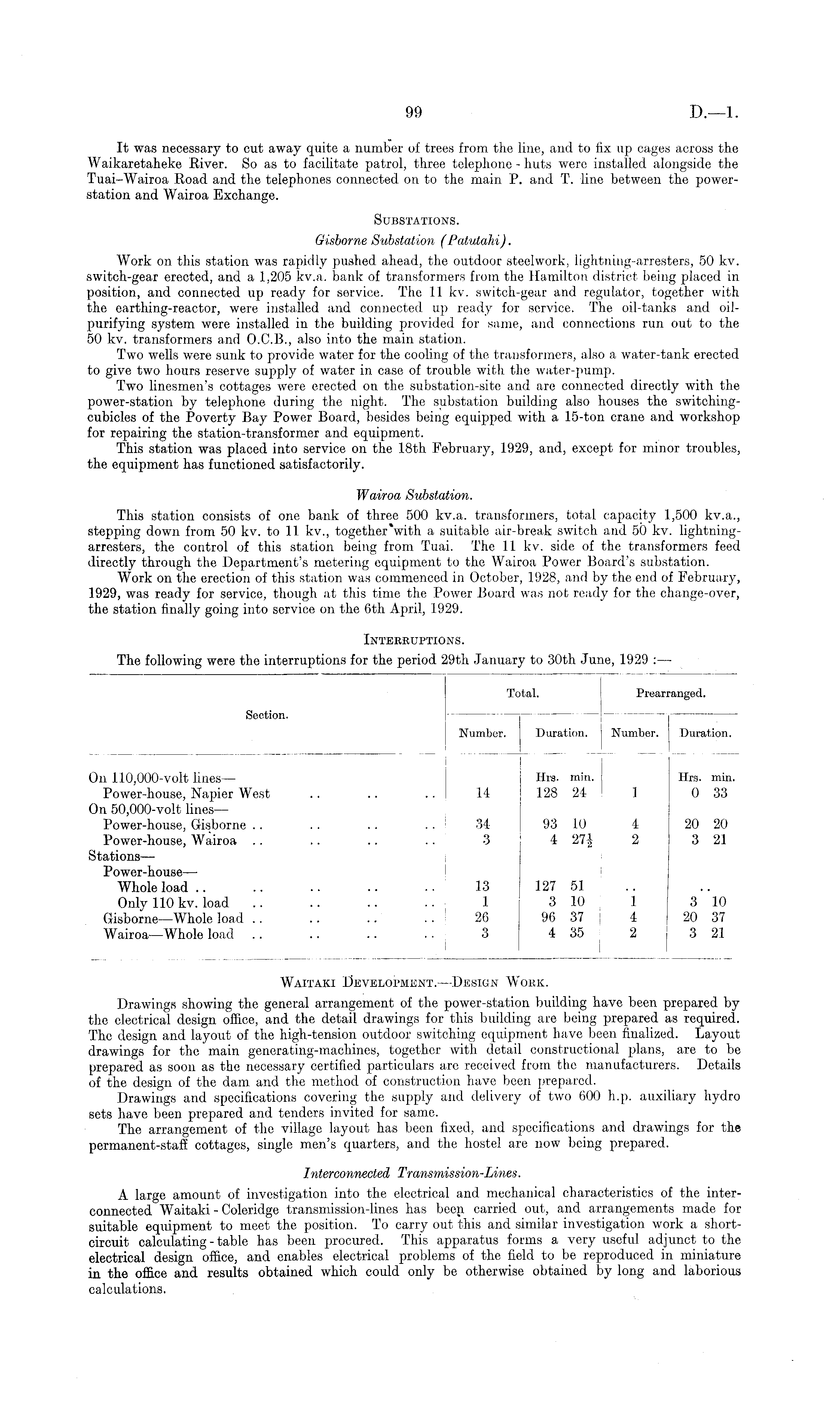 It was necessary to cut away quite a number of trees from the line, and to fix up cages across the Waikaretaheke River. So as to facilitate patrol, three telephone - huts were installed alongside the Tuai-Wairoa Road and the telephones connected on to the main P. and T. line between the powerstation and Wairoa Exchange. Substations. Gisborne Substation (Patutahi).. Work on this station was rapidly pushed ahead, the outdoor steelwork, lightning-arresters, 50 kv. switch-gear erected, and a 1,205 kv.a. bank of transformers from the Hamilton district being placed in position, and connected up ready for service. The 11 kv. switch-gear and regulator, together with the earthing-reactor, were installed and connected up ready for service. The oil-tanks and oilpurifying system were installed in the building provided for same, and connections run out to the 50 kv. transformers and 0.C.8., also into the main station. Two wells were sunk to provide water for the cooling of the transformers, also a water-tank erected to give two hours reserve supply of water in case of trouble with the water-pump. Two linesmen's cottages were erected on the substation-site and are connected directly with the power-station by telephone during the night. The substation building also houses the switchingcubicles of the Poverty Bay Power Board, besides being equipped with a 15-ton crane and workshop for repairing the station-transformer and equipment. This station was placed into service on the 18th February, 1929, and, except for minor troubles, the equipment has functioned satisfactorily. Wairoa Substation. This station consists of one bank of three 500 kv.a. transformers, total capacity 1,500 kv.a., stepping down from 50 kv. to 11 kv., together'with a suitable air-break switch and 50 kv. lightningarresters, the control of this station being from Tuai. The 11 kv. side of the transformers feed directly through the Department's metering equipment to the Wairoa Power Board's substation. Work on the erection of this station was commenced in October, 1928, and by the end of February, 1929, was ready for service, though at this time the Power Board was not ready for the change-over, the station finally going into service on the 6th April, 1929. Interruptions. The following were the interruptions for the period 29th January to 30th June, 1929 : —