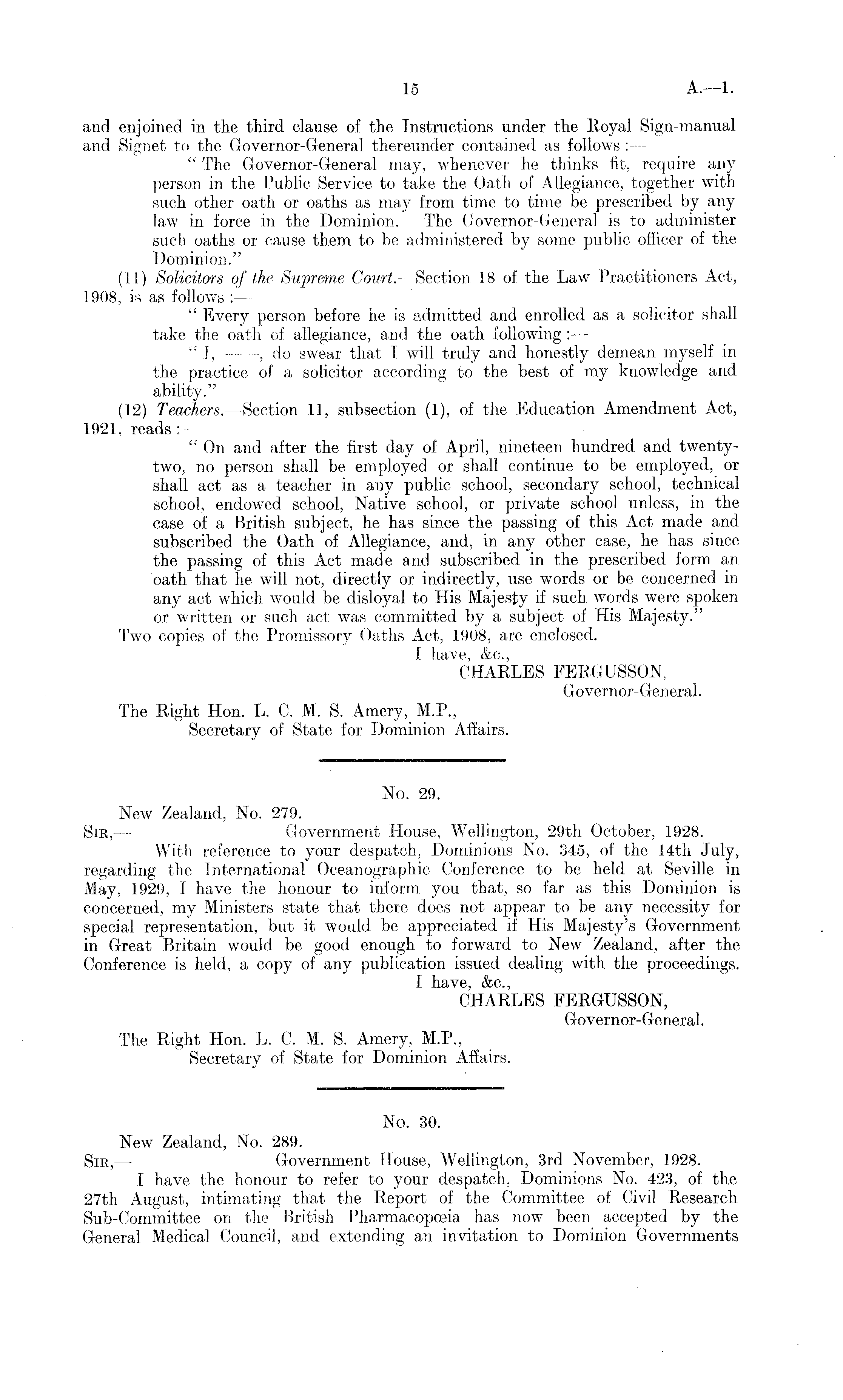 and enjoined in the third clause of the Instructions under the Royal Sign-manual and Signet to the Governor-General thereunder contained as follows : — " The Governor-General may, whenever he thinks fit, require any person in the Public Service to take the Oath of Allegiance, together with such other oath or oaths as may from time to time be prescribed by any law in force in the Dominion. The Governor-General is to administer such oaths or cause them to be administered by some public officer of the Dominion." (11) Solicitors of the Supreme Court. —Section 18 of the Law Practitioners Act, 1908, is as follows " Every person before he is admitted and enrolled as a solicitor shall take the oath of allegiance, and the oath following : — "I, — -, do swear that I will truly and honestly demean myself in the practice of a solicitor according to the best of my knowledge and ability." (12) Teachers. —Section 11, subsection (1), of the Education Amendment Act, 1921, reads:— " On and after the first day of April, nineteen hundred and twentytwo, no person shall be employed or shall continue to be employed, or shall act as a teacher in any public school, secondary school, technical school, endowed school, Native school, or private school unless, in the case of a British subject, he has since the passing of this Act made and subscribed the Oath of Allegiance, and, in any other case, he has since the passing of this Act made and subscribed in the prescribed form an oath that he will not, directly or indirectly, use words or be concerned in any act which would be disloyal to His Majesty if such words were spoken or written or such act was committed by a subject of His Majesty." Two copies of the Promissory Oaths Act, 1908, are enclosed. I have, &c., CHARLES FERGUSSON, Governor-General. The Right Hon. L. C. M. S. Amery, M.P., Secretary of State for Dominion Affairs.