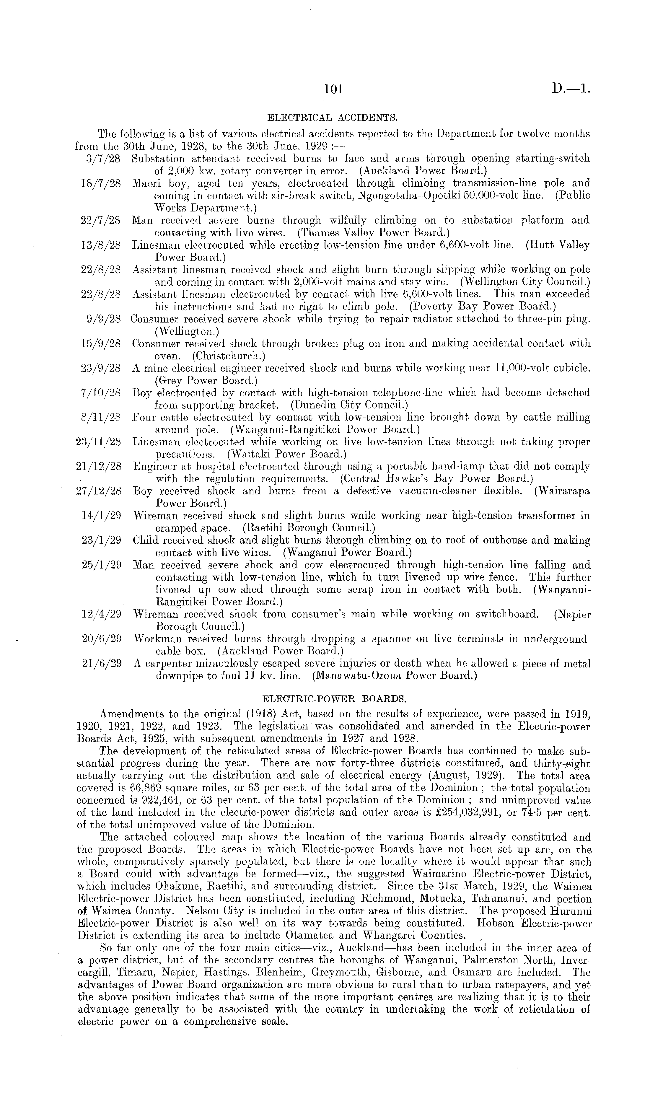 ELECTRICAL ACCIDENTS. The following is a list of various electrical accidents reported to the Department for twelve months from the 30th June, 1928, to the 30th June, 1929 : — 3/7/28 Substation attendant received burns to face and arms through opening starting-switch of 2,000 kw. rotary converter in error. (Auckland Power Board.) 18/7/28 Maori boy, aged ten years, electrocuted through climbing transmission-line pole and coming in contact with air-break switch, Ngongotaha-Opotiki 50,000-volt line. (Public Works Department.) 22/7/28 Man received severe burns through wilfully climbing on to substation platform and contacting with live wires. (Thames Yallev Power Board.) 13/8/28 Linesman electrocuted while erecting low-tension line under 6,600-volt line. (Hutt Valley Power Board.) 22/8/28 Assistant linesman received shock and slight burn through slipping while working on pole and coming in contact with 2,000-volt mains and stay wire. (Wellington City Council.) 22/8/28 Assistant linesman electrocuted by contact with live 6,600-volt lines. This man exceeded his instructions and had no right to climb pole. (Poverty Bay Power Board.) 9/9/28 Consumer received severe shock while trying to repair radiator attached to three-pin plug. (Wellington.) 15/9/28 Consumer received shock through broken plug on iron and making accidental contact with oven. (Christchurch.) 23/9/28 A mine electrical engineer received shock and burns while working near 11,000-volt cubicle. (Grey Power Board.) 7/10/28 Boy electrocuted by contact with high-tension telephone-line which had become detached from supporting bracket. (Dunedin City Council.) 8/11/28 Four cattle electrocuted by contact with low-tension line brought down by cattle milling around pole. (Wanganui-Rangitikei Power Board.) 23/11/28 Linesman electrocuted while working on live low-tension lines through not taking proper precautions. (Waitaki Power Board.) 21/12/28 Engineer at hospital electrocuted through using a portable hand-lamp that did not comply with the regulation requirements. (Central Hawke's Bay Power Board.) 27/12/28 Boy received shock and burns from a defective vacuum-cleaner flexible. (Wairarapa Power Board.) 14/1/29 Wireman received shock and slight burns while working near high-tension transformer in cramped space. (Raetihi Borough Council.) 23/1/29 Child received shock and slight burns through climbing on to roof of outhouse and making contact with live wires. (Wanganui Power Board.) 25/1/29 Man received severe shock and cow electrocuted through high-tension line falling and contacting with low-tension line, which in turn livened up wire fence. This further livened up cow-shed through some scrap iron in contact with both. (WanganuiRangitikei Power Board.) 12/4/29 Wireman received shock from consumer's main while working on switchboard. (Napier Borough Council.) 20/6/29 Workman received burns through dropping a spanner on live terminals in undergroundcable box. (Auckland Power Board.) 21/6/29 A carpenter miraculously escaped severe injuries or death when he allowed a piece of metal downpipe to foul 11 kv. line. (Manawatu-Oroua Power Board.) ELECTRIC-POWER BOARDS. Amendments to the original (1918) Act, based on the results of experience, were passed in 1919, 1920, 1921, 1922, and 1923. The legislation was consolidated and amended in the Electric-power Boards Act, 1925, with subsequent amendments in 1927 and 1928. The development of the reticulated areas of Electric-power Boards has continued to make substantial progress during the year. There are now forty-three districts constituted, and thirty-eight actually carrying out the distribution and sale of electrical energy (August, 1929). The total area covered is 66,869 square miles, or 63 per cent, of the total area of the Dominion ; the total population concerned is 922,464, or 63 per cent, of the total population of the Dominion ; and unimproved value of the land included in the electric-power districts and outer areas is £254,032,991, or 74-5 per cent, of the total unimproved value of the Dominion. The attached coloured map shows the location of the various Boards already constituted and the proposed Boards. The areas in which Electric-power Boards have not been set up are, on the whole, comparatively sparsely populated, but there is one locality where it would appear that such a Board could with advantage be formed —viz., the suggested Waimarino Electric-power District, which includes Ohakune, Raetihi, and surrounding district. Since the 31st March, 1929, the Waimea Electric-power District has been constituted, including Richmond, Motueka, Tahunanui, and portion of Waimea County. Nelson City is included in the outer area of this district. The proposed Hurunui Electric-power District is also well on its way towards being constituted. Hobson Electric-power District is extending its area to include Otamatea and Whangarei Counties. So far only one of the four main cities —viz., Auckland —has been included in the inner area of a power district, but of the secondary centres the boroughs of Wanganui, Palmerston North, Invercargill, Timaru, Napier, Hastings, Blenheim, Greymouth, Gisborne, and Oamaru are included. The advantages of Power Board organization are more obvious to rural than to urban ratepayers, and yet the above position indicates that some of the more important centres are realizing that it is to their advantage generally to be associated with the country in undertaking the work of reticulation of electric power on a comprehensive scale.