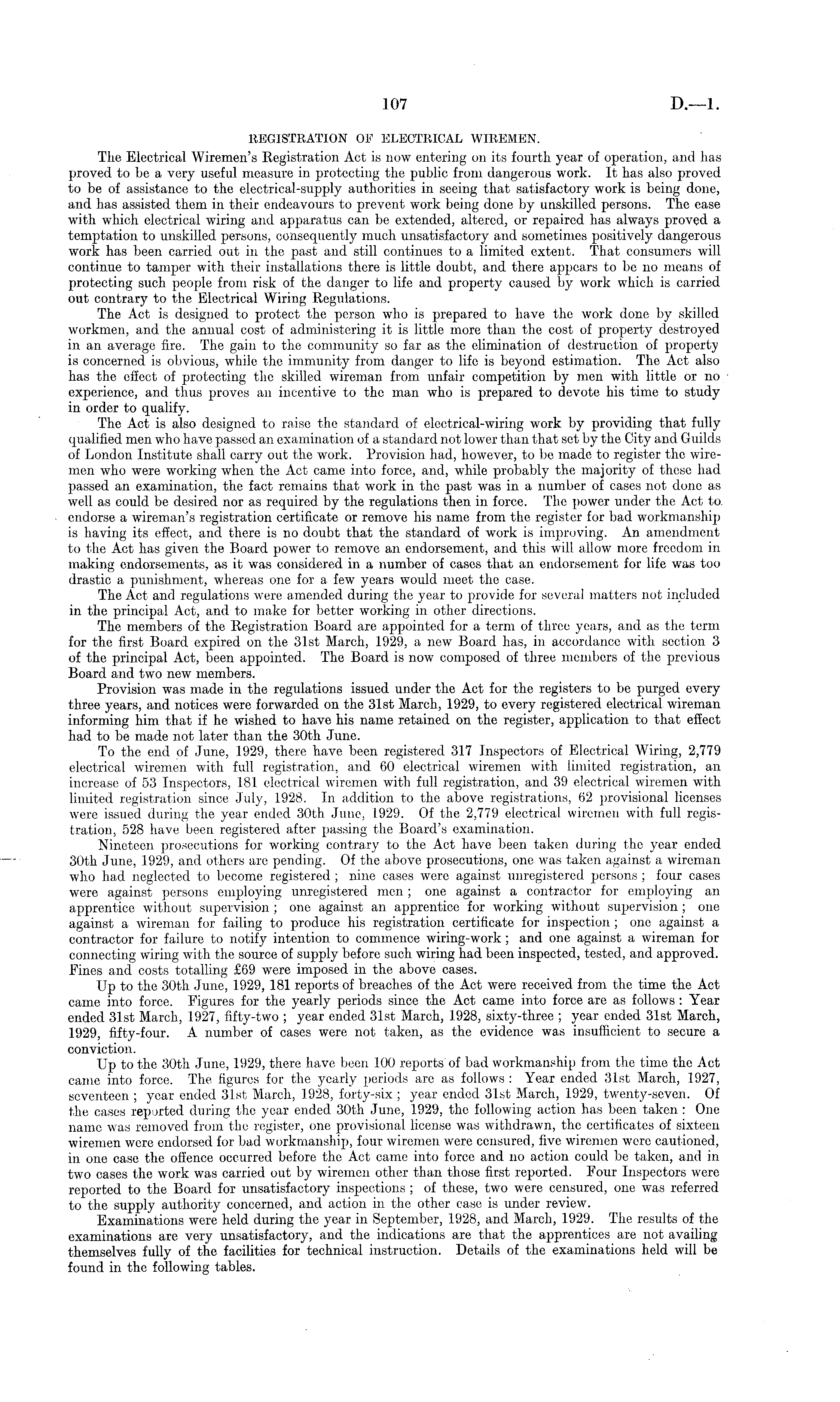 REGISTRATION of electrical wiremen. Tlxe Electrical Wiremen's Registration Act is now entering 011 its fourth year of operation, and has proved to be a very useful measure in protecting the public from dangerous work. It has also proved to be of assistance to the electrical-supply authorities in seeing that satisfactory work is being done, and has assisted them in their endeavours to prevent work being done by unskilled persons. The ease with which electrical wiring and apparatus can be extended, altered, or repaired has always proved a temptation to unskilled persons, consequently much unsatisfactory and sometimes positively dangerous work has been carried out in the past and still continues to a limited extent. That consumers will continue to tamper with their installations there is little doubt, and there appears to be no means of protecting such people from risk of the danger to life and property caused by work which is carried out contrary to the Electrical Wiring Regulations. The Act is designed to protect the person who is prepared to have the work done by skilled workmen, and the annual cost of administering it is little more than the cost of property destroyed in an average fire. The gain to the community so far as the elimination of destruction of property is concerned is obvious, while the immunity from danger to life is beyond estimation. The Act also has the effect of protecting the skilled wireman from unfair competition by men with little or no experience, and thus proves an incentive to the man who is prepared to devote his time to study in order to qualify. The Act is also designed to raise the standard of electrical-wiring work by providing that fully qualified men who have passed an examination of a standard not lower than that set by the City and Guilds of London Institute shall carry out the work. Provision had, however, to be made to register the wiremen who were working when the Act came into force, and, while probably the majority of these had passed an examination, the fact remains that work in the past was in a number of cases not done as well as could be desired nor as required by the regulations then in force. The power under the Act to. endorse a wireman's registration certificate or remove his name from the register for bad workmanshij) is having its eflect, and there is no doubt that the standard of work is improving. An amendment to the Act has given the Board power to remove an endorsement, and this will allow more freedom in making endorsements, as it was considered in a number of cases that an endorsement for life was too drastic a punishment, whereas one for a few years would meet the case. The Act and regulations were amended during the year to provide for several matters not included in the principal Act, and to make for better working in other directions. The members of the Registration Board are appointed for a term of three years, and as the term for the first Board expired on the 31st March, 1929, a new Board has, in accordance with section 3 of the principal Act, been appointed. The Board is now composed of three members of the previous Board and two new members. Provision was made in the regulations issued under the Act for the registers to be purged every three years, and notices were forwarded on the 31st March, 1929, to every registered electrical wireman informing him that if he wished to have his name retained on the register, application to that effect had to be made not later than the 30th June. To the end of June, 1929, there have been registered 317 Inspectors of Electrical Wiring, 2,779 electrical wiremen with full registration, and 60 electrical wiremen with limited registration, an increase of 53 Inspectors, 181 electrical wiremen with full registration, and 39 electrical wiremen with limited registration since July, 1928. In addition to the above registrations, 62 provisional licenses were issued during the year ended 30th June, 1929. Of the 2,779 electrical wiremen with full registration, 528 have been registered after passing the Board's examination. Nineteen prosecutions for working contrary to the Act have been taken during the year ended 30th June, 1929, and others are pending. Of the above prosecutions, one was taken against a wireman who had neglected to become registered ; nine cases were against unregistered persons ; four cases were against persons employing unregistered men; one against a contractor for employing an apprentice without supervision ; one against an apprentice for working without supervision ; one against a wireman for failing to produce his registration certificate for inspection ; one against a contractor for failure to notify intention to commence wiring-work ; and one against a wireman for connecting wiring with the source of supply before such wiring had been inspcctcd, tested, and approved. Fines and costs totalling £69 were imposed in the above cases. Up to the 30th June, 1929, 181 reports of breaches of the Act were received from the time the Act came into force. Figures for the yearly periods since the Act came into force are as follows: Year ended 31st March, 1927, fifty-two ; year ended 31st March, 1928, sixty-three ; year ended 31st March, 1929, fifty-four. A number of cases were not taken, as the evidence was insufficient to secure a conviction. Up to the 30th June, 1929, there have been 100 reports of bad workmanship from the time the Act came into force. The figures for the yearly periods are as follows: Year ended 31st March, 1927, seventeen ; year ended 31st March, 1928, forty-six ; year ended 31st March, 1929, twenty-seven. Of the cases reported during the year ended 30th June, 1929, the following action has been taken : One name was removed from the register, one provisional license was withdrawn, the certificates of sixteen wiremen were endorsed for bad workmanship, four wiremen were censured, five wiremen were cautioned, in one case the offence occurred before the Act came into force a