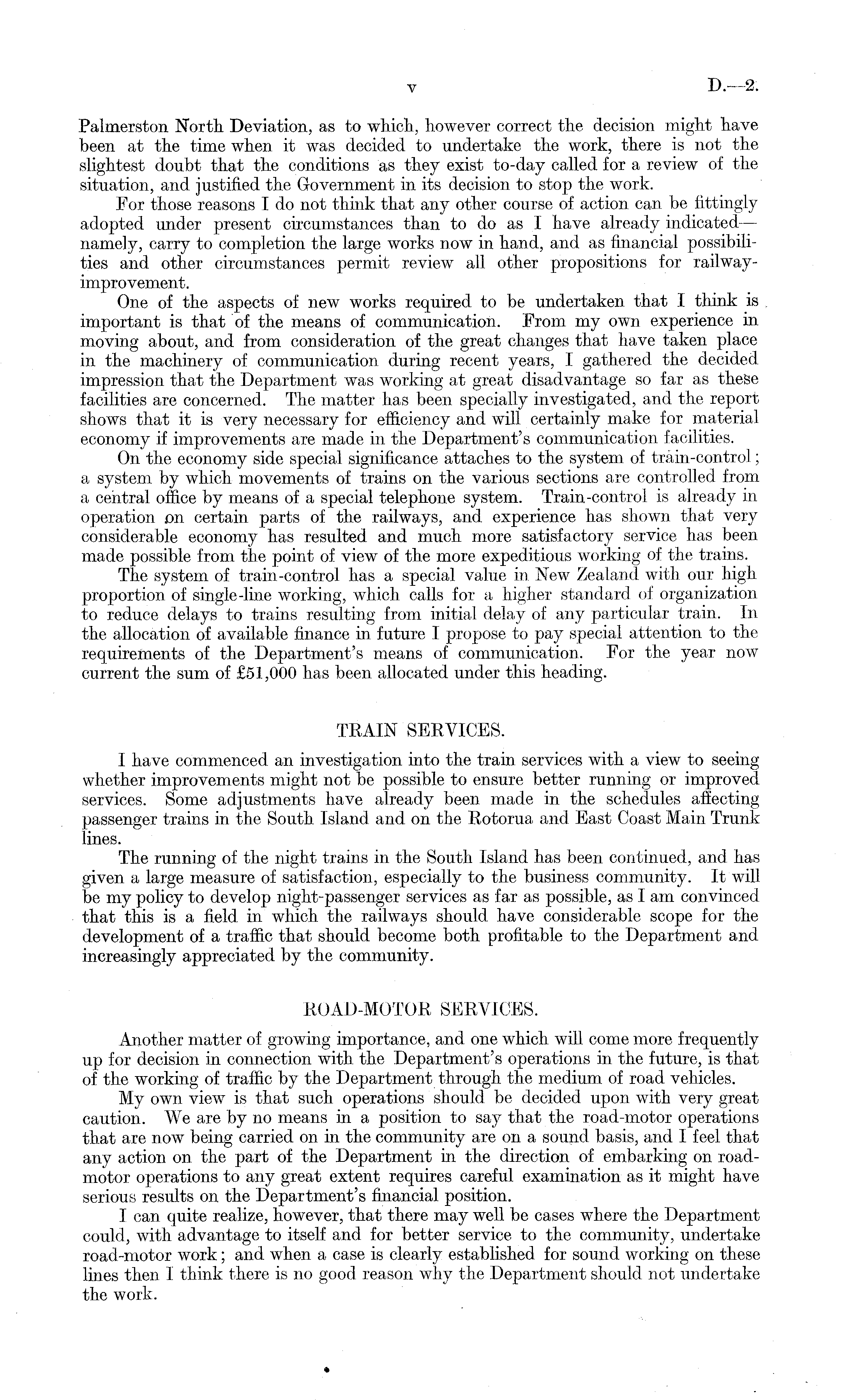 Palmerston. North. Deviation, as to which, however correct the decision might have been at the time when it was decided to undertake the work, there is not the slightest doubt that the conditions as they exist to-day called for a review of the situation, and justified the Government in its decision to stop the work. For those reasons I do not think that any other course of action can be fittingly adopted under present circumstances than to do as I have already indicated — namely, carry to completion the large works now in hand, and as financial possibilities and other circumstances permit review all other propositions for railwayimprovement. One of the aspects of new works required to be undertaken that I think is important is that of the means of communication. From my own experience in moving about, and from consideration of the great changes that have taken place in the machinery of communication during recent years, I gathered the decided impression that the Department was working at great disadvantage so far as these facilities are concerned. The matter has been specially investigated, and the report shows that it is very necessary for efficiency and will certainly make for material economy if improvements are made in the Department's communication facilities. On the economy side special significance attaches to the system of train-control; a system by which movements of trains on the various sections are controlled from a central office by means of a special telephone system. Train-control is already in operation on certain parts of the railways, and experience has shown that very considerable economy has resulted and much more satisfactory service has been made possible from the point of view of the more expeditious working of the trains. The system of train-control has a special value in New Zealand with our high proportion of single-line working, which calls for a higher standard of organization to reduce delays to trains resulting from initial delay of any particular train. In the allocation of available finance in future I propose to pay special attention to the requirements of the Department's means of communication. For the year now current the sum of £51,000 has been allocated under this heading. TRAIN SERVICES. I have commenced an investigation into the train services with a view to seeing whether improvements might not be possible to ensure better running or improved services. Some adjustments have already been made in the schedules affecting passenger trains in the South Island and on the Rotorua and East Coast Main Trunk lines. The running of the night trains in the South Island has been continued, and has given a large measure of satisfaction, especially to the business community. It will be my policy to develop night-passenger services as far as possible, as I am convinced that this is a field in which the railways should have considerable scope for the development of a traffic that should become both profitable to the Department and increasingly appreciated by the community. ROAD-MOTOR SERVICES. Another matter of growing importance, and one which will come more frequently up for decision in connection with the Department's operations in the future, is that of the working of traffic by the Department through the medium of road vehicles. My own view is that such operations should be decided upon with very great caution. We are by no means in a position to say that the road-motor operations that are now being carried on in the community are on a sound basis, and I feel that any action on the part of the Department in the direction of embarking on roadmotor operations to any great extent requires careful examination as it might have serious results on the Department's financial position. I can quite realize, however, that there may well be cases where the Department could, with advantage to itself and for better service to the community, undertake road-motor work; and when a case is clearly established for sound working on these lines then I think there is no good reason why the Department should not undertake the work.