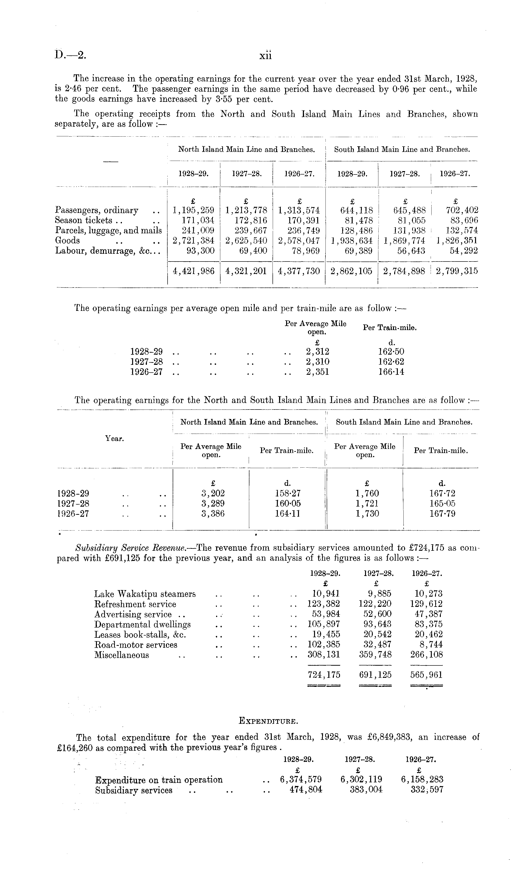 Subsidiary Service Revenue. —The revenue from subsidiary services amounted to £724,175 as compared with £691,125 for the previous year, and an analysis of the figures is as follows : — 1928-29. 1927-28. 1926-27. £ £ £ Lake Wakatipu steamers .. .. .. 10,941 9,885 10,273 Refreshment service .. .. .. 123,382 122,220 129,612 Advertising service .. .. .. .. 53,984 52,600 47,387 Departmental dwellings .. .. .. 105,897 93,643 83,375 Leases book-stalls, &c. .. .. .. 19,455 20,542 20,462 Road-motor services .. .. .. 102,385 32,487 8,744 Miscellaneous .. .. .. .. 308,131 359,748 266,108 724,175 691,125 565,961 Expenditure. The total expenditure for the year ended 31st March, 1928, was £6,849,383, an increase of £164,260 as compared with the previous year's figures . 1928-29. 1927-28. 1926-27. £ £ £ Expenditure on train operation .. 6,374,579 6,302,119 6,158,283 Subsidiary services .. .. .. 474,804 383,004 332,597
