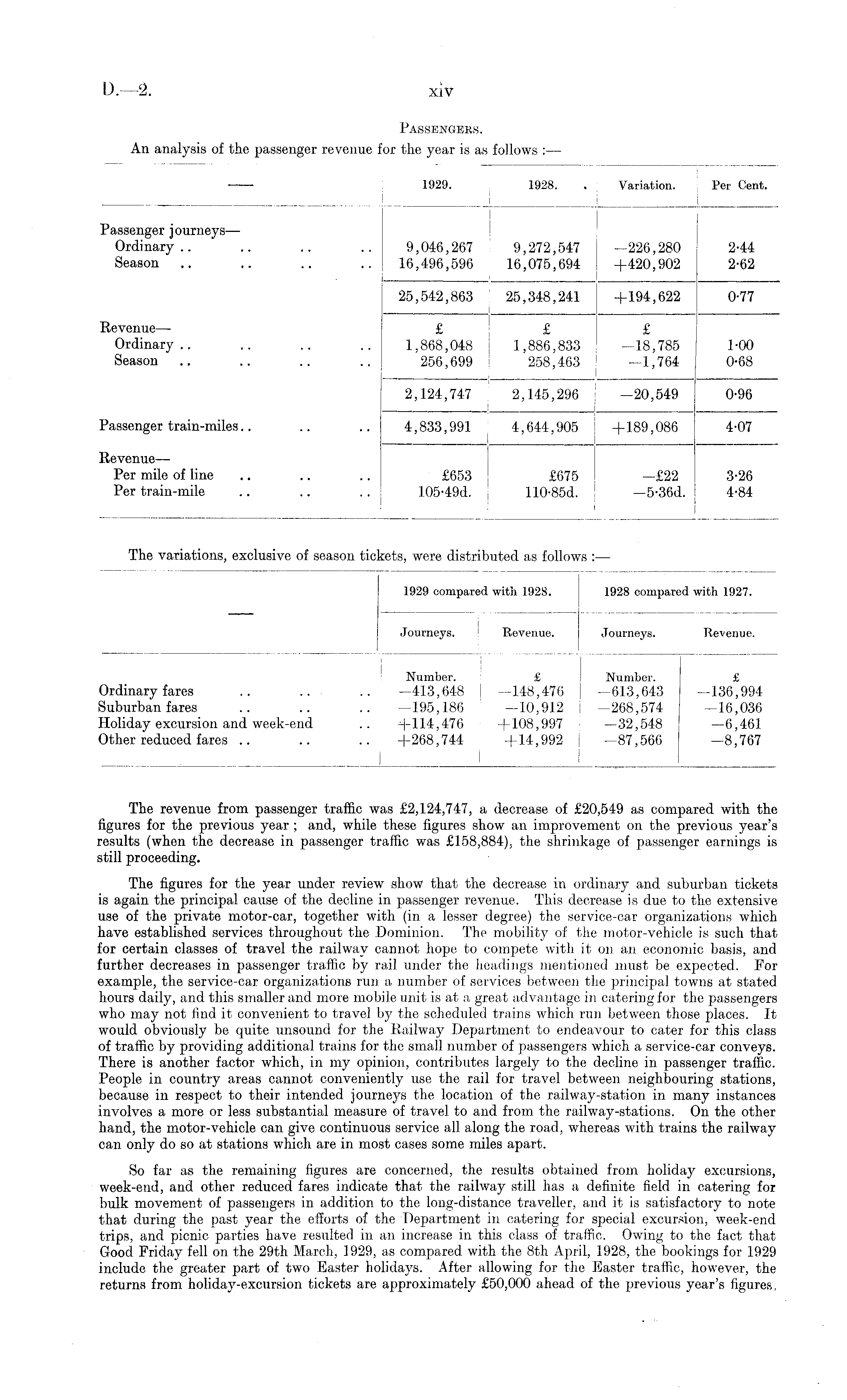 1929. 1928. . Variation. Per Cent. | I Passenger journeys— Ordinary.. .. ,. .. 9,046,267 9,272,547 -226,280 2-44 Season .. .. .. .. 16,496,596 16,075,694 +420,902 2-62 25,542,863 25,348,241 +194,622 0-77 Revenue— £ £ £ Ordinary.. .. .. .. 1,868,048 1,886,833 -18,785 1-00 Season .. .. .. .. 256,699 258,463 -1,764 0-68 2,124,74-7 2,145,296 -20,549 0-96 Passenger train-miles.. .. .. 4,833,991 4,644,905 +189,086 4-07 Revenue— Per mile of line .. .. .. £653 £675 -£22 3-26 Per train-mile .. .. . . 105-49d. 110-85d. —5-36d. 4-84