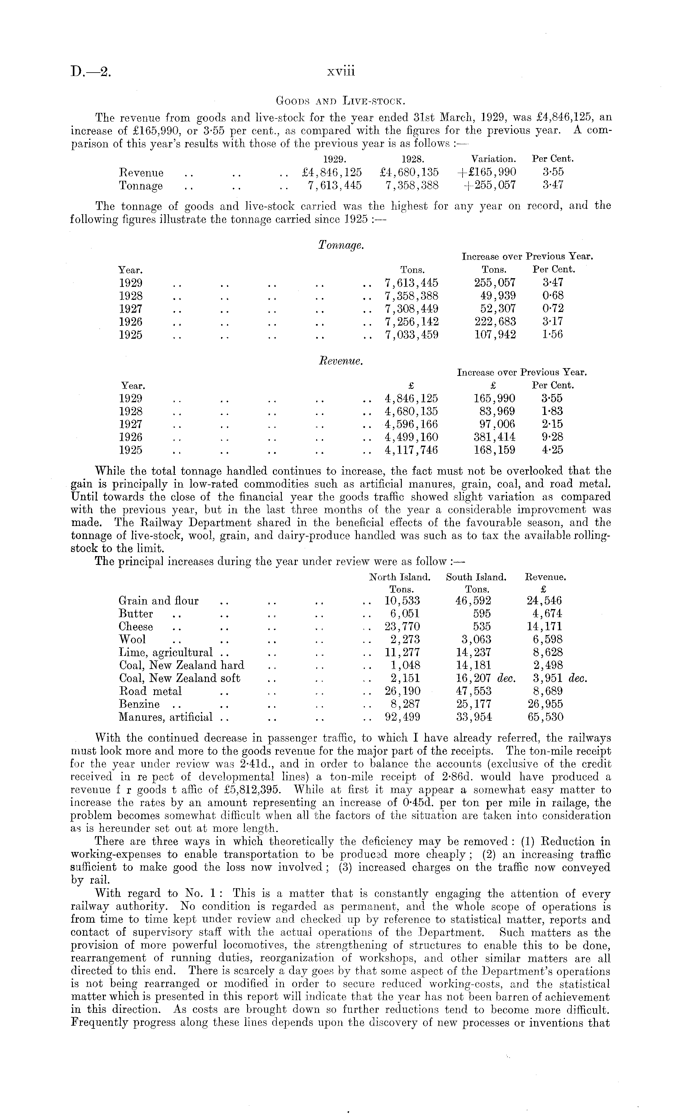 Goods and Live-stock. The revenue from goods and live-stock for the year ended 31st March, 1929, was £4,846,125, an increase of £165,990, or 3-55 per cent., as compared with the figures for the previous year. A comparison of this year's results with those of the previous year is as follows : — 1929. 1928. Variation. Per Cent. Revenue .. .. .. £4,846,125 £4,680,135 +£165,990 3-55 Tonnage .. .. .. 7,613,445 7,358,388 +-255,057 3-47 The tonnage of goods and live-stock carried was the highest for any year on record, and the following figures illustrate the tonnage carried since 1925 : — Tonnage. Increase over Previous Year. Year. Tons. Tons. Per Cent. 1929 .. .. .. .. .. 7,613,445 255,057 3-47 1928 .. .. .. .. .. 7,358,388 49,939 0-68 1927 .. .. .. .. .. 7,308,449 52,307 0-72 1926 .. .. .. .. .. 7,256,142 222,683 3-17 1925 .. .. .. .. .. 7,033,459 107,942 1-56 Revenue. Increase over Previous Year. Year. £ £ Per Cent. 1929 .. .. .. .. .. 4,846,125 165,990 3-55 1928 .. .. .. .. .. 4,680,135 83,969 1-83 1927 .. .. .. .. .. 4,596,166 97.006 2-15 1926 .. .. .. .. .. 4,499,160 381,414 9-28 1925 .. .. .. .. .. 4,117,746 168,159 4-25 While the total tonnage handled continues to increase, the fact must not be overlooked that the gain is principally in low-rated commodities such as artificial manures, grain, coal, and road metal. Until towards the close of the financial year the goods traffic showed slight variation as compared with the previous year, but in the last three months of the year a considerable improvement was made. The Railway Department shared in the beneficial effects of the favourable season, and the tonnage of live-stock, wool, grain, and dairy-produce handled was such as to tax the available rollingstock to the limit. The principal increases during the year under review were as follow : — North Island. South Island. Revenue. Tons. Tons. £ Grain and flour .. .. .. ..10,533 46,592 24,546 Butter .. .. .. .. .. 6,051 595 4,674 Cheese .. .. .. .. ~ 23,770 535 14,171 Wool .. .. .. .. .. 2,273 3,063 6,598 Lime, agricultural .. .. .. .. 11,277 14,237 8,628 Coal, New Zealand hard .. .. .. 1,048 14,181 2,498 Coal, New Zealand soft ~ .. .. 2,151 16,207 dec. 3,951 dec. Road metal .. .. .. .. 26,190 47,553 8,689 Benzine .. .. .. .. .. 8,287 25,177 26,955 Manures, artificial .. .. .. .. 92,499 33,954 65,530 With the continued decrease in passenger traffic, to which I have already referred, the railways must look more and more to the goods revenue for the major part of the receipts. The ton-mile receipt for the year under review was 2-41 d., and in order to balance the accounts (exclusive of the credit received in re pect of developmental lines) a ton-mile receipt of 2-86 d. would have produced a revenue f r goods t affic of £5,812,395. While at first it may appear a somewhat easy matter to increase the rates by an amount representing an increase of 0-45 d. per ton per mile in railage, the problem becomes somewhat difficult when all the factors of the situation are taken into consideration as is hereunder set out at more length. There are three ways in which theoretically the deficiency may be removed : (1) Reduction in working-expenses to enable transportation to be produced more cheaply ; (2) an increasing traffic sufficient to make good the loss now iuvolved ; (3) increased charges on the traffic now conveyed by rail. With regard to No. 1 : This is a matter that is constantly engaging the attention of every railway authority. No condition is regarded as permanent, and the whole scope of operations is from time to time kept under review and checked up by reference to statistical matter, reports and contact of supervisory staff with the actual operations of the Department. Such matters as the provision of more powerful locomotives, the strengthening of structures to enable this to be done, rearrangement of running duties, reorganization of workshops, and other similar matters are all directed to this end. There is scarcely a day goes by that some aspect of the Department's operations is not being rearranged or modified in order to secure reduced working-costs, and the statistical matter which is presented in this report will indicate that the year has not been barren of achievement in this direction. As costs are brought down so further reductions tend to become more difficult. Frequently progress along these lines depends upon the discovery of new processes or inventions that