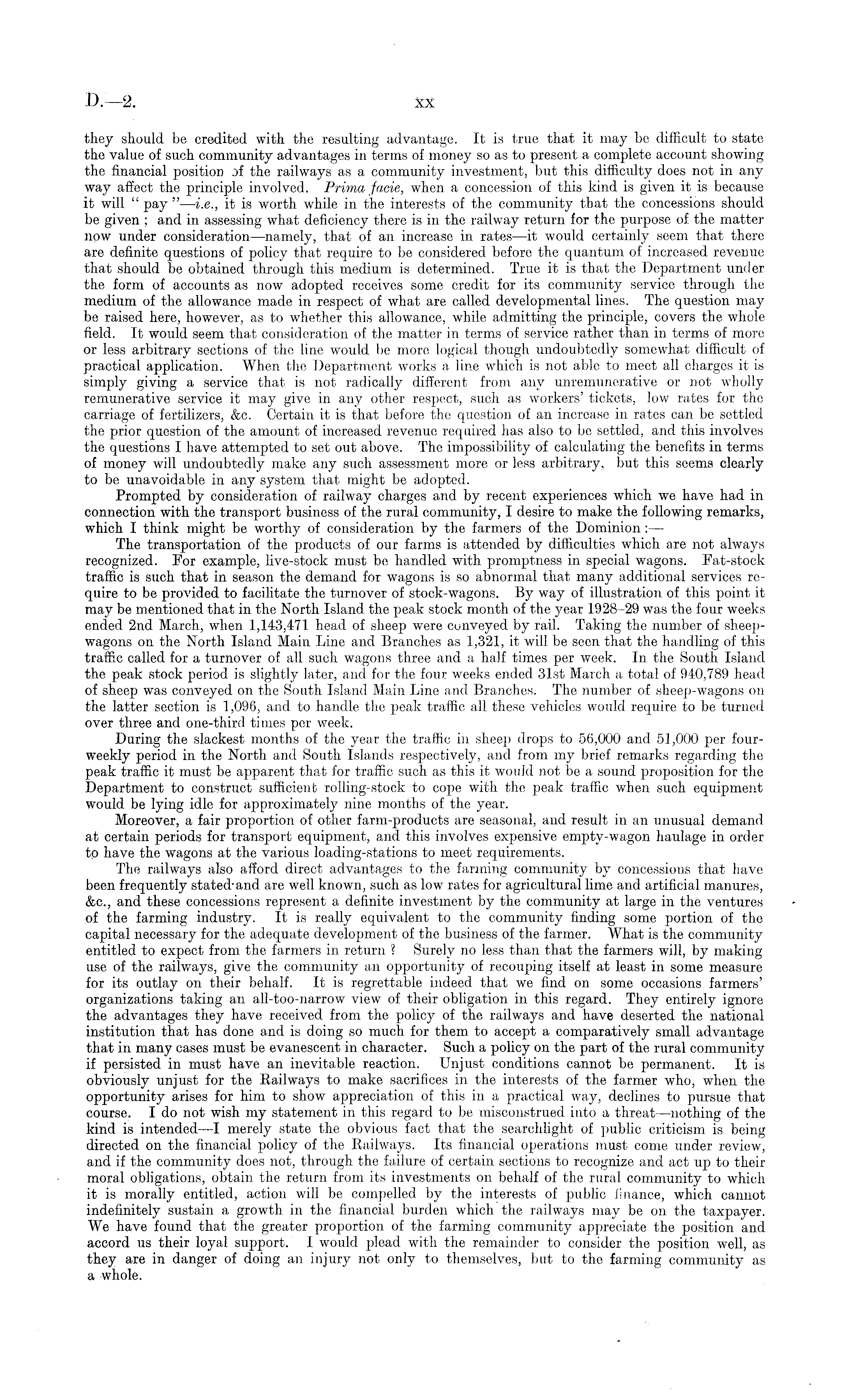 they should be credited with the resulting advantage. It is true that it may be difficult to state the value of such community advantages in terms of money so as to present a complete account showing the financial position of the railways as a community investment, but this difficulty does not in any way affect the principle involved. Prima facie, when a concession of this kind is given it is because it will " pay " —i.e., it is worth while in the interests of the community that the concessions should be given ; and in assessing what deficiency there is in the railway return for the purpose of the matter now under consideration —namely, that of an increase in rates —it would certainly seem that there are definite questions of policy that require to be considered before the quantum of increased revenue that should be obtained through this medium is determined. True it is that the Department under the form of accounts as now adopted receives some credit for its community service through the medium of the allowance made in respect of what are called developmental lines. The question may be raised here, however, as to whether this allowance, while admitting the principle, covers the whole field. It would seem that consideration of the matter in terms of service rather than in terms of more or less arbitrary sections of the line would be more logical though undoubtedly somewhat difficult of practical application. When the Department works a line which is not able to meet all charges it is simply giving a service that is not radically different from any unremunerative or not wholly remunerative service it may give in any other respect, such as workers' tickets, low rates for the carriage of fertilizers, &c. Certain it is that before the question of an increase in rates can be settled the prior question of the amount of increased revenue required has also to be settled, and this involves the questions I have attempted to set out above. The impossibility of calculating the benefits in terms of money will undoubtedly make any such assessment more or less arbitrary, but this seems clearly to be unavoidable in any system that might be adopted. Prompted by consideration of railway charges and by recent experiences which we have had in connection with the transport business of the rural community, I desire to make the following remarks, which I think might be worthy of consideration by the farmers of the Dominion : — The transportation of the products of our farms is attended by difficulties which are not always recognized. For example, live-stock must be handled with promptness in special wagons. Fat-stock traffic is such that in season the demand for wagons is so abnormal that many additional services require to be provided to facilitate the turnover of stock-wagons. By way of illustration of this point it may be mentioned that in the North Island the peak stock month of the year 1928-29 was the four weeks ended 2nd March, when 1,143,471 head of sheep were conveyed by rail. Taking the number of sheepwagons on the North Island Main Line and Branches as 1,321, it will be seen that the handling of this traffic called for a turnover of all such wagons three and a half times per week. In the South Island the peak stock period is slightly later, and for the four weeks ended 31st March a total of 940,789 head of sheep was conveyed on the South Island Main Line and Branches. The number of sheep-wagons on the latter section is 1,096, and to handle the peak traffic all these vehicles would require to be turned over three and one-third times per week. During the slackest months of the year the traffic in sheep drops to 56,000 and 51,000 per fourweekly period in the North and South Islands respectively, and from my brief remarks regarding the peak traffic it must be apparent that for traffic such as this it would not be a sound proposition for the Department to construct sufficient rolling-stock to cope with the peak traffic when such equipment would be lying idle for approximately nine months of the year. Moreover, a fair proportion of other farm-products are seasonal, and result in an unusual demand at certain periods for transport equipment, and this involves expensive empty-wagon haulage in order to have the wagons at the various loading-stations to meet requirements. The railways also afford direct advantages to the farming community by concessions that have been frequently stated - and are well known, such as low rates for agricultural lime and artificial manures, &c., and these concessions represent a definite investment by the community at large in the ventures of the farming industry. It is really equivalent to the community finding some portion of the capital necessary for the adequate development of the business of the farmer. What is the community entitled to expect from the farmers in return ? Surely no less than that the farmers will, by making use of the railways, give the community an opportunity of recouping itself at least in some measure for its outlay on their behalf. It is regrettable indeed that we find on some occasions farmers' organizations taking an all-too-narrow view of their obligation in this regard. They entirely ignore the advantages they have received from the policy of the railways and have deserted the national institution that has done and is doing so much for them to accept a comparatively small advantage that in many cases must be evanescent in character. Such a policy on the part of the rural community if persisted in must have an inevitable reaction. Unjust conditions cannot be permanent. It is obviously unjust for the Railways to make sacrifices in the interests of the farmer who, when the opportunity arises for him to show appreciation of this in a practical way, declines to pursue that course. Ido not wish my statement in this regard to be misconstrued into a threat—nothing of the kind is intended —I merely state the obvious fact that the searchlight of pu