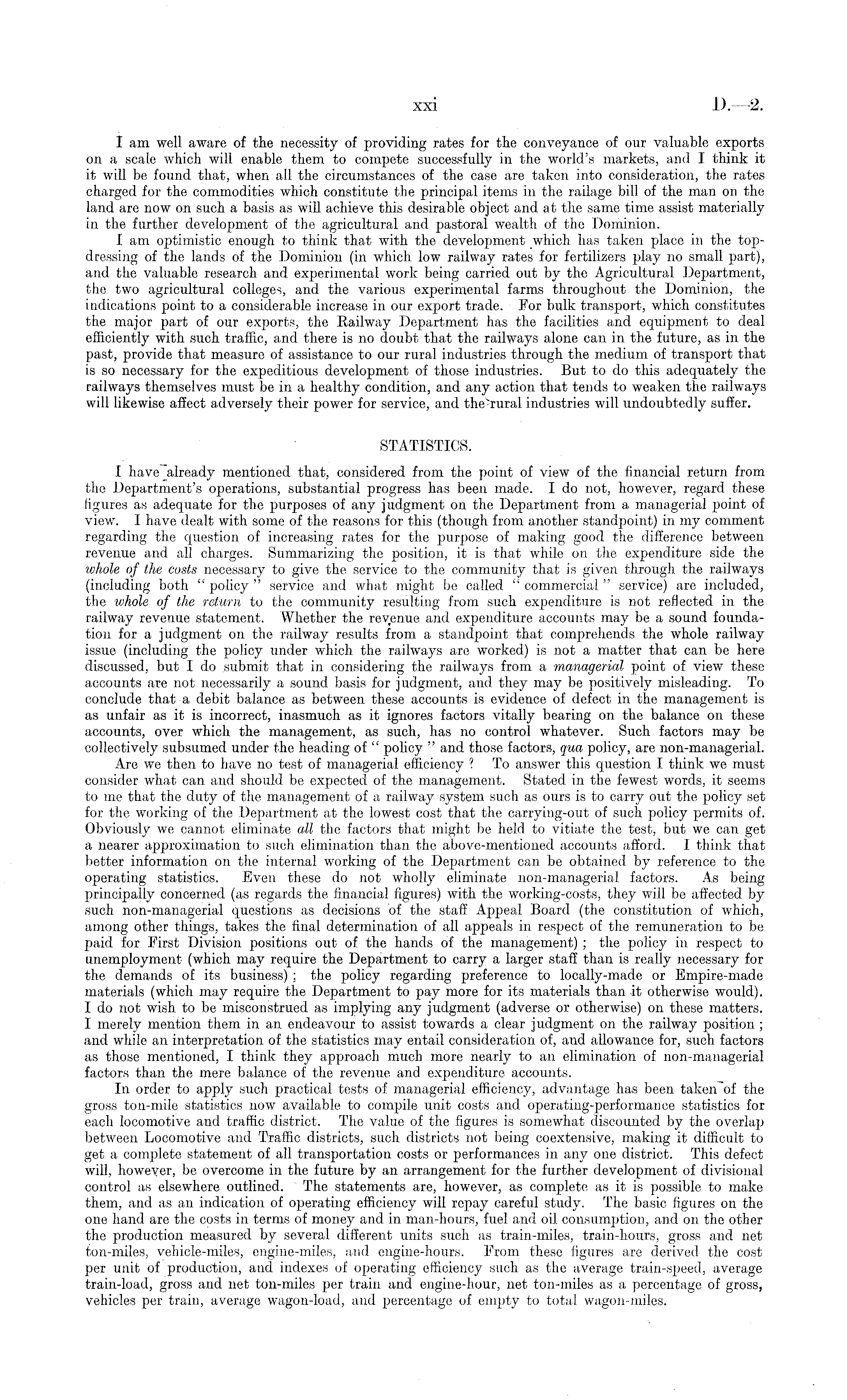 I am well aware of the necessity of providing rates for tlie conveyance of our valuable exports on a scale which will enable them to compete successfully in the world's markets, and I think it it will be found that, when all the circumstances of the case are taken into consideration, the rates charged for the commodities which constitute the principal items in the railage bill of the man on the land are now on such a basis as will achieve this desirable object and at the same time assist materially in the further development of the agricultural and pastoral wealth of the Dominion. I am optimistic enough to think that with the development which has taken place in the topdressing of the lands of the Dominion (in which low railway rates for fertilizers play no small part), and the valuable research and experimental work being carried out by the Agricultural Department, the two agricultural colleges, and the various experimental farms throughout the Dominion, the indications point to a considerable increase in our export trade. For bulk transport, which constitutes the major part of our exports, the Railway Department has the facilities and equipment to deal efficiently with such traffic, and there is no doubt that the railways alone can in the future, as in the past, provide that measure of assistance to our rural industries through the medium of transport that is so necessary for the expeditious development of those industries. But to do this adequately the railways themselves must be in a healthy condition, and any action that tends to weaken the railways will likewise affect adversely their power for service, and the'rural industries will undoubtedly suffer. STATISTICS. I have already mentioned that, considered from the point of view of the financial return from the Department's operations, substantial progress has been made. I do not, however, regard these figures as adequate for the purposes of any judgment on the Department from a managerial point of view. I have dealt with some of the reasons for this (though from another standpoint) in my comment regarding the question of increasing rates for the purpose of making good the difference between revenue and all charges. Summarizing the position, it is that while on the expenditure side the whole of the costs necessary to give the service to the community that is given through the railways (including both " policy " service and what might be called " commercial " service) are included, the whole of the return to the community resulting from such expenditure is not reflected in the railway revenue statement. Whether the revenue and expenditure accounts may be a sound foundation for a judgment on the railway results from a standpoint that comprehends the whole railway issue (including the policy under which the railways are worked) is not a matter that can be here discussed, but I do submit that in considering the railways from a managerial point of view these accounts are not necessarily a sound basis for judgment, and they may be positively misleading. To conclude that a debit balance as between these accounts is evidence of defect in the management is as unfair as it is incorrect, inasmuch as it ignores factors vitally bearing on the balance on these accounts, over which the management, as such, has no control whatever. Such factors may be collectively subsumed under the heading of " policy " and those factors, qua policy, are non-managerial. Are we then to have no test of managerial efficiency ? To answer this question I think we must consider what can and should be expected of the management. Stated in the fewest words, it seems to me that the duty of the management of a railway system such as ours is to carry out the policy set for the working of the Department at the lowest cost that the carrying-out of such policy permits of. Obviously we cannot eliminate all the factors that might be held to vitiate the test, but we can get a nearer approximation to such elimination than the above-mentioned accounts afford. I think that better information on the internal working of the Department can be obtained by reference to the operating statistics. Even these do not wholly eliminate non-managerial factors. As being principally concerned (as regards the financial figures) with the working-costs, they will be affected by such non-managerial questions as decisions of the staff Appeal Board (the constitution of which, among other things, takes the final determination of all appeals in respect of the remuneration to be paid for First Division positions out of the hands of the management) ; the policy in respect to unemployment (which may require the Department to carry a larger staff than is really necessary for the demands of its business) ; the policy regarding preference to locally-made or Empire-made materials (which may require the Department to pay more for its materials than it otherwise would). I do not wish to be misconstrued as implying any judgment (adverse or otherwise) on these matters. I merely mention them in an endeavour to assist towards a clear judgment on the railway position ; and while an interpretation of the statistics may entail consideration of, and allowance for, such factors as those mentioned, I think they approach much more nearly to an elimination of non-managerial factors than the mere balance of the revenue and expenditure accounts. In order to apply such practical tests of managerial efficiency, advantage has been the gross ton-mile statistics now available to compile unit costs and operating-performance statistics for each locomotive and traffic district. The value of the figures is somewhat discounted by the overlap between Locomotive and Traffic districts, such districts not being coextensive, making it difficult to get a complete statement of all transportation costs or performances in any one district. This defect will, however, be overcome in the future by an arrangement for the further development of divisio