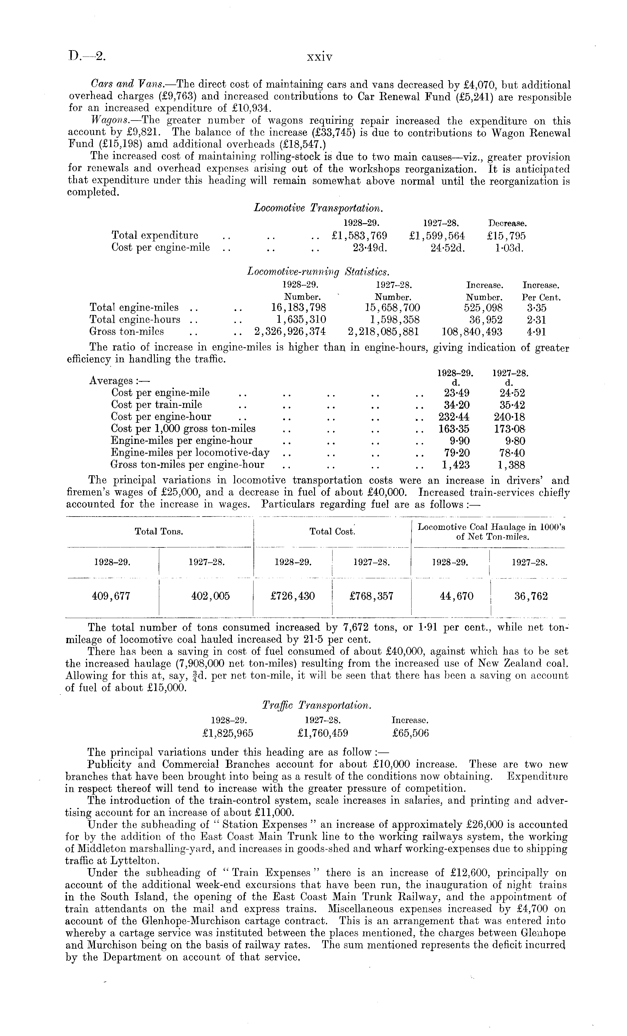 The total number of tons consumed increased by 7,672 tons, or 1-91 per cent., while net tonmileage of locomotive coal hauled increased by 21 '5 per cent. There has been a saving in cost of fuel consumed of about £40,000, against which has to be set the increased haulage (7,908,000 net ton-miles) resulting from the increased use of New Zealand coal. Allowing for this at, say, fd. per net ton-mile, it will be seen that there has been a saving on account of fuel of about £15,000. Traffic Transportation. 1928-29. 1927-28. Increase. £1,825,965 £1,760,459 £65,506 The principal variations under this heading are as follow : — Publicity and Commercial Branches account for about £10,000 increase. These are two new branches that have been brought into being as a result of the conditions now obtaining. Expenditure in respect thereof will tend to increase with the greater pressure of competition. The introduction of the train-control system, scale increases in salaries, and printing and advertising account for an increase of about £11,000. Under the subheading of " Station Expenses " an increase of approximately £26,000 is accounted for by the addition of the East Coast Main Trunk line to the working railways system, the working of Middleton marshalling-yard, and increases in goods-shed and wharf working-expenses due to shipping traffic at Lyttelton. Under the subheading of " Train Expenses " there is an increase of £12,600, principally on account of the additional week-end excursions that have been run, the inauguration of night trains in the South Island, the opening of the East Coast Main Trunk Railway, and the appointment of train attendants on the mail and express trains. Miscellaneous expenses increased by £4,700 on account of the Glenhope-Murchison cartage contract. This is an arrangement that was entered into whereby a cartage service was instituted between the places mentioned, the charges between Glenhope and Murchison being on the basis of railway rates. The sum mentioned represents the deficit incurred by the Department on account of that service,