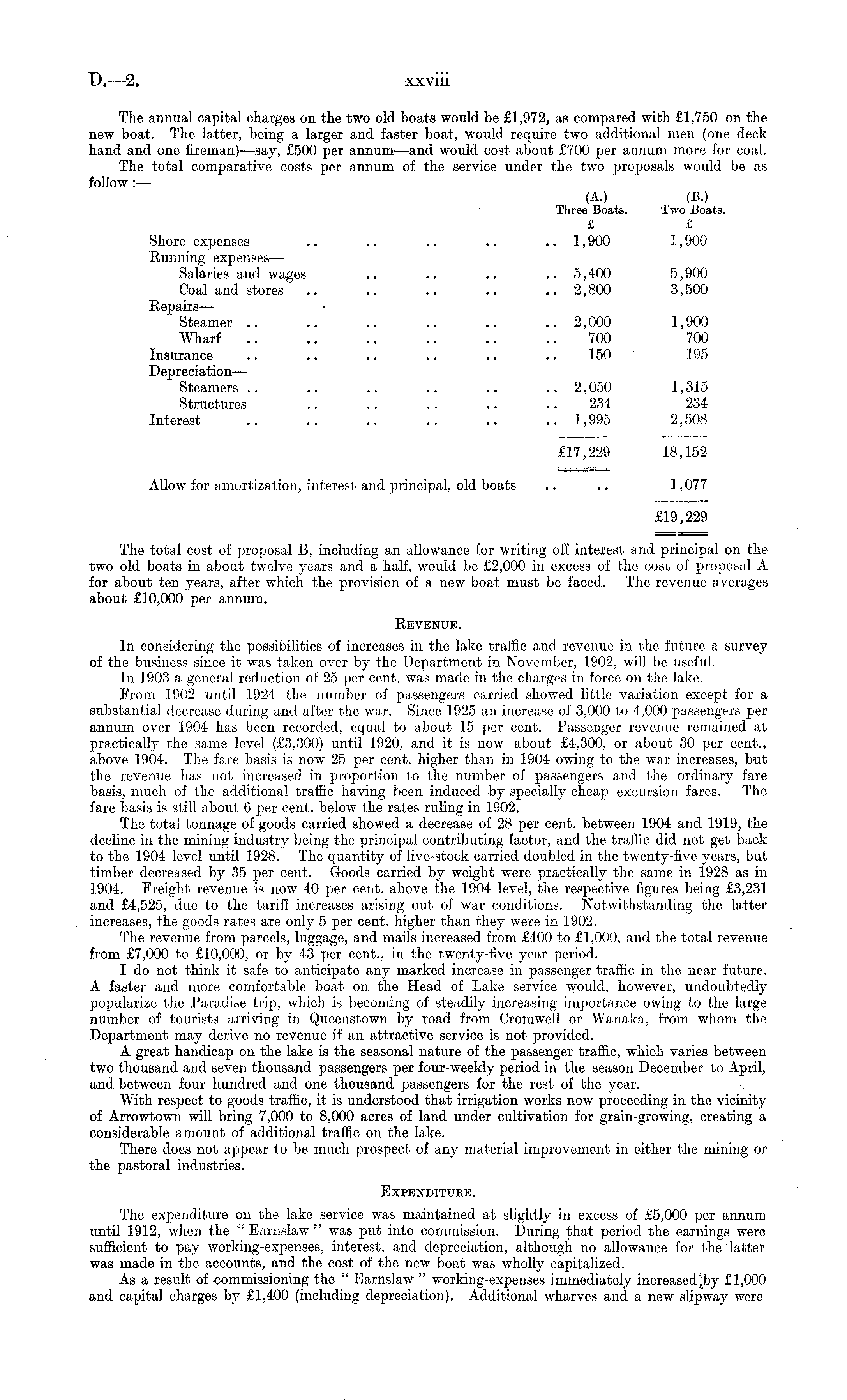The annual capital charges on the two old boats would be £1,972, as compared with £1,750 on the new boat. The latter, being a larger and faster boat, would require two additional men (one deck hand and one fireman) —say, £500 per annum—and would cost about £700 per annum more for coal. The total comparative costs per annum of the service under the two proposals would be as follow (A.) (B.) Throe Boats. Two Boats. £ £ Shore expenses .. .. .. .. .. 1,900 1,900 Running expenses — Salaries and wages .. .. .. .. 5,400 5,900 Coal and stores .. .. .. .. 2,800 3,500 Repairs — Steamer .. .. .. .. .. 2,000 1,900 Wharf .. .. .. .. .. .. 700 700 Insurance .. .. .. .. .. .. 150 195 Depreciation— Steamers .. .. .. .. .. .. 2,050 1,315 Structures .. .. .. .. .. 234 234 Interest .. .. .. .. .. 1,995 2,508 £17,229 18,152 Allow for amortization, interest and principal, old boats .. .. 1,077 £19,229 The total cost of proposal B, including an allowance for writing off interest and principal on the two old boats in about twelve years and a half, would be £2,000 in excess of the cost of proposal A for about ten years, after which the provision of a new boat must be faced. The revenue averages about £10,000 per annum. Revenue. In considering the possibilities of increases in the lake traffic and revenue in the future a survey of the business since it was taken over by the Department in November, 1902, will be useful. In 1903 a general reduction of 25 per cent, was made in the charges in force on the lake. From 1902 until 1924 the number of passengers carried showed little variation except for a substantia] decrease during and after the war. Since 1925 an increase of 3,000 to 4,000 passengers per annum over 1904 has been recorded, equal to about 15 per cent. Passenger revenue remained at practically the same level (£3,300) until 1920, and it is now about £4,300, or about 30 per cent., above 1904. The fare basis is now 25 per cent, higher than in 1904 owing to the war increases, but the revenue has not increased in proportion to the number of passengers and the ordinary fare basis, much of the additional traffic having been induced by specially cheap excursion fares. The fare basis is still about 6 per cent, below the rates ruling in 1902. The total tonnage of goods carried showed a decrease of 28 per cent, between 1904 and 1919, the decline in the mining industry being the principal contributing factor, and the traffic did not get back to the 1904 level until 1928. The quantity of live-stock carried doubled in the twenty-five years, but timber decreased by 35 per cent. Goods carried by weight were practically the same in 1928 as in 1904. Freight revenue is now 40 per cent, above the 1904 level, the respective figures being £3,231 and £4,525, due to the tariff increases arising out of war conditions. Notwithstanding the latter increases, the goods rates are only 5 per cent, higher than they were in 1902. The revenue from parcels, luggage, and mails increased from £400 to £1,000, and the total revenue from £7,000 to £10,000, or by 43 per cent., in the twenty-five year period. I do not think it safe to anticipate any marked increase in passenger traffic in the near future. A faster and more comfortable boat on the Head of Lake service would, however, undoubtedly popularize the Paradise trip, which is becoming of steadily increasing importance owing to the large number of tourists arriving in Queenstown by road from Cromwell or Wanaka, from whom the Department may derive no revenue if an attractive service is not provided. A great handicap on the lake is the seasonal nature of the passenger traffic, which varies between two thousand and seven thousand passengers per four-weekly period in the season December to April, and between four hundred and one thousand passengers for the rest of the year. With respect to goods traffic, it is understood that irrigation works now proceeding in the vicinity of Arrowtown will bring 7,000 to 8,000 acres of land under cultivation for grain-growing, creating a considerable amount of additional traffic on the lake. There does not appear to be much prospect of any material improvement in either the mining or the pastoral industries. Expenditure. The expenditure on the lake service was maintained at slightly in excess of £5,000 per annum until 1912, when the " Earnslaw " was put into commission. During that period the earnings were sufficient to pay working-expenses, interest, and depreciation, although uo allowance for the latter was made in the accounts, and the cost of the new boat was wholly capitalized. As a result of commissioning the " Earnslaw " working-expenses immediately increased 4 by £1,000 and capital charges by £1,400 (including depreciation). Additional wharves and a new slipway were