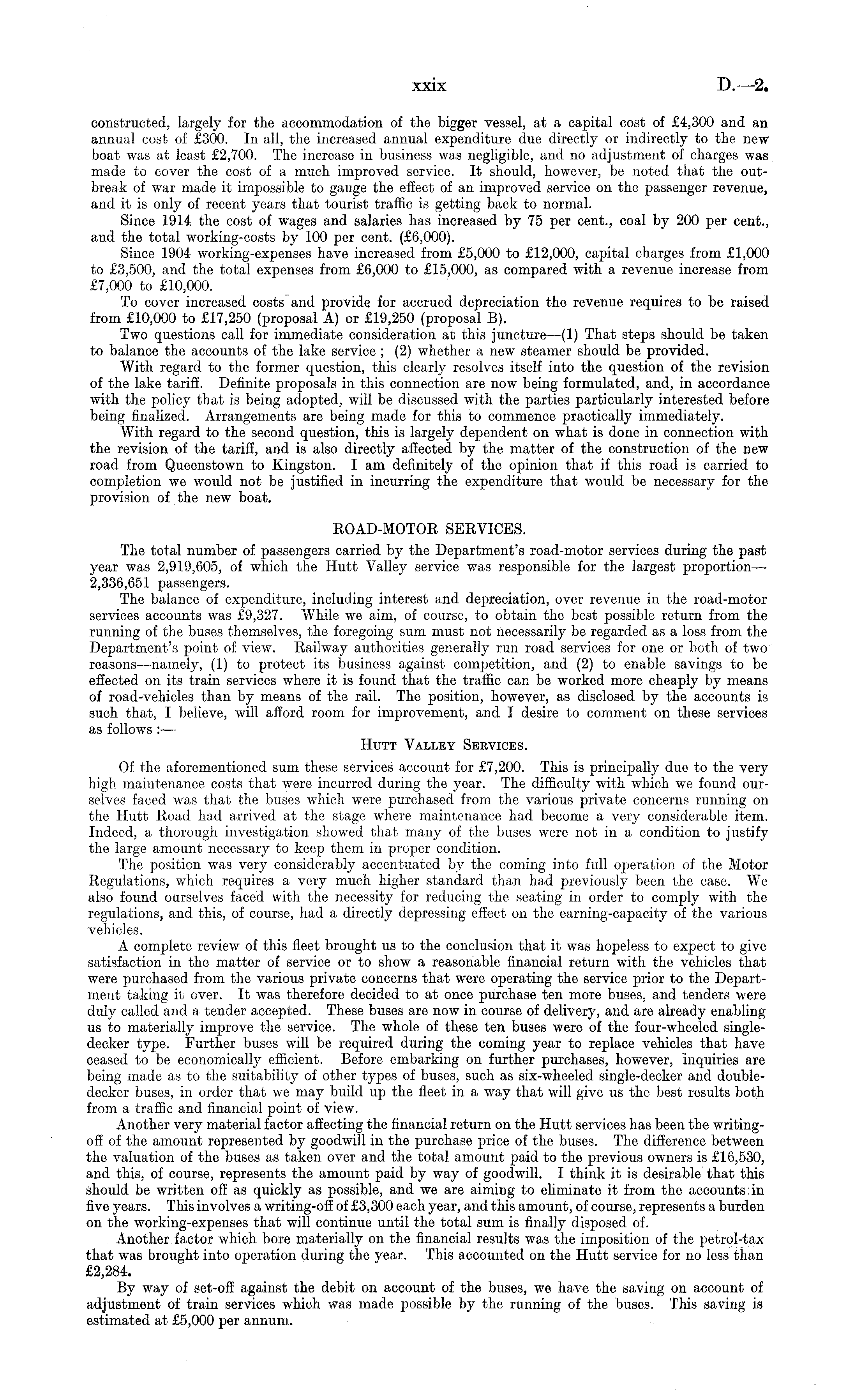 constructed, largely for the accommodation of the bigger vessel, at a capital cost of £4,300 and an annual cost of £300. In all, the increased annual expenditure due directly or indirectly to the new boat was at least £2,700. The increase in business was negligible, and no adjustment of charges was made to cover the cost of a much improved service. It should, however, be noted that the outbreak of war made it impossible to gauge the effect of an improved service on the passenger revenue, and it is only of recent years that tourist traffic is getting back to normal. Since 1914 the cost of wages and salaries has increased by 75 per cent., coal by 200 per cent., and the total working-costs by 100 per cent. (£6,000). Since 1904 working-expenses have increased from £5,000 to £12,000, capital charges from £1,000 to £3,500, and the total expenses from £6,000 to £15,000, as compared with a revenue increase from £7,000 to £10,000. To cover increased costs and provide for accrued depreciation the revenue requires to be raised from £10,000 to £17,250 (proposal A) or £19,250 (proposal B). Two questions call for immediate consideration at this juncture —(1) That steps should be taken to balance the accounts of the lake service ; (2) whether a new steamer should be provided. With regard to the former question, this clearly resolves itself into the question of the revision of the lake tariff. Definite proposals in this connection are now being formulated, and, in accordance with the policy that is being adopted, will be discussed with the parties particularly interested before being finalized. Arrangements are being made for this to commence practically immediately. With regard to the second question, this is largely dependent on what is done in connection with the revision of the tariff, and is also directly affected by the matter of the construction of the new road from Queenstown to Kingston. I am definitely of the opinion that if this road is carried to completion we would not be justified in incurring the expenditure that would be necessary for the provision of the new boat. ROAD-MOTOR SERVICES. The total number of passengers carried by the Department's road-motor services during the past year was 2,919,605, of which the Hutt Valley service was responsible for the largest proportion— 2,336,651 passengers. The balance of expenditure, including interest and depreciation, over revenue in the road-motor services accounts was £9,327. While we aim, of course, to obtain the best possible return from the running of the buses themselves, the foregoing sum must not necessarily be regarded as a loss from the Department's point of view. Railway authorities generally run road services for one or both of two reasons —namely, (1) to protect its business against competition, and (2) to enable savings to be effected on its train services where it is found that the traffic can be worked more cheaply by means of road-vehicles than by means of the rail. The position, however, as disclosed by the accounts is such that, I believe, will afford room for improvement, and I desire to comment on these services as follows :— Hutt Valley Services. Of the aforementioned sum these services account for £7,200. This is principally due to the very high maintenance costs that were incurred during the year. The difficulty with which we found ourselves faced was that the buses which were purchased from the various private concerns running on the Hutt Road had arrived at the stage where maintenance had become a very considerable item. Indeed, a thorough investigation showed that many of the buses were not in a condition to justify the large amount necessary to keep them in proper condition. The position was very considerably accentuated by the coming into full operation of the Motor Regulations, which requires a very much higher standard than had previously been the case. We also found ourselves faced with the necessity for reducing the seating in order to comply with the regulations, and this, of course, had a directly depressing effect on the earning-capacity of the various vehicles. A complete review of this fleet brought us to the conclusion that it was hopeless to expect to give satisfaction in the matter of service or to show a reasonable financial return with the vehicles that were purchased from the various private concerns that were operating the service prior to the Department taking it over. It was therefore decided to at once purchase ten more buses, and tenders were duly called and a tender accepted. These buses are now in course of delivery, and are already enabling us to materially improve the service. The whole of these ten buses were of the four-wheeled singledecker type. Further buses will be required during the coming year to replace vehicles that have ceased to be economically efficient. Before embarking on further purchases, however, inquiries are being made as to the suitability of other types of buses, such as six-wheeled single-decker and doubledecker buses, in order that we may build up the fleet in a way that will give us the best results both from a traffic and financial point of view. Another very material factor affecting the financial return on the Hutt services has been the writingoff of the amount represented by goodwill in the purchase price of the buses. The difference between the valuation of the buses as taken over and the total amount paid to the previous owners is £16,530, and this, of course, represents the amount paid by way of goodwill. I think it is desirable that this should be written off as quickly as possible, and we are aiming to eliminate it from the accounts:in five years. This involves a writing-off of £3,300 each year, and this amount, of course, represents a burden on the working-expenses that will continue until the total sum is finally disposed of. Another factor which bore materially on the financial results was the imposition of the petrol-tax that was 