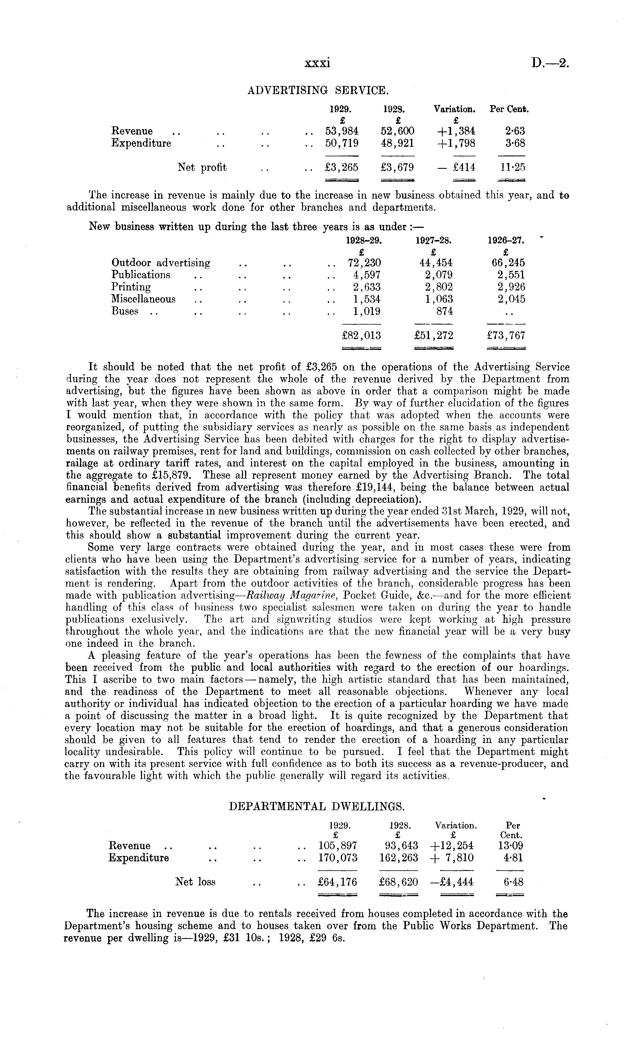 ADVERTISING SERVICE. 1929. 1925. Variation. Per Cent. £ £ £ Revenue .. .. .. .. 53,984 52,600 +1,384 2-63 Expenditure .. .. .. 50,719 48,921 +1,798 3-68 Net profit .. .. £3,265 £3,679 -£414 11*25 The increase in revenue is mainly due to the increase in new business obtained this year, and to additional miscellaneous work done for other branches and departments. New business written up during the last three years is as under : — 1928-29. 1927-28. 1926-27. * £ £ £ Outdoor advertising .. .. .. 72,230 44,454 66,245 Publications .. .. .. .. 4,597 2,079 2,551 Printing .. .. .. .. 2,633 2,802 2,926 Miscellaneous .. .. .. .. 1,534 1,063 2,045 Buses .. .. .. .. .. 1,019 874 £82,013 £51,272 £73,767 It should be noted that the net profit of £3,265 on the operations of the Advertising Service during the year does not represent the whole of the revenue derived by the Department from advertising, but the figures have been shown as above in order that a comparison might be made with last year, when they were shown in the same form. By way of further elucidation of the figures I would mention that, in accordance with the policy that was adopted when the accounts were reorganized, of putting the subsidiary services as nearly as possible on the same basis as independent businesses, the Advertising Service has been debited with charges for the right to display advertisements on railway premises, rent for land and buildings, commission on cash collected by other branches, railage at ordinary tariff rates, and interest on the capital employed in the business, amounting in the aggregate to £15,879. These all represent money earned by the Advertising Branch. The total financial benefits derived from advertising was therefore £19,144, being the balance between actual earnings and actual expenditure of the branch (including depreciation). The substantial increase in new business written up during the year ended 31st March, 1929, will not, however, be reflected in the revenue of the branch until the advertisements have been erected, and this should show a substantial improvement during the current year. Some very large contracts were obtained during the year, and in most cases these were from clients who have been using the Department's advertising service for a number of years, indicating satisfaction with the results they are obtaining from railway advertising and the service the Department is rendering. Apart from the outdoor activities of the branch, considerable progress has been made with publication advertising—Railway Magazine, Pocket Guide, &c. —and for the more efficient handling of this class of business two specialist salesmen were taken on during the year to handle publications exclusively. The art and signwriting studios were kept working at high pressure throughout the whole year, and the indications are that the new financial year will be a very busy one indeed in the branch. A pleasing feature of the year's operations has been the fewness of the complaints that have been received from the public and local authorities with regard to the erection of our hoardings. This I ascribe to two main factors — namely, the high artistic standard that has been maintained, and the readiness of the Department to meet all reasonable objections. Whenever any local authority or individual has indicated objection to the erection of a particular hoarding we have made a point of discussing the matter in a broad light. It is quite recognized by the Department that every location may not be suitable for the erection of hoardings, and that a generous consideration should be given to all features that tend to render the erection of a hoarding in any particular locality undesirable. This policy will continue to be pursued. I feel that the Department might carry on with its present service with full confidence as to both its success as a revenue-producer, and the favourable light with which the public gene Tally will regard its activities. DEPARTMENTAL DWELLINGS. 1929. 1928. Variation. Per £ £ £ Cent. Revenue .. .. .. ..105,897 93,643 +12,254 13-09 Expenditure .. .. .. 170,073 162,263 + 7,810 4-81 Net loss .. .. £64,176 £68,620 -£4,444 6-48 The increase in revenue is due to rentals received from houses completed in accordance with the Department's housing scheme and to houses taken over from the Public Works Department. The revenue per dwelling is—1929, £31 10s.; 1928, £29 6s.