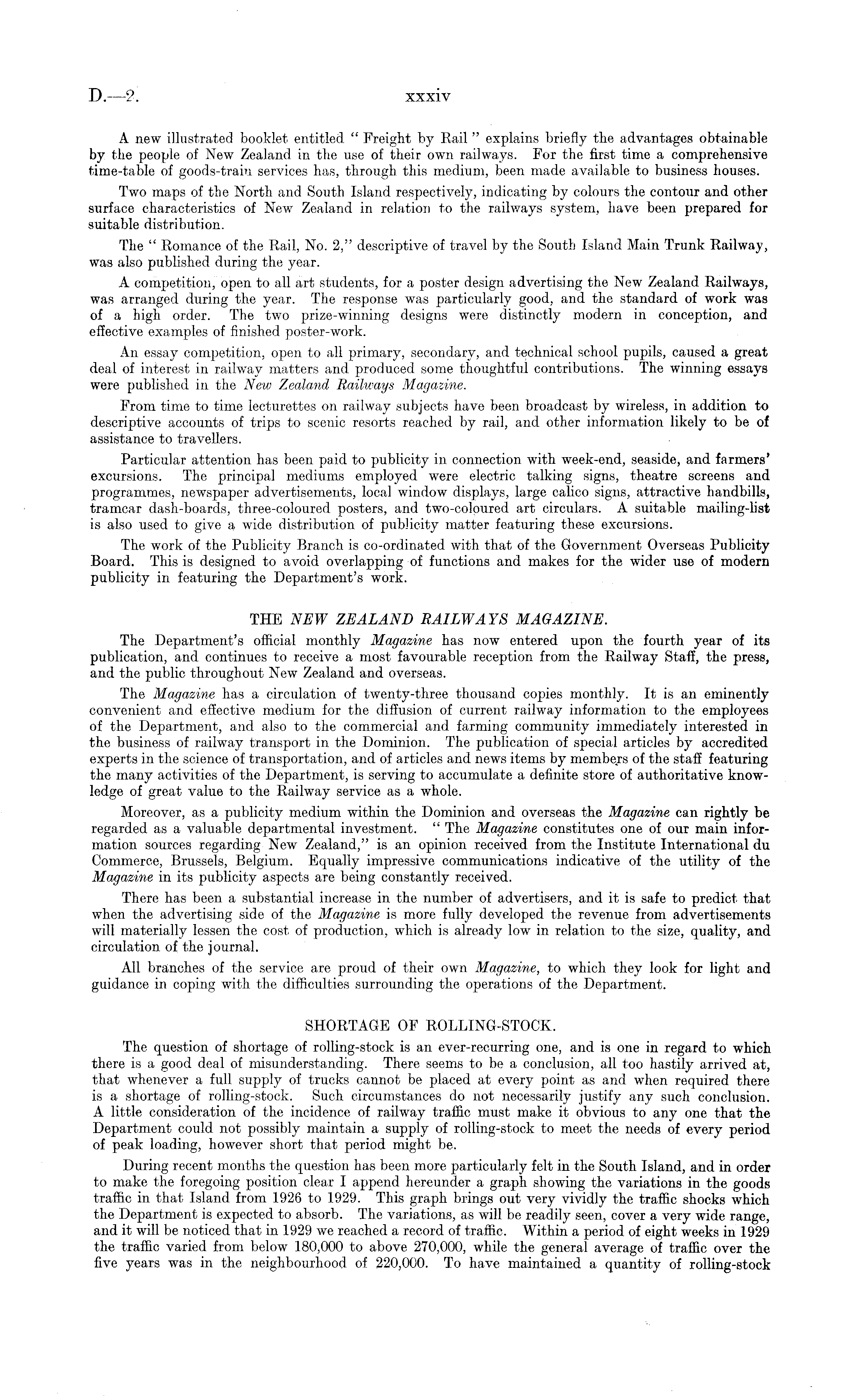 A new illustrated booklet entitled. " Freight by Rail " explains briefly the advantages obtainable by the people of New Zealand in the use of their own railways. For the first time a comprehensive time-table of goods-train services has, through this medium, been made available to business houses. Two maps of the North and South Island respectively, indicating by colours the contour and other surface characteristics of New Zealand in relation to the railways system, have been prepared for suitable distribution. The " Romance of the Rail, No. 2," descriptive of travel by the South Island Main Trunk Railway, was also published during the year. A competition, open to all art students, for a poster design advertising the New Zealand Railways, was arranged during the year. The response was particularly good, and the standard of work was of a high order. The two prize-winning designs were distinctly modern in conception, and effective examples of finished poster-work. An essay competition, open to all primary, secondary, and technical school pupils, caused a great deal of interest in railway matters and produced some thoughtful contributions. The winning essays were published in the New Zealand Railivays Magazine. From time to time lecturettes on railway subjects have been broadcast by wireless, in addition to descriptive accounts of trips to scenic resorts reached by rail, and other information likely to be of assistance to travellers. Particular attention has been paid to publicity in connection with week-end, seaside, and farmers' excursions. The principal mediums employed were electric talking signs, theatre screens and programmes, newspaper advertisements, local window displays, large calico signs, attractive handbills, tramcar dash-boards, three-coloured posters, and two-coloured art circulars. A suitable mailing-list is also used to give a wide distribution of publicity matter featuring these excursions. The work of the Publicity Branch is co-ordinated with that of the Government Overseas Publicity Board. This is designed to avoid overlapping of functions and makes for the wider use of modern publicity in featuring the Department's work. THE NEW ZEALAND RAILWAYS MAGAZINE. The Department's official monthly Magazine has now entered upon the fourth year of its publication, and continues to receive a most favourable reception from the Railway Staff, the press, and the public throughout New Zealand and overseas. The Magazine has a circulation of twenty-three thousand copies monthly. It is an eminently convenient and effective medium for the diffusion of current railway information to the employees of the Department, and also to the commercial and farming community immediately interested in the business of railway transport in the Dominion. The publication of special articles by accredited experts in the science of transportation, and of articles and news items by members of the staff featuring the many activities of the Department, is serving to accumulate a definite store of authoritative knowledge of great value to the Railway service as a whole. Moreover, as a publicity medium within the Dominion and overseas the Magazine can rightly be regarded as a valuable departmental investment. " The Magazine constitutes one of our main information sources regarding New Zealand," is an opinion received from the Institute International du Commerce, Brussels, Belgium. Equally impressive communications indicative of the utility of the Magazine in its publicity aspects are being constantly received. There has been a substantial increase in the number of advertisers, and it is safe to predict that when the advertising side of the Magazine is more fully developed the revenue from advertisements will materially lessen the cost of production, which is already low in relation to the size, quality, and circulation of the journal. All branches of the service are proud of their own Magazine, to which they look for light and guidance in coping with the difficulties surrounding the operations of the Department. SHORTAGE OF ROLLING-STOCK. The question of shortage of rolling-stock is an ever-recurring one, and is one in regard to which there is a good deal of misunderstanding. There seems to be a conclusion, all too hastily arrived at, that whenever a full supply of trucks cannot be placed at every point as and when required there is a shortage of rolling-stock. Such circumstances do not necessarily justify any such conclusion. A little consideration of the incidence of railway traffic must make it obvious to any one that the Department could not possibly maintain a supply of rolling-stock to meet the needs of every period of peak loading, however short that period might be. During recent months the question has been more particularly felt in the South Island, and in order to make the foregoing position clear I append hereunder a graph showing the variations in the goods traffic in that Island from 1926 to 1929. This graph brings out very vividly the traffic shocks which the Department is expected to absorb. The variations, as will be readily seen, cover a very wide range, and it will be noticed that in 1929 we reached a record of traffic. Within a period of eight weeks in 1929 the traffic varied from below 180,000 to above 270,000, while the general average of traffic over the five years was in the neighbourhood of 220,000. To have maintained a quantity of rolling-stock