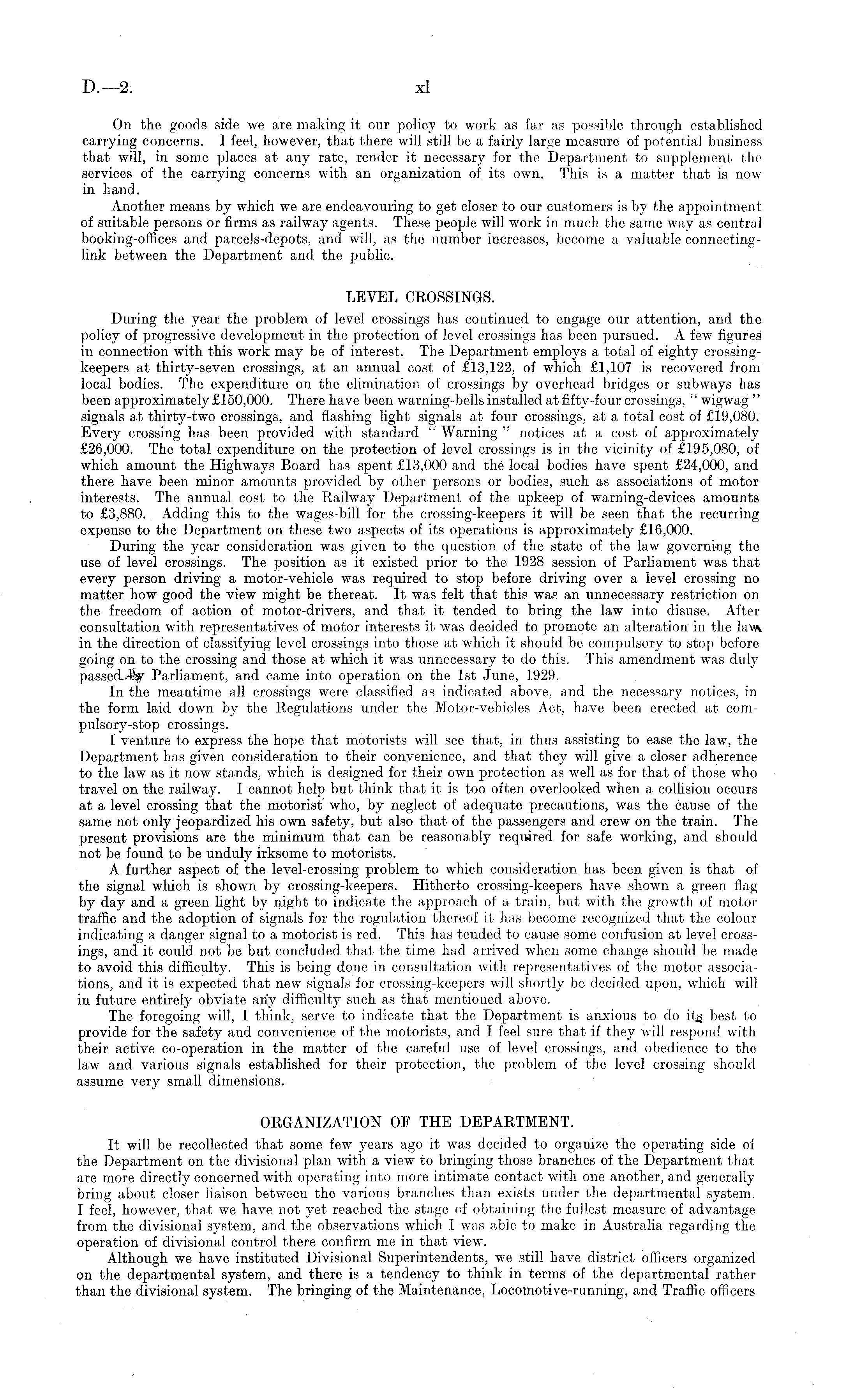 On the goods side we are making it our policy to work as far as possible through established carrying concerns. I feel, however, that there will still be a fairly large measure of potential business that will, in some places at any rate, render it necessary for the Department to supplement the services of the carrying concerns with an organization of its own. This is a matter that is now in hand. Another means by which we are endeavouring to get closer to our customers is by the appointment of suitable persons or firms as railway agents. These people will work in much the same way as central booking-offices and parcels-depots, and will, as the number increases, become a valuable connectinglink between the Department and the public. LEVEL CROSSINGS. During the year the problem of level crossings has continued to engage our attention, and the policy of progressive development in the protection of level crossings has been pursued. A few figures in connection with this work may be of interest. The Department employs a total of eighty crossingkeepers at thirty-seven crossings, at an annual cost of £13,122. of which £1,107 is recovered from local bodies. The expenditure on the elimination of crossings by overhead bridges or subways has been approximately £150,000. There have been warning-bells installed at fifty-four crossings, " wigwag " signals at thirty-two crossings, and flashing light signals at four crossings, at a total cost of £19,080. Every crossing has been provided with standard " AVarning " notices at a cost of approximately £26,000. The total expenditure on the protection of level crossings is in the vicinity of £195,080, of which amount the Highways Board has spent £13,000 and the local bodies have spent £24,000, and there have been minor amounts provided by other persons or bodies, such as associations of motor interests. The annual cost to the Railway Department of the upkeep of warning-devices amounts to £3,880. Adding this to the wages-bill for the crossing-keepers it will be seen that the recurring expense to the Department on these two aspects of its operations is approximately £16,000. During the year consideration was given to the question of the state of the law governing the use of level crossings. The position as it existed prior to the 1928 session of Parliament was that every person driving a motor-vehicle was required to stop before driving over a level crossing no matter how good the view might be thereat. It was felt that this was an unnecessary restriction on the freedom of action of motor-drivers, and that it tended to bring the law into disuse. After consultation with representatives of motor interests it was decided to promote an alteration' in the lam in the direction of classifying level crossings into those at which it should be compulsory to stop before going on to the crossing and those at which it was unnecessary to do this. This amendment was duly passecLJlf Parliament, and came into operation on the Ist June, 1929. In the meantime all crossings were classified as indicated above, and the necessary notices, in the form laid down by the Regulations under the Motor-vehicles Act, have been erected at com-pulsory-stop crossings. I venture to express the hope that motorists will see that, in thus assisting to ease the law, the Department has given consideration to their convenience, and that they will give a closer adherence to the law as it now stands, which is designed for their own protection as well as for that of those who travel on the railway. I cannot help but think that it is too often overlooked when a collision occurs at a level crossing that the motorist who, by neglect of adequate precautions, was the cause of the same not only jeopardized his own safety, but also that of the passengers and crew on the train. The present provisions are the minimum that can be reasonably required for safe working, and should not be found to be unduly irksome to motorists. A further aspect of the level-crossing problem to which consideration has been given is that of the signal which is shown by crossing-keepers. Hitherto crossing-keepers have shown a green flag by day and a green light by night to indicate the approach of a train, but with the growth of motor traffic and the adoption of signals for the regulation thereof it has become recognized that the colour indicating a danger signal to a motorist is red. This has tended to cause some confusion at level crossings, and it could not be but concluded that the time had arrived when some change should be made to avoid this difficulty. This is being done in consultation with representatives of the motor associations, and it is expected that new signals for crossing-keepers will shortly be decided upon, which will in future entirely obviate any difficulty such as that mentioned above. The foregoing will, I think, serve to indicate that the Department is anxious to do its best to provide for the safety and convenience of the motorists, and I feel sure that if they will respond with their active co-operation in the matter of the careful use of level crossings, and obedience to the law and various signals established for their protection, the problem of the level crossing should assume very small dimensions. ORGANIZATION OF THE DEPARTMENT. It will be recollected that some few years ago it was decided to organize the operating side of the Department on the divisional plan with a view to bringing those branches of the Department that are more directly concerned with operating into more intimate contact with one another, and generally bring about closer liaison between the various branches than exists under the departmental system. I feel, however, that we have not yet reached the stage of obtaining the fullest measure of advantage from the divisional system, and the observations which I was able to make in Australia regarding the operation of divisional control there confirm me in that view. Although we have in